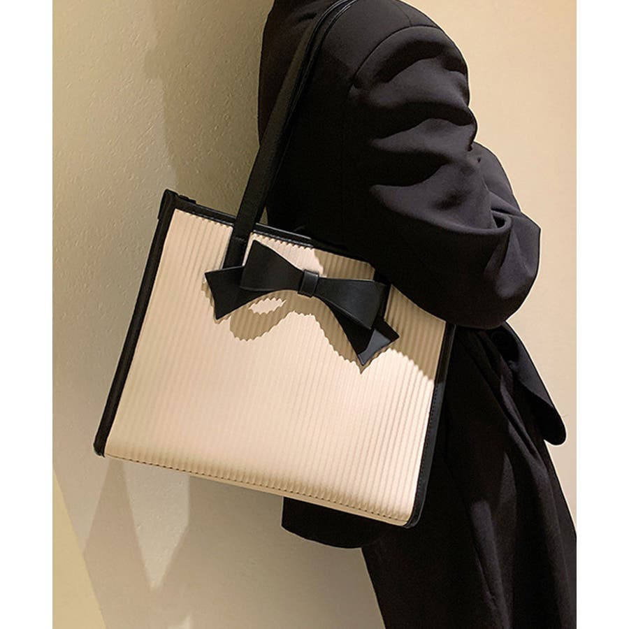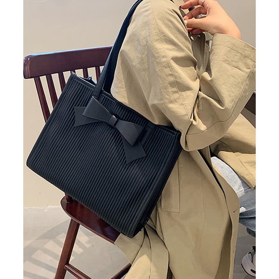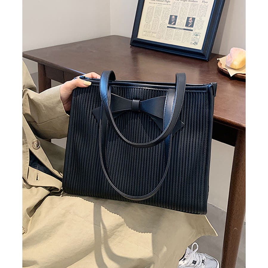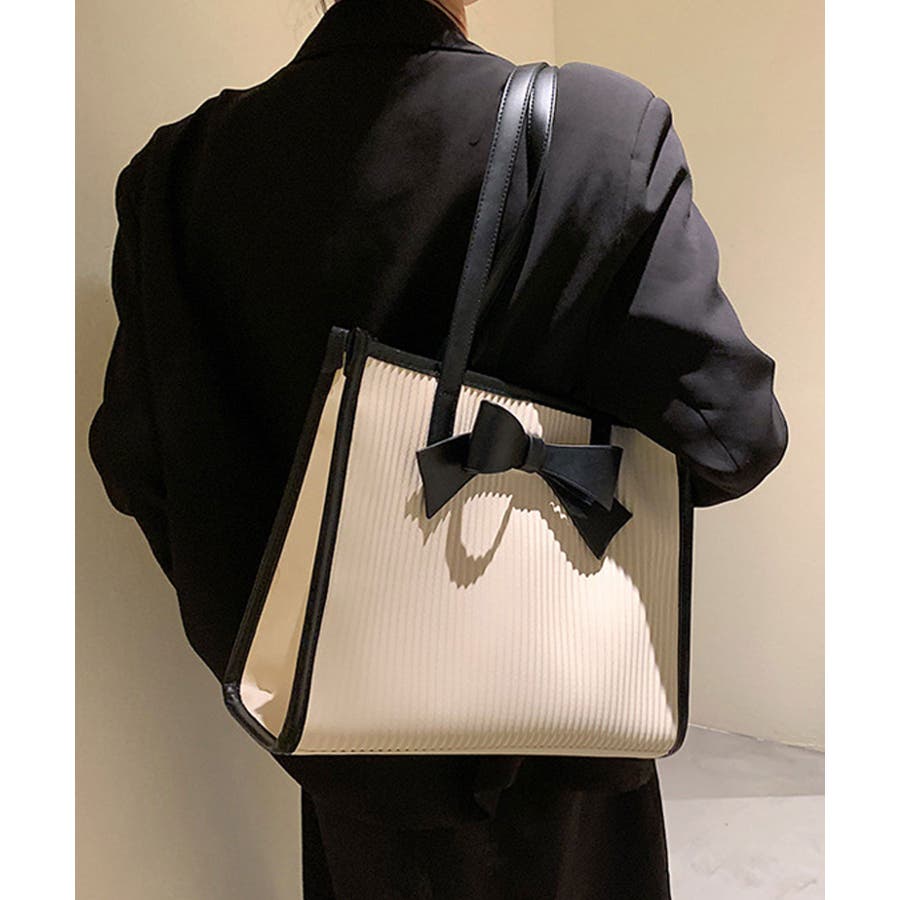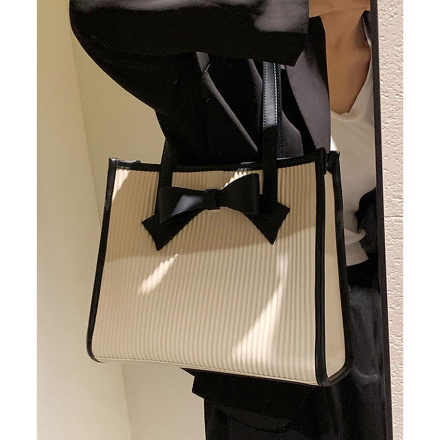 凹凸感のあるフェイクプリーツ素材に、大きめリボンをあしらった大人かわいいトートバッグ。