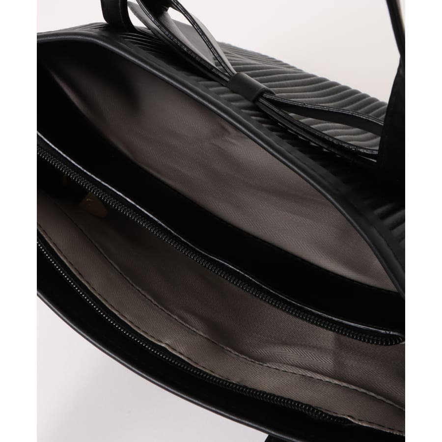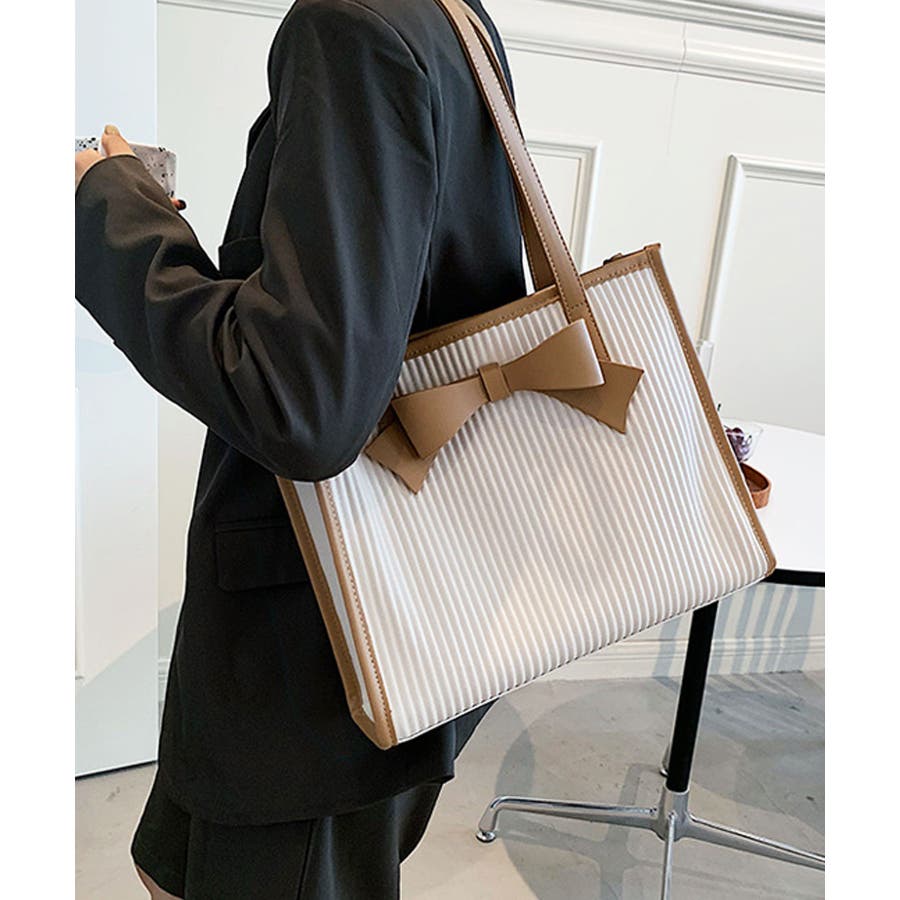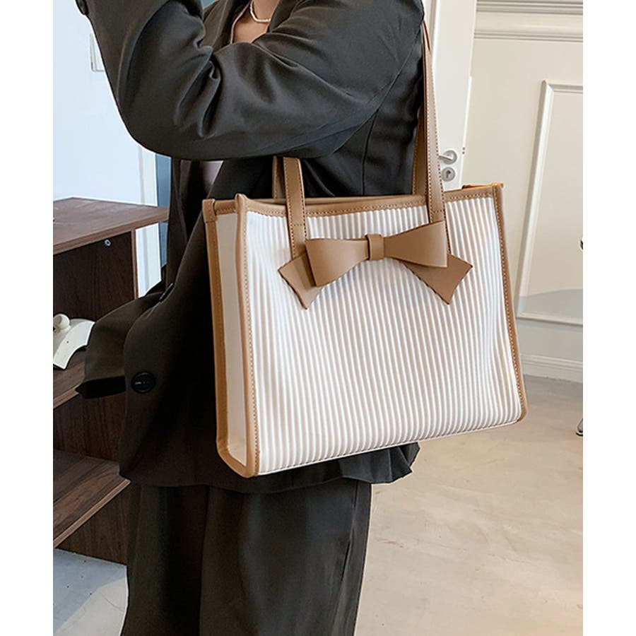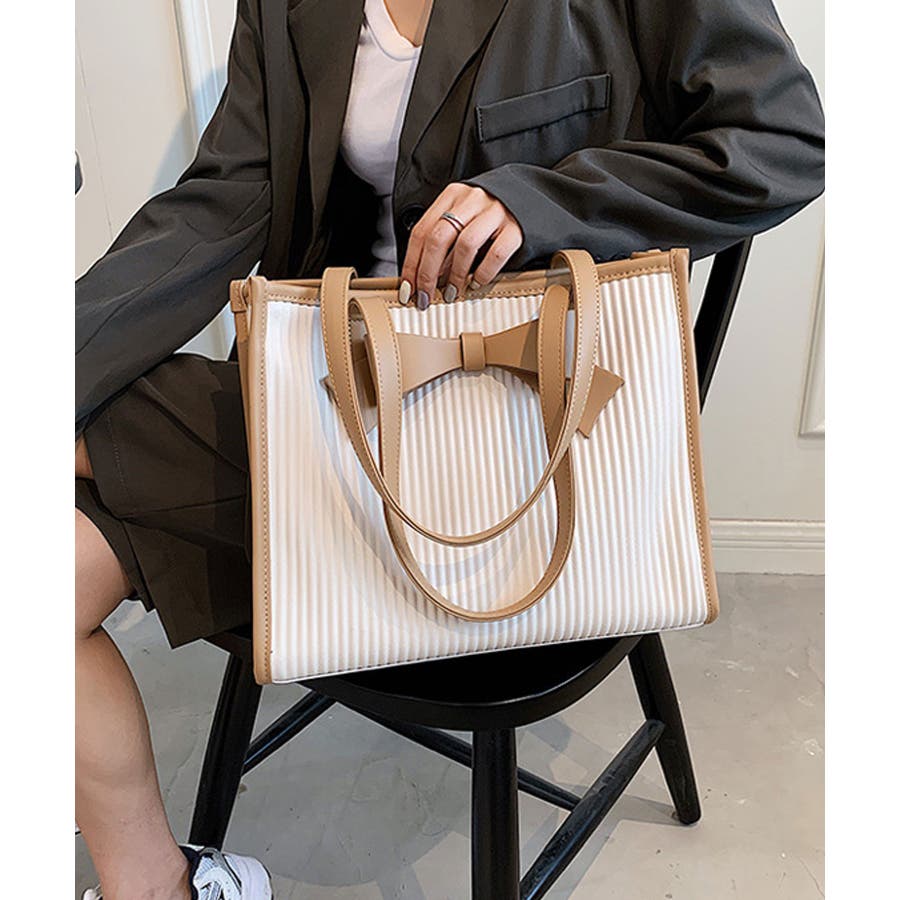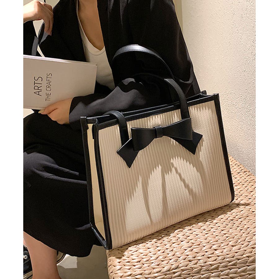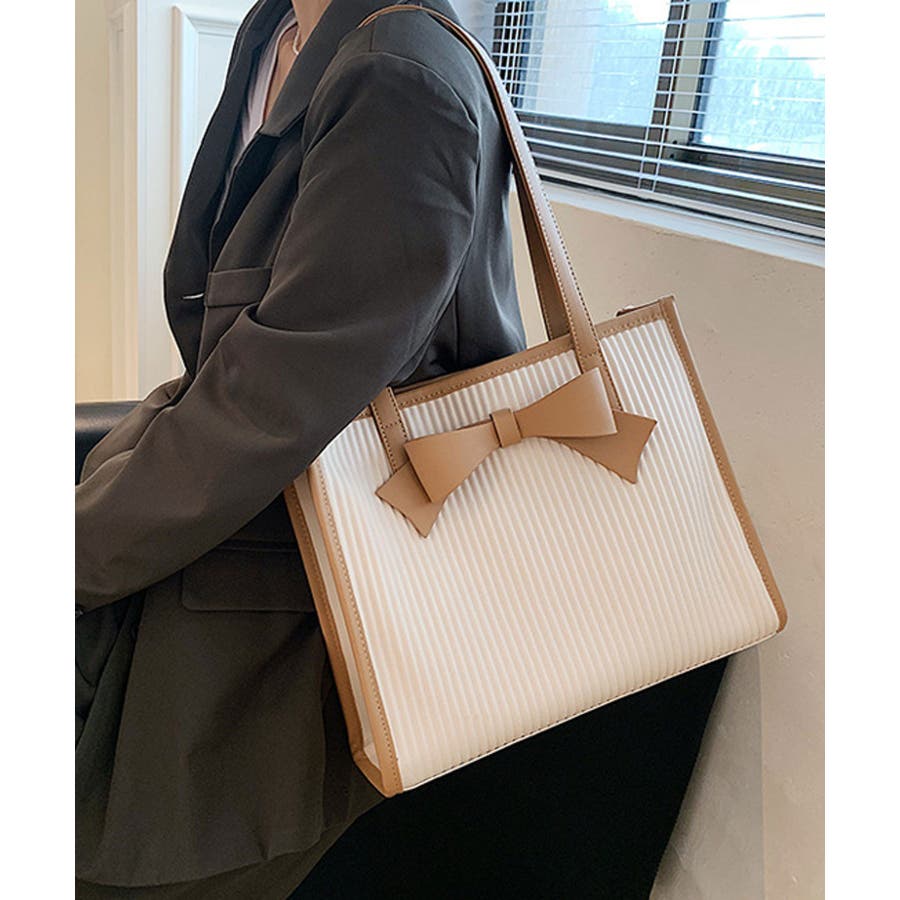 凹凸感のあるフェイクプリーツ素材に、大きめリボンをあしらった大人かわいいトートバッグ。