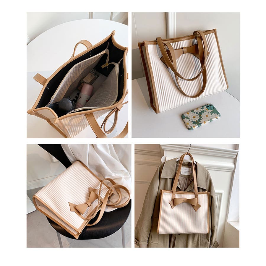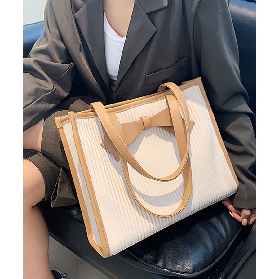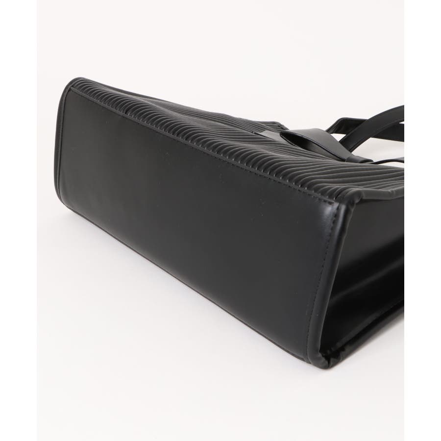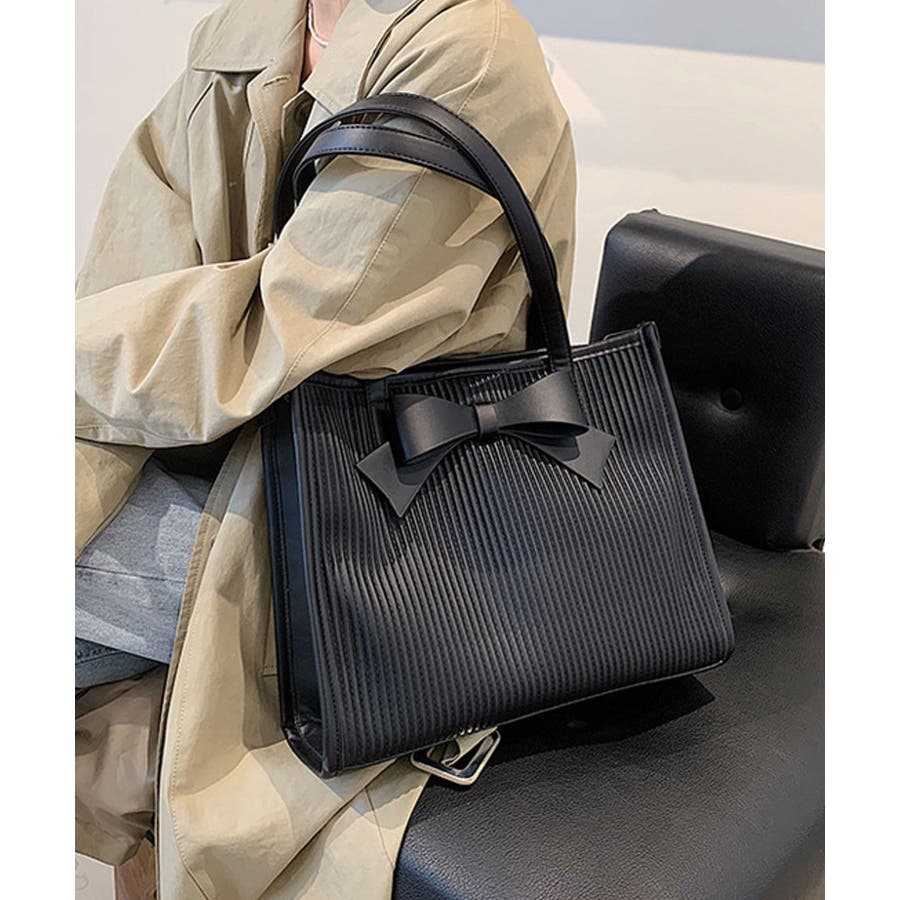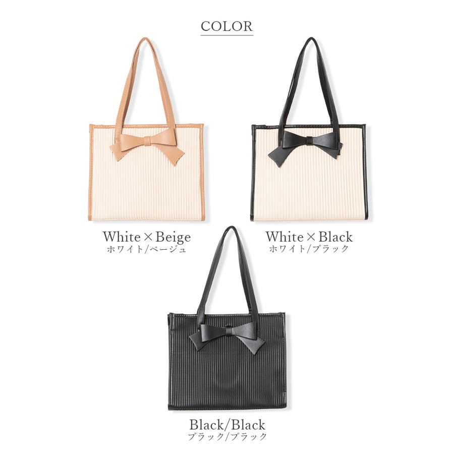 凹凸感のあるフェイクプリーツ素材に、大きめリボンをあしらった大人かわいいトートバッグ。
