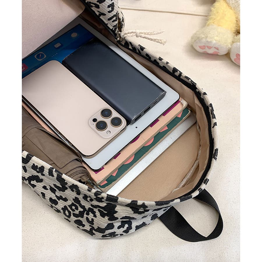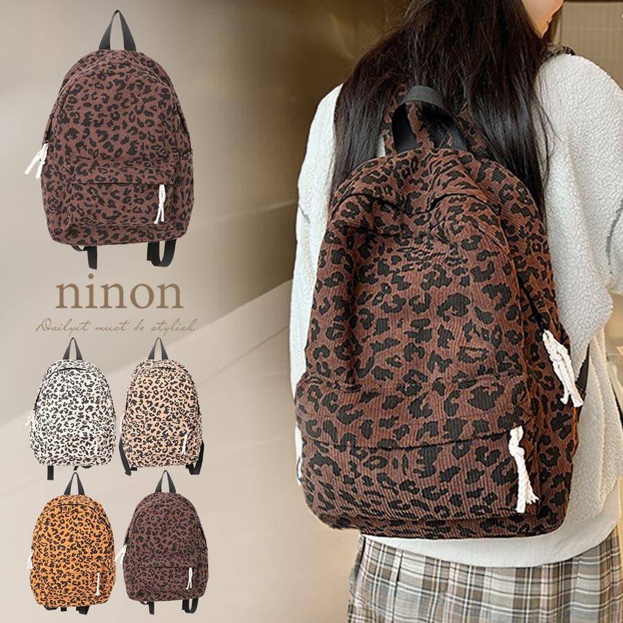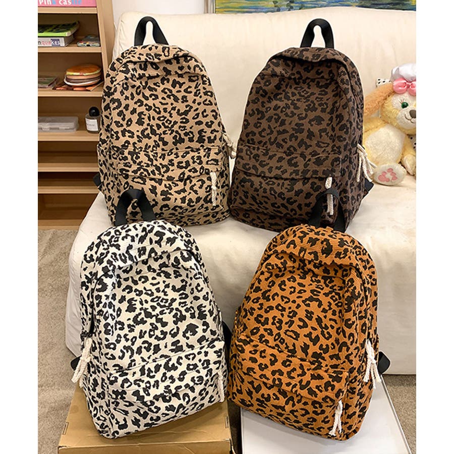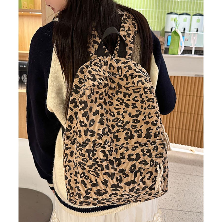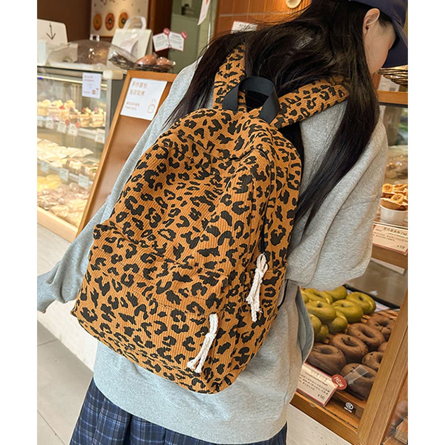 秋冬気分を後押しするコーデュロイ生地に、今季トレンドのヒョウ柄をプリントしたおしゃれなデザインリュック。