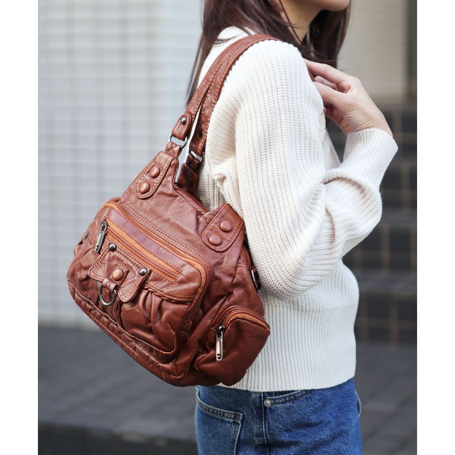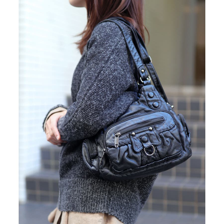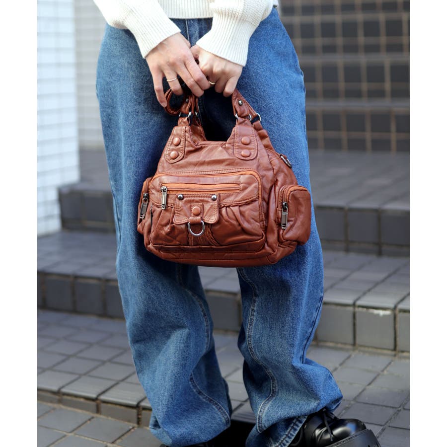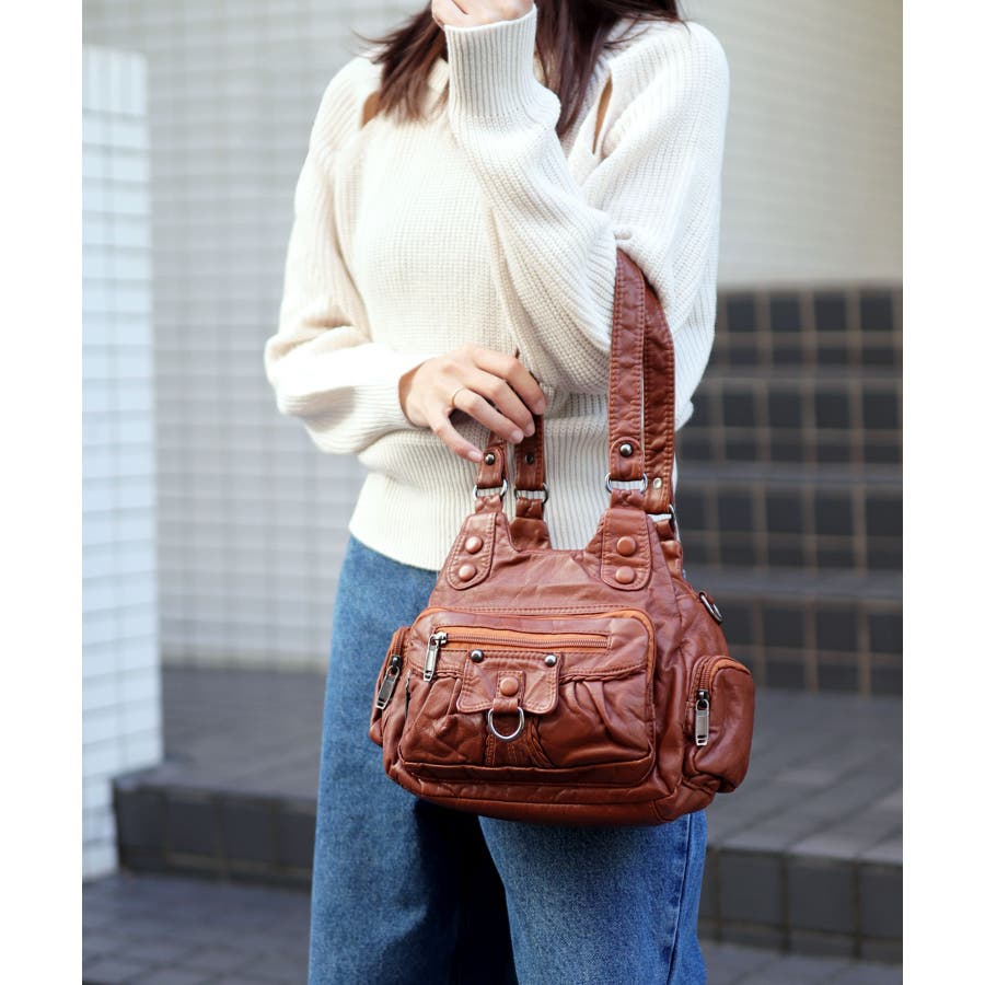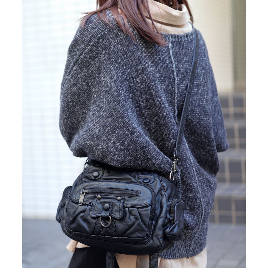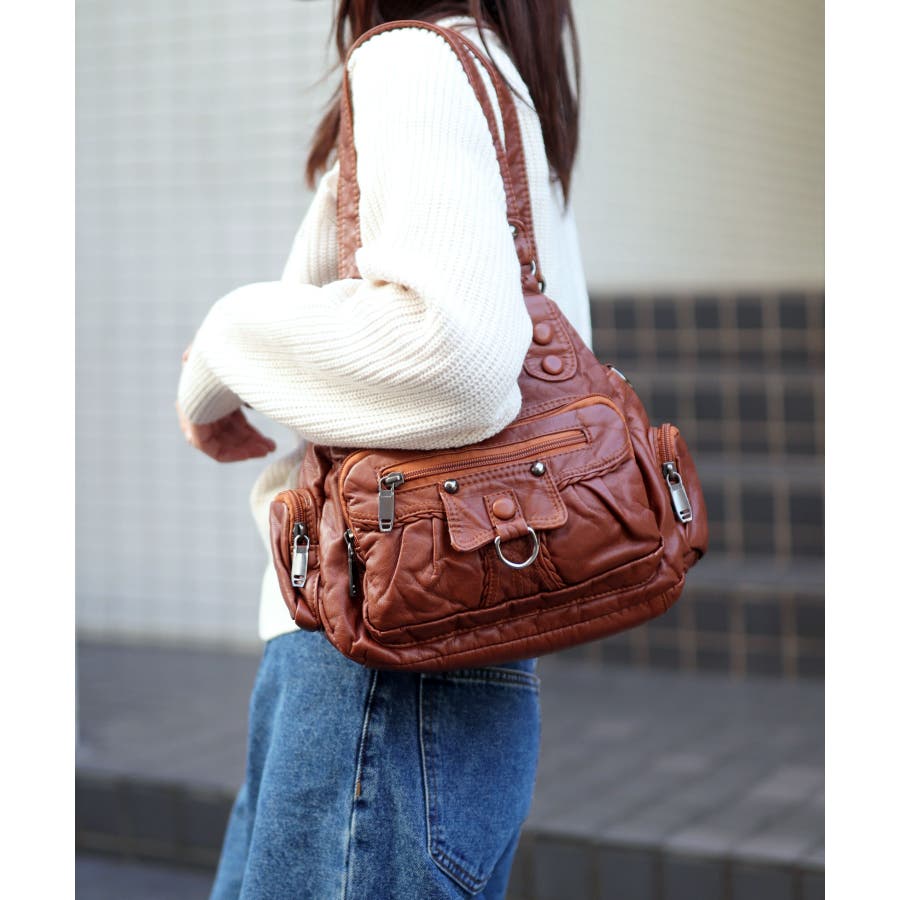 しっとり柔らかなワッシャーPUレザーを使用し、くるみボタンやファスナーポケットをあしらったレトロかわいいショルダーバッグ。