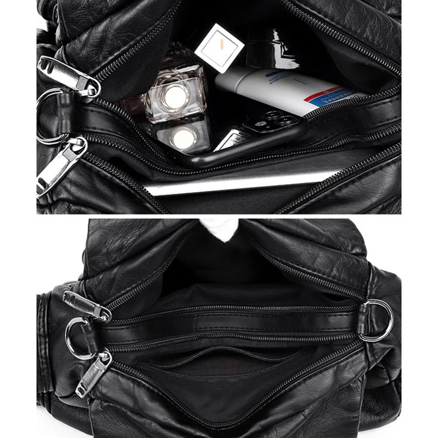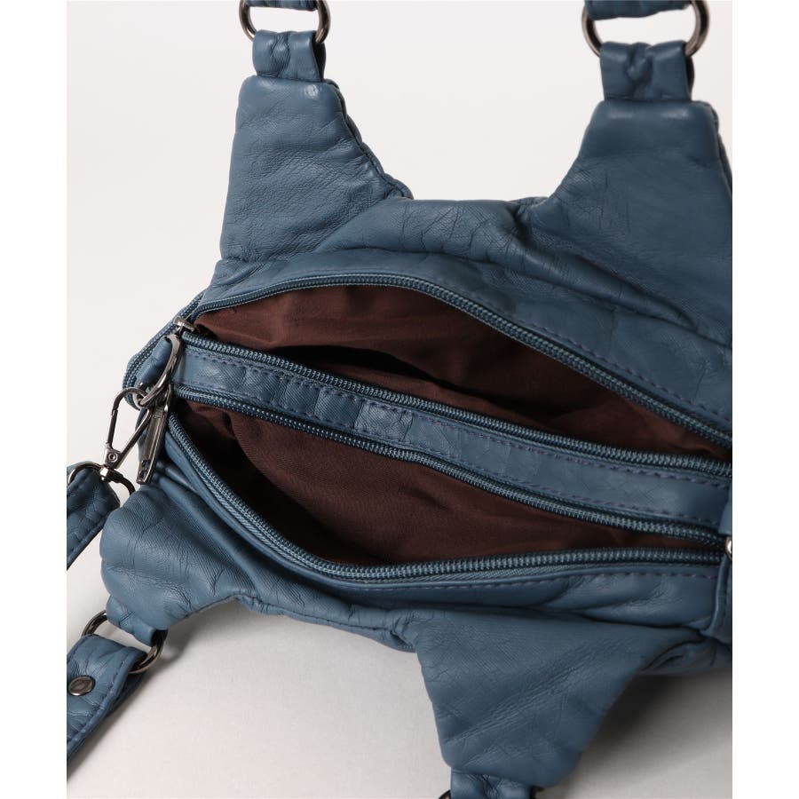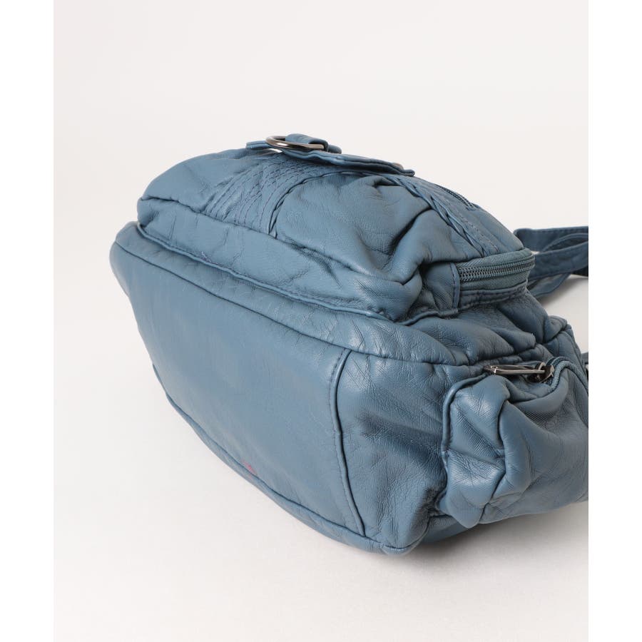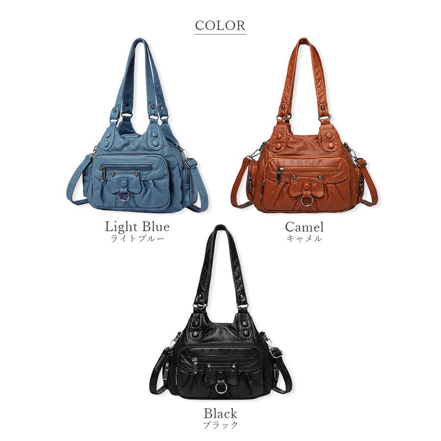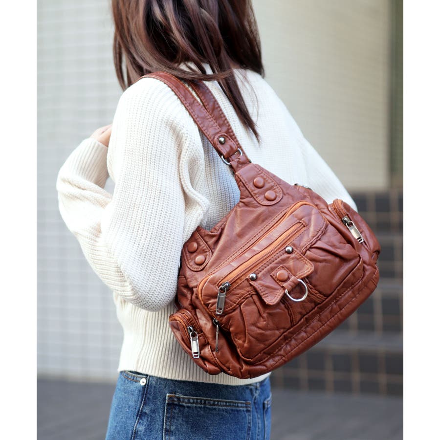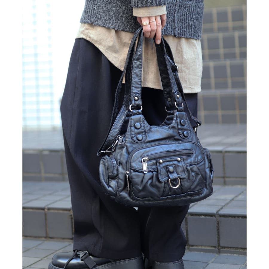 しっとり柔らかなワッシャーPUレザーを使用し、くるみボタンやファスナーポケットをあしらったレトロかわいいショルダーバッグ。