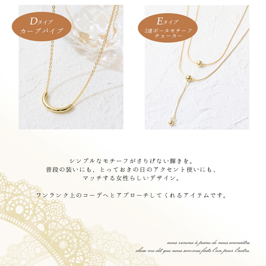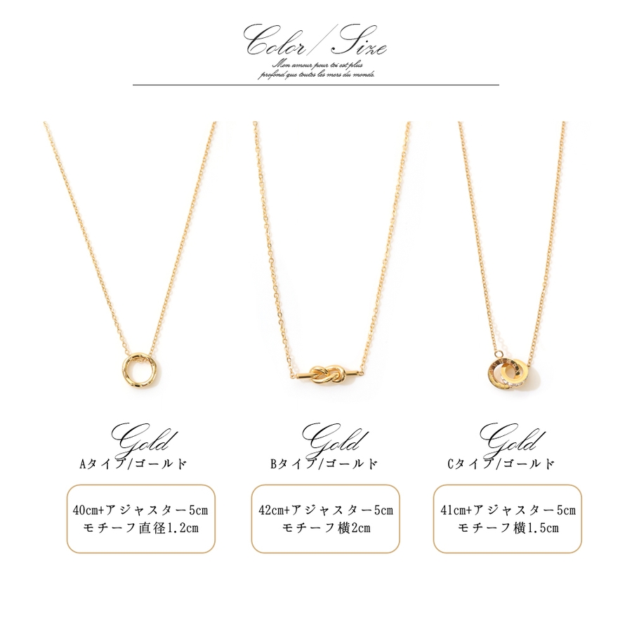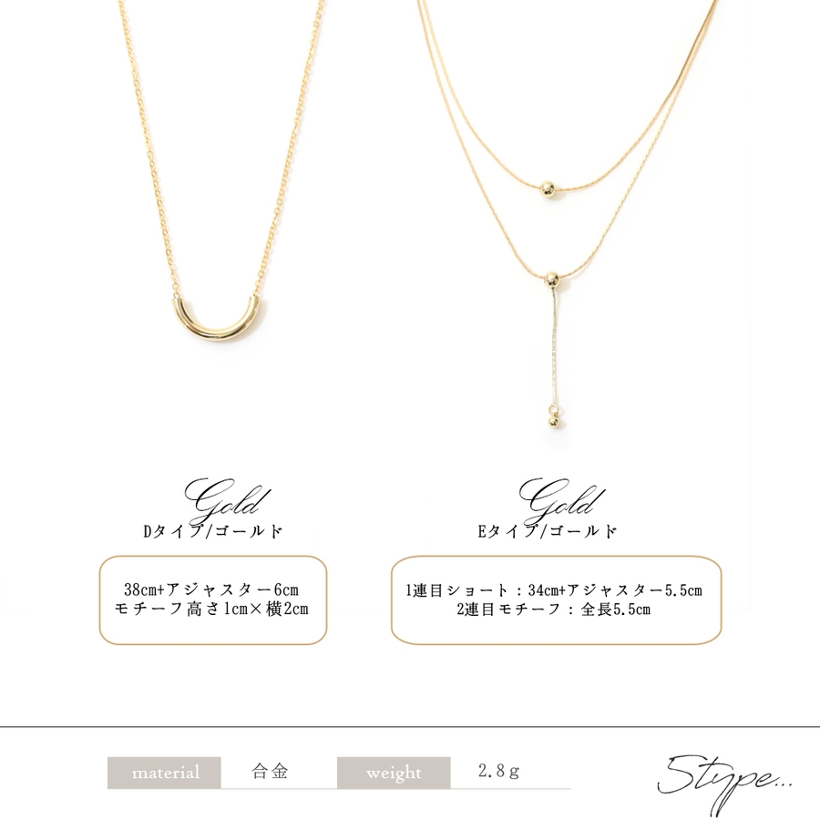 サイズ:【A】40cm+アジャスター5cm/モチーフ直径1.2cm【B】42cm+アジャスター5cm/モチーフ横2cm【C】41cm+アジャスター5cm/モチーフ横1.5cm【D】38cm+アジャスター6cm/モチーフ高さ1cm×横2cm【E】(1連目ショート)34cm+アジャスター5.5cm(2連目モチーフ)全長5.5cm