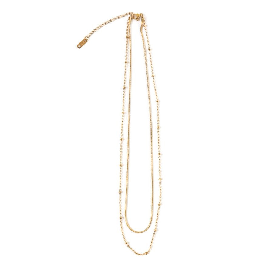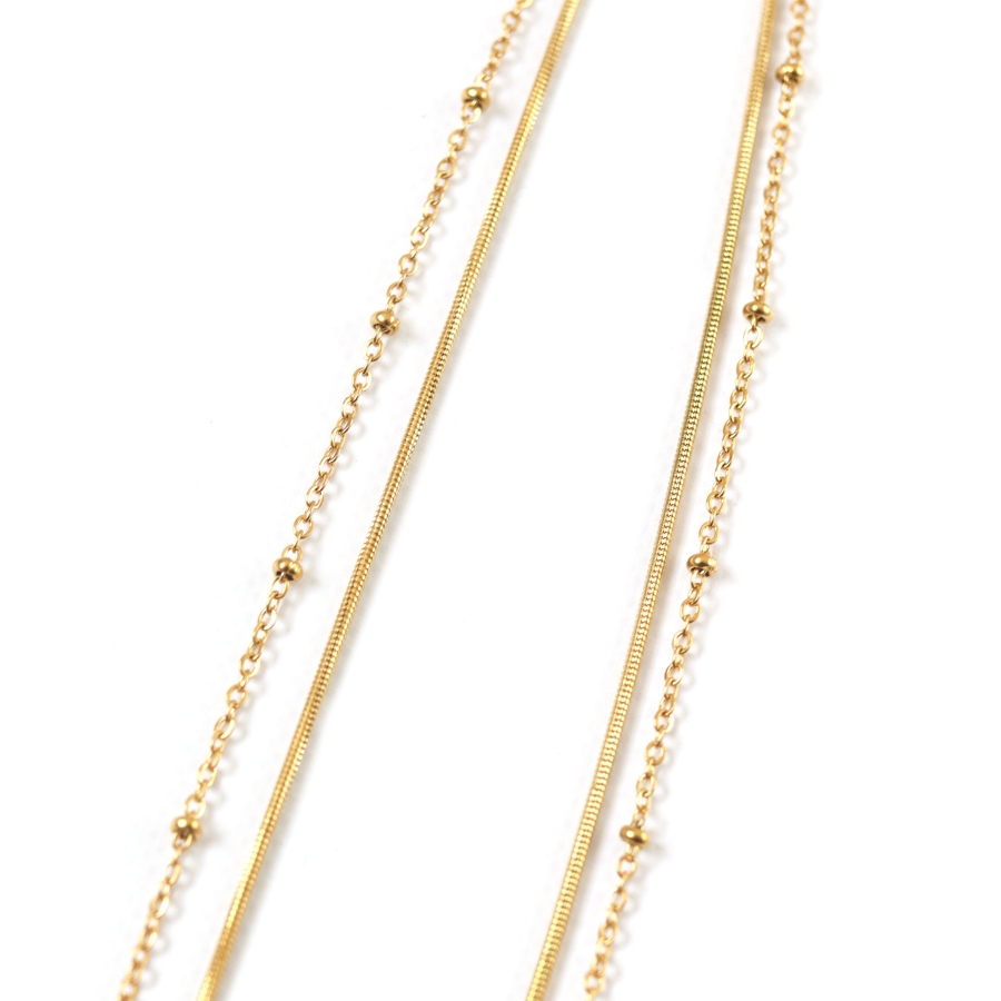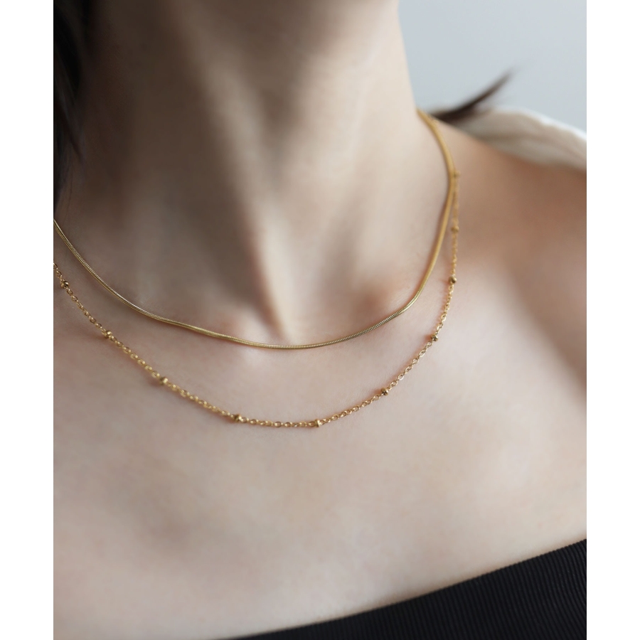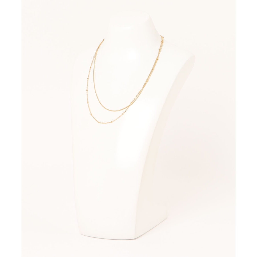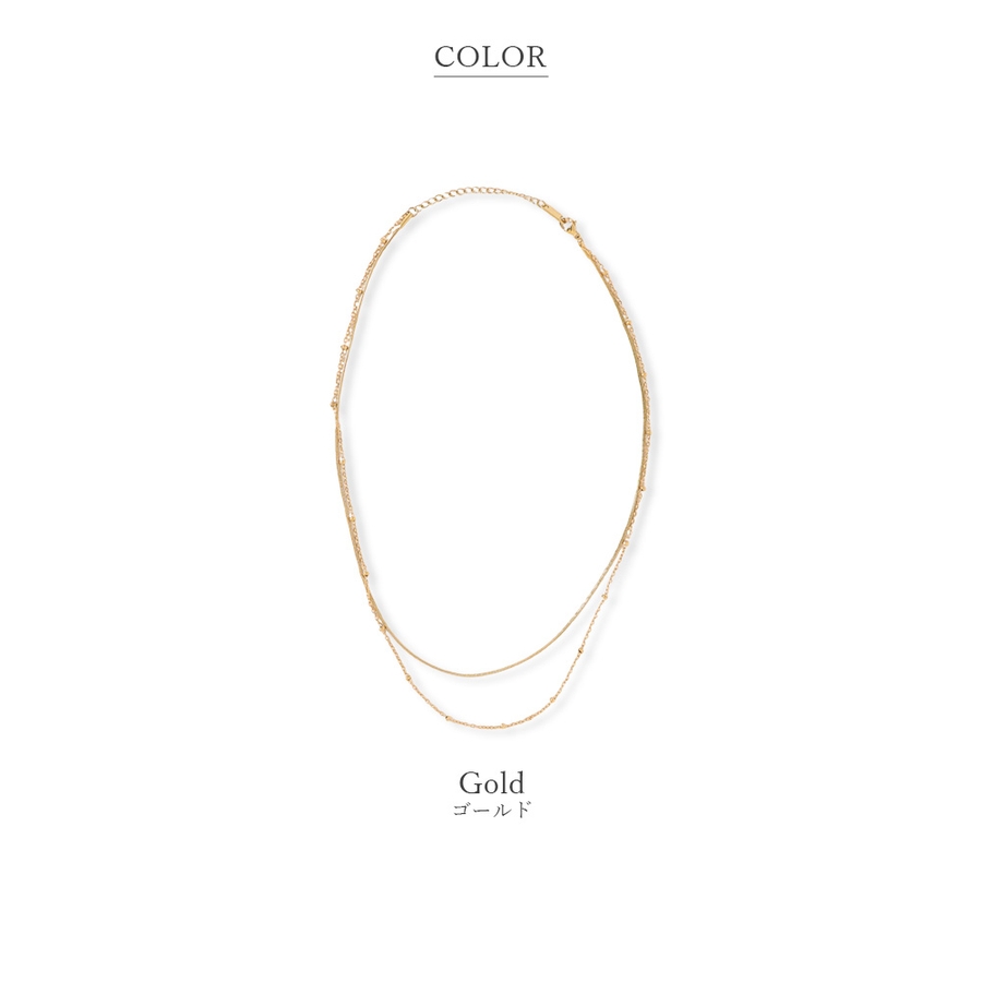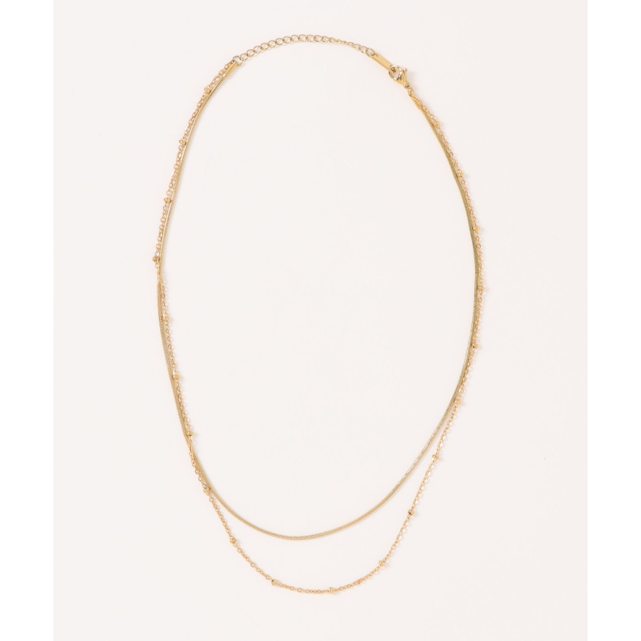 長さと種類の異なる2本のチェーンレックレスを組み合わせた2連チェーンネックレス。