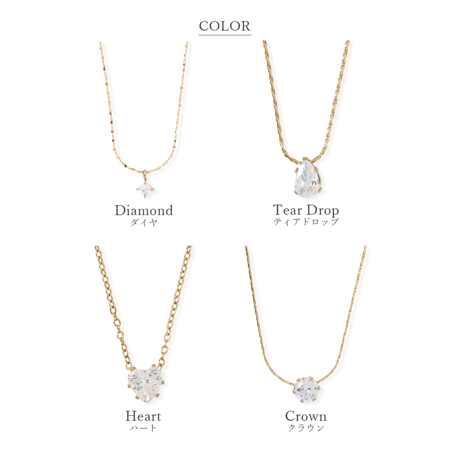 サイズ:【ダイヤ型】チェーン:長さ39cm+アジャスター5cm/モチーフ部分:5mm×5mm【ティアドロップ型】チェーン:長さ39cm+アジャスター5cm/モチーフ部分:9mm×5mm【ハート型】チェーン:長さ39cm+アジャスター5cm/モチーフ部分:7mm×7mm【クラウン型】チェーン:長さ39cm+アジャスター5cm/モチーフ部分:直径5mm