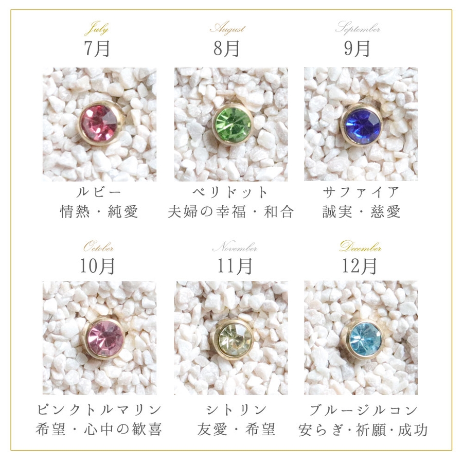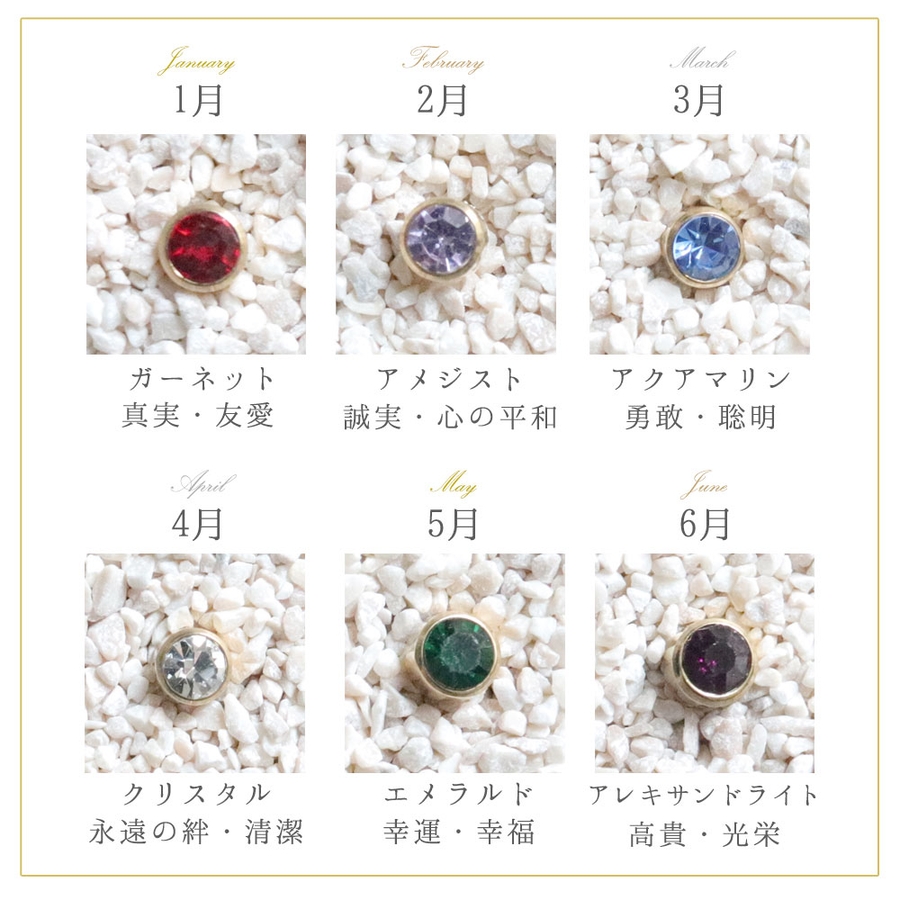 | タイプ | 1月ガーネット / 2月アメジスト / 3月アクアマリン / 4月クリスタル / 5月エメラルド / 6月アレキサンドライト / 7月ルビー / 8月ペリドット / 9月サファイア / 10月ピンクトルマリン / 11月シトリン / 12月ブルージルコン |