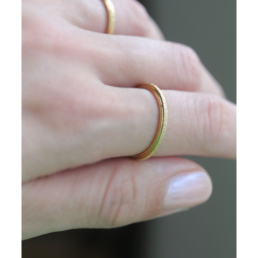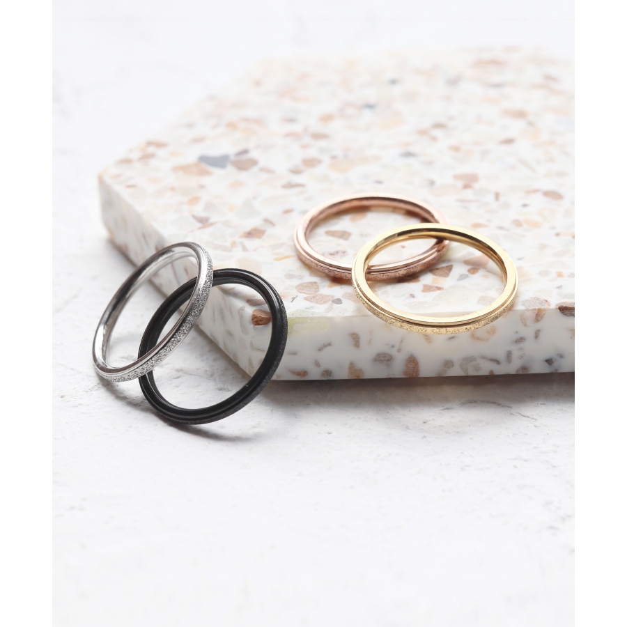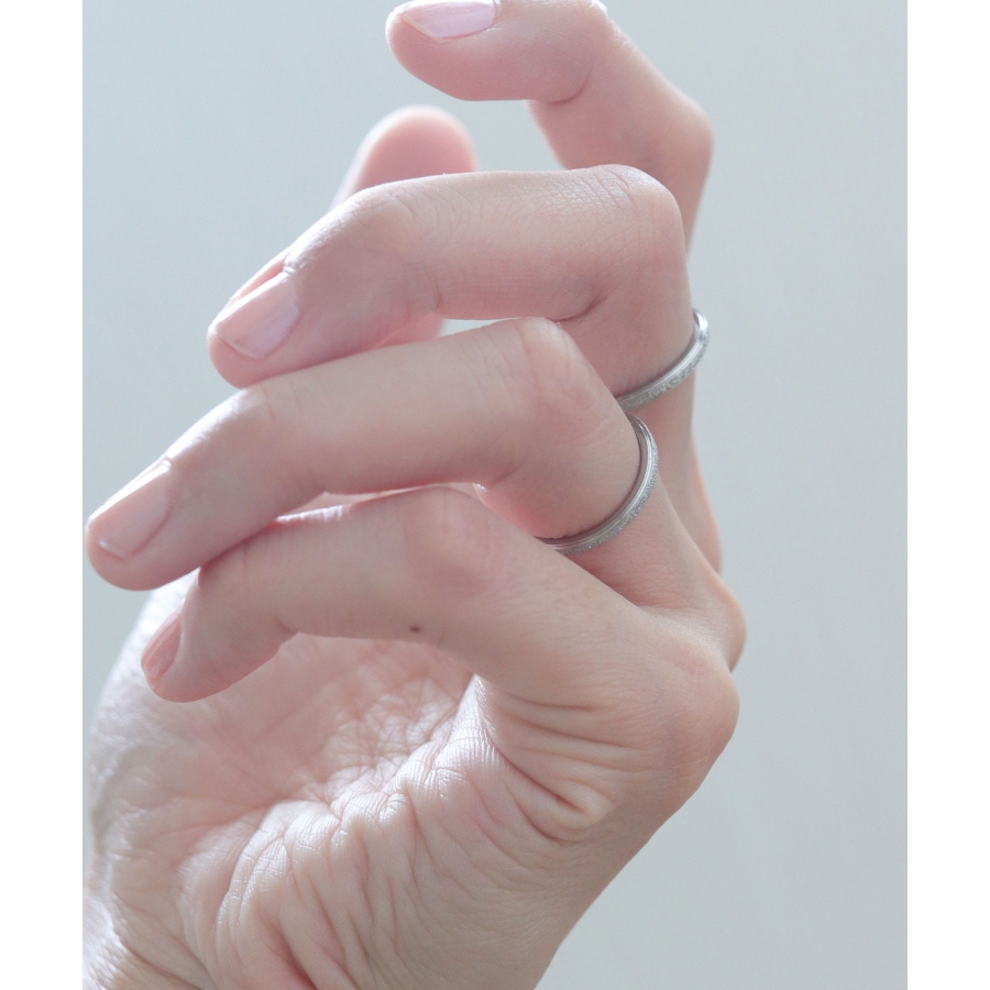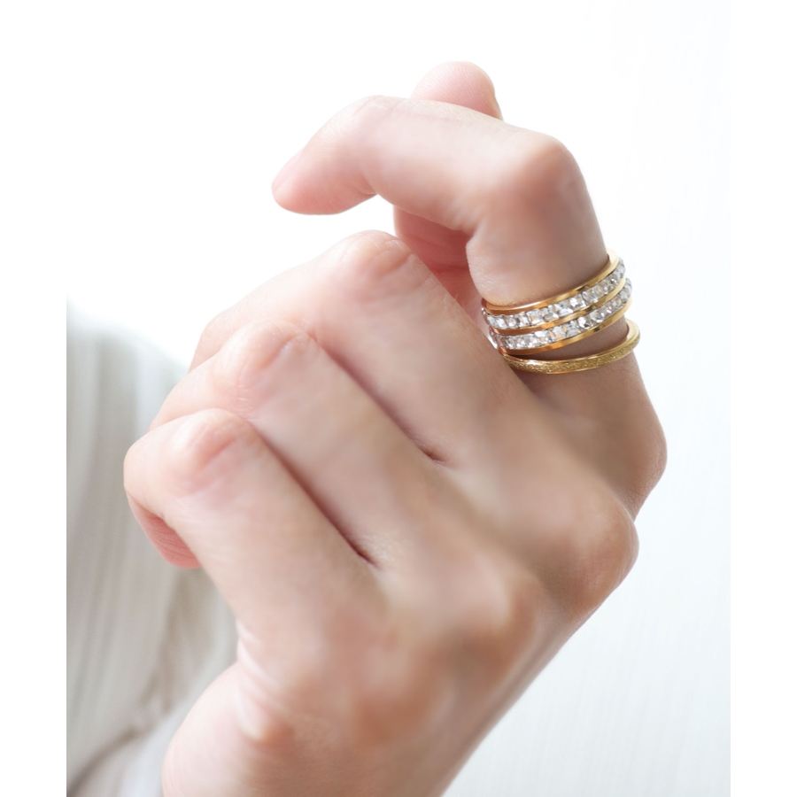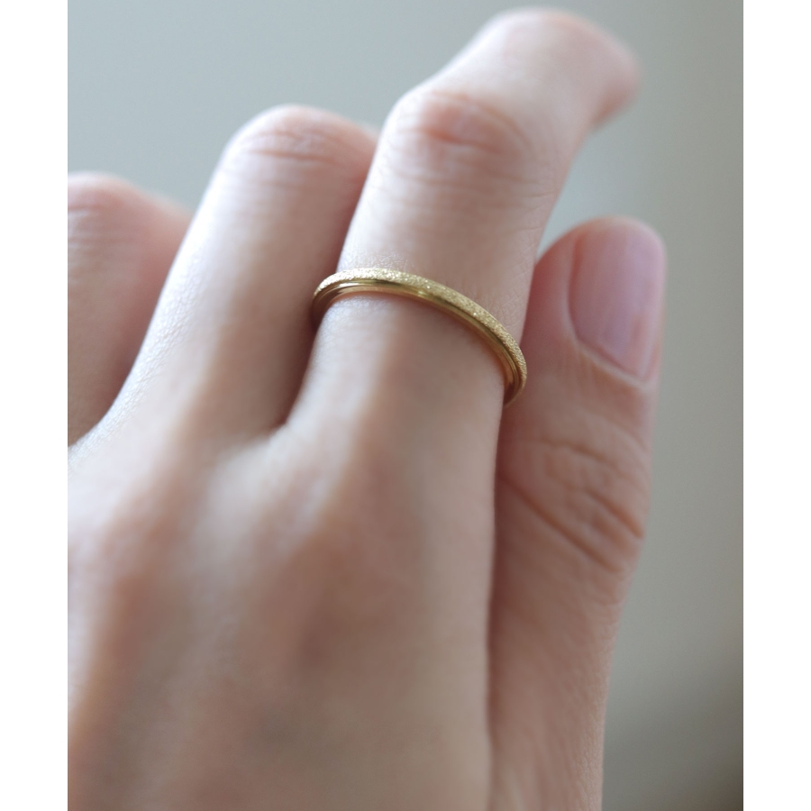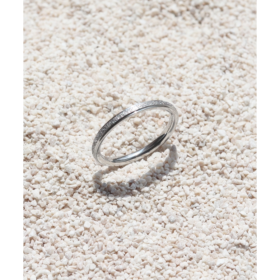 スターダスト加工に、シャープなボリュームがこなれた印象のリング。