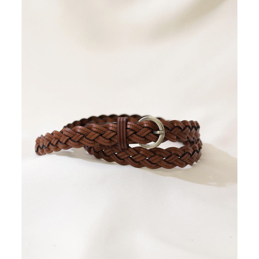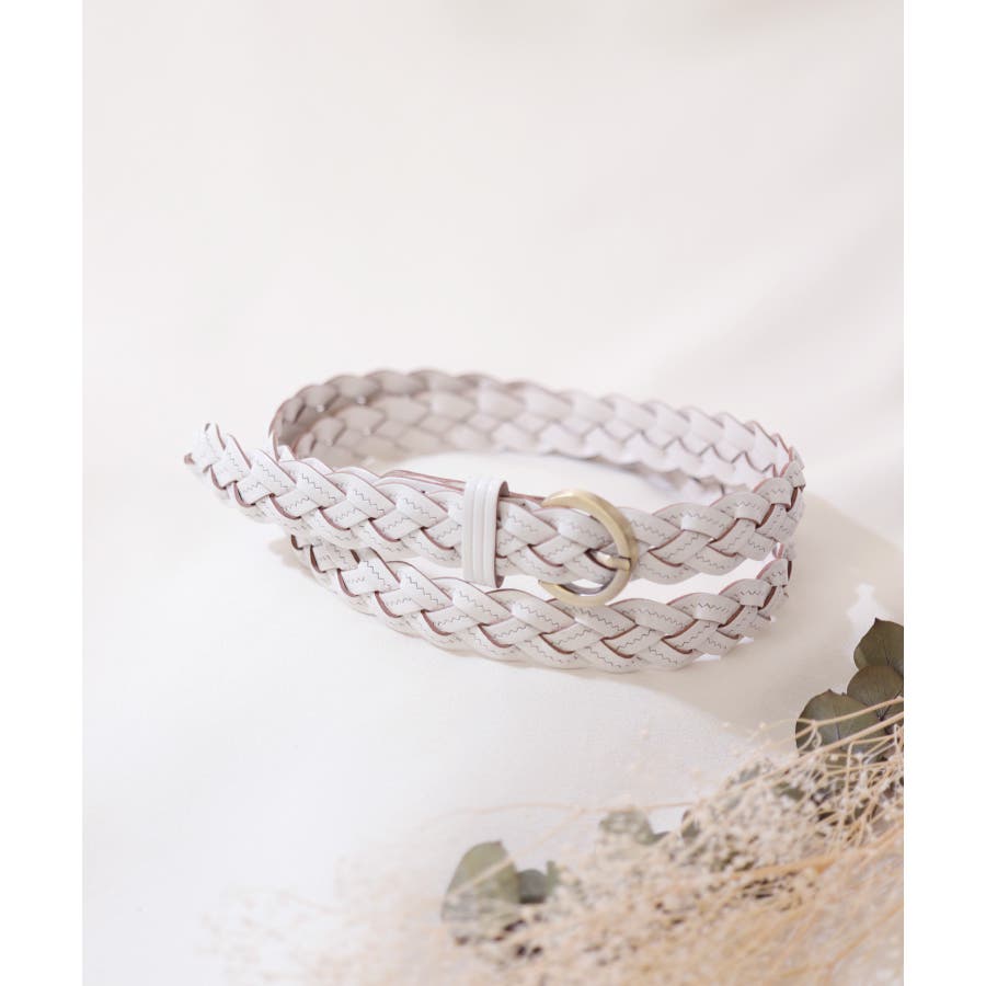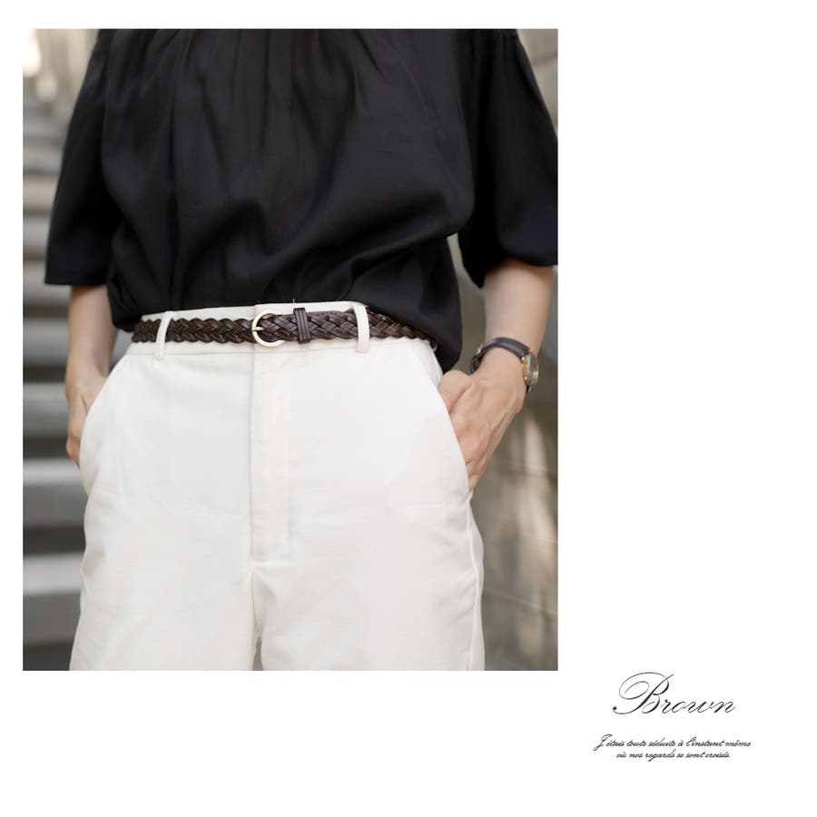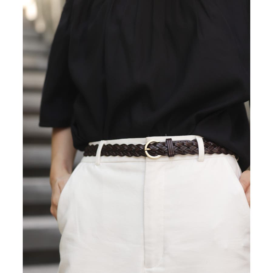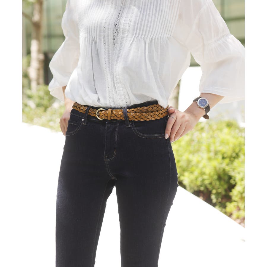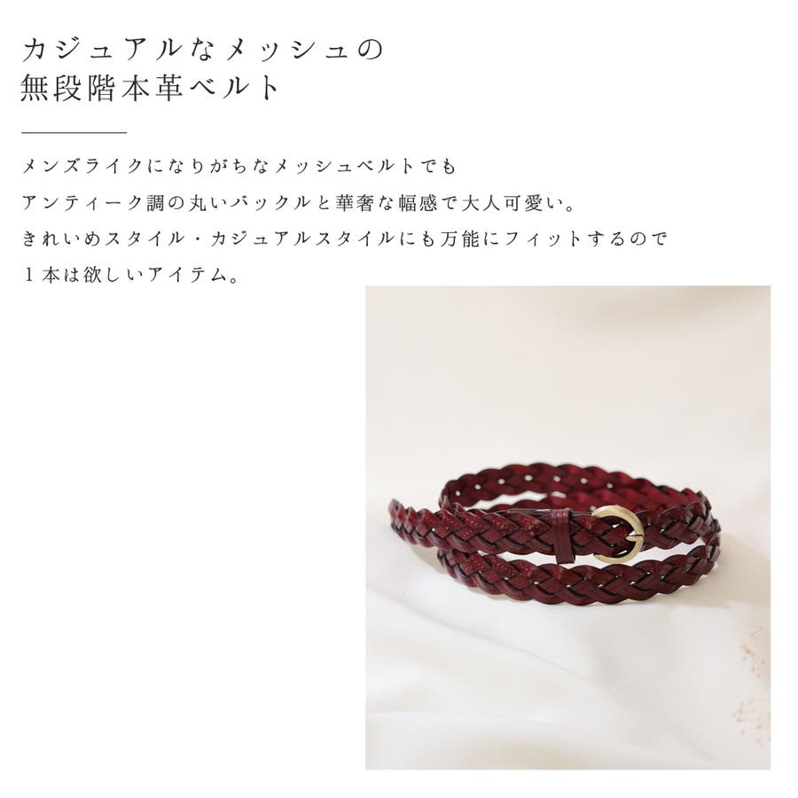 メンズライクになりがちなメッシュベルトでもアンティーク調の丸いバックルと華奢な幅感で大人可愛い。