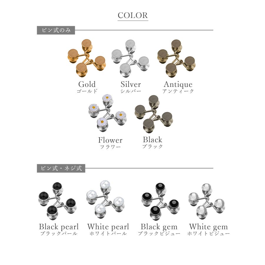 | カラー | 【ピン式】 ゴールド / 【ピン式】 シルバー / 【ピン式】 アンティーク / 【ピン式】 フラワー / 【ピン式】 ブラック / 【ピン式】 ブラックパール / 【ピン式】 ホワイトパール / 【ピン式】 ブラックビジュー / 【ピン式】 ホワイトビジュー / 【ネジ式】 ブラックパール / 【ネジ式】 ホワイトパール / 【ネジ式】 ブラックビジュー / 【ネジ式】 ホワイトビジュー |