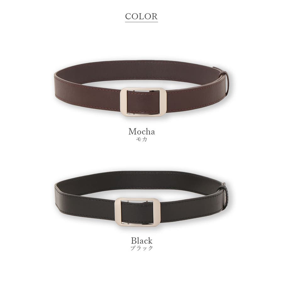 3.3cm幅のフェイクレザーと、ボリューム感のあるシルバーバックルの組み合わせが大人かわいいデザインベルト。