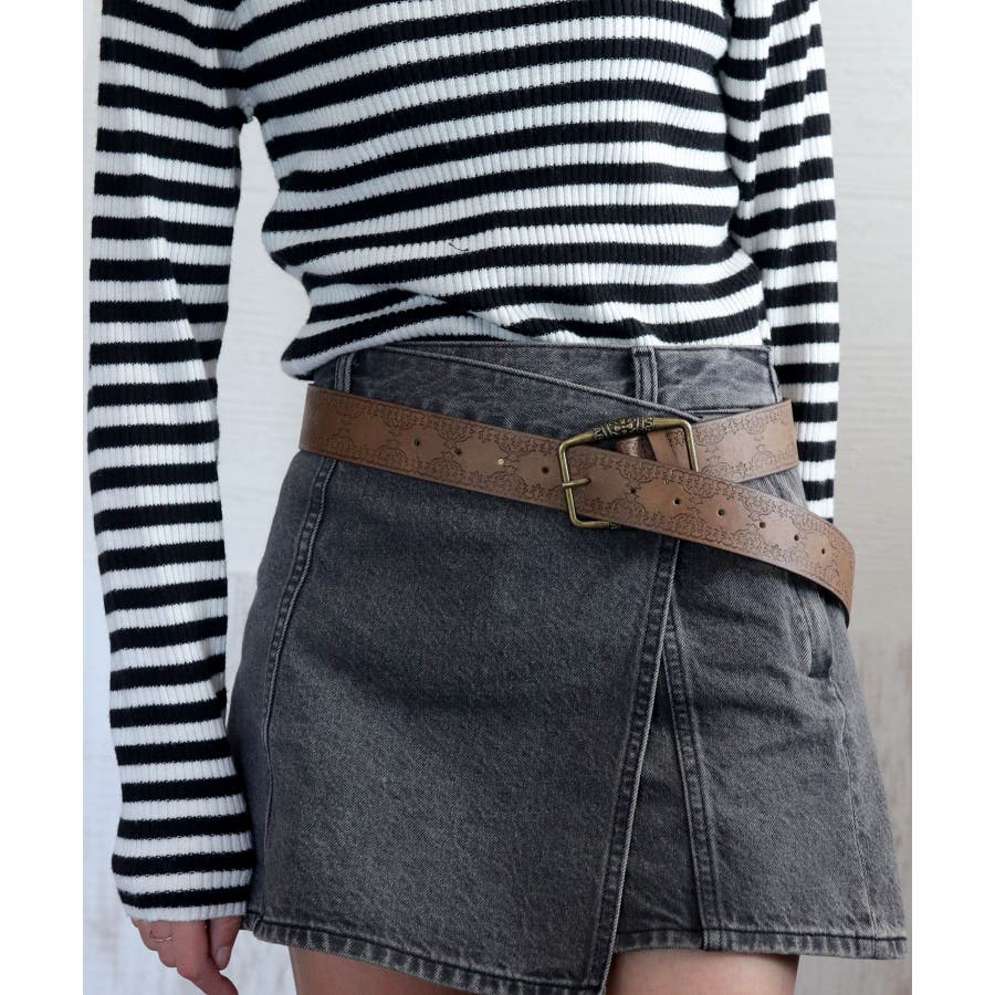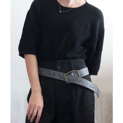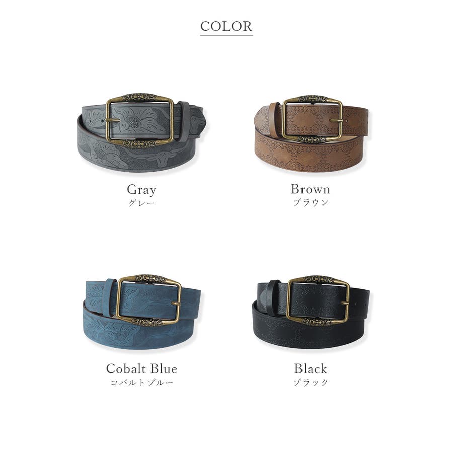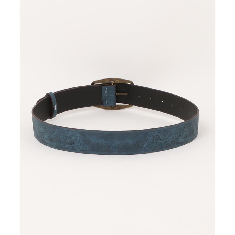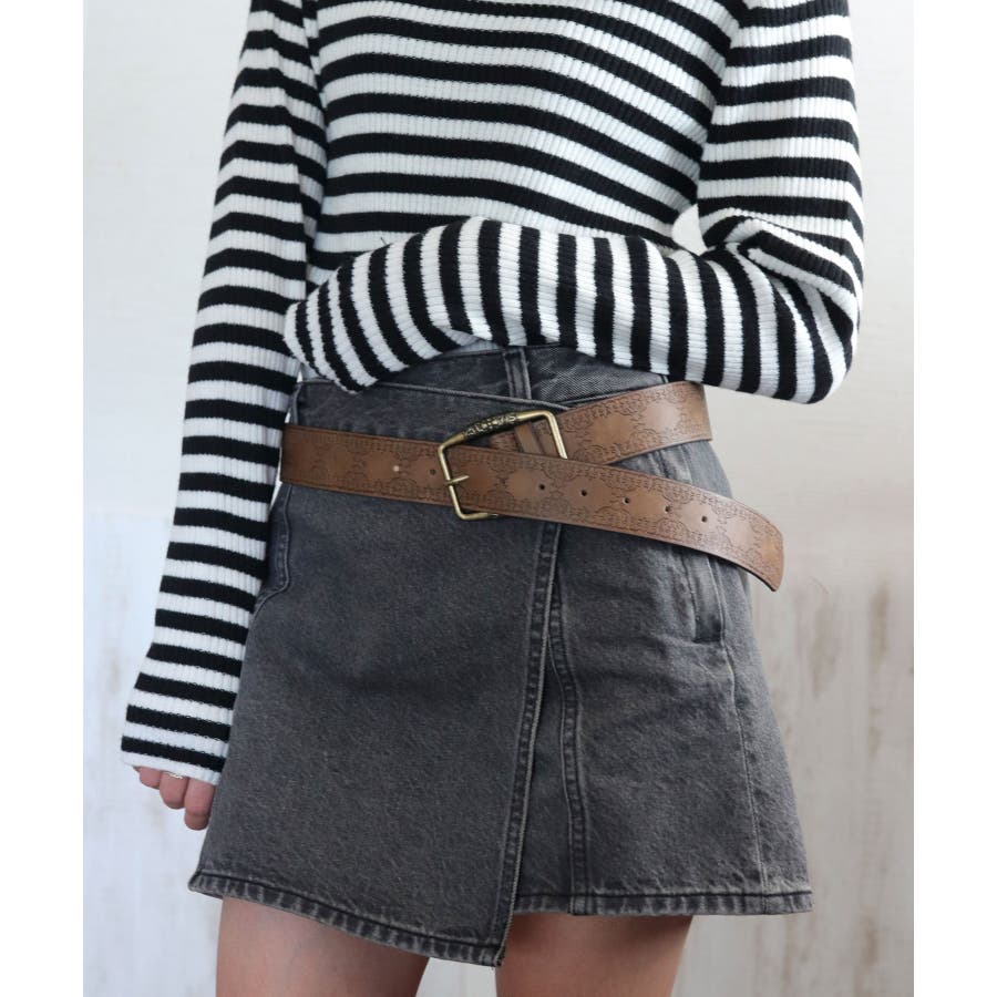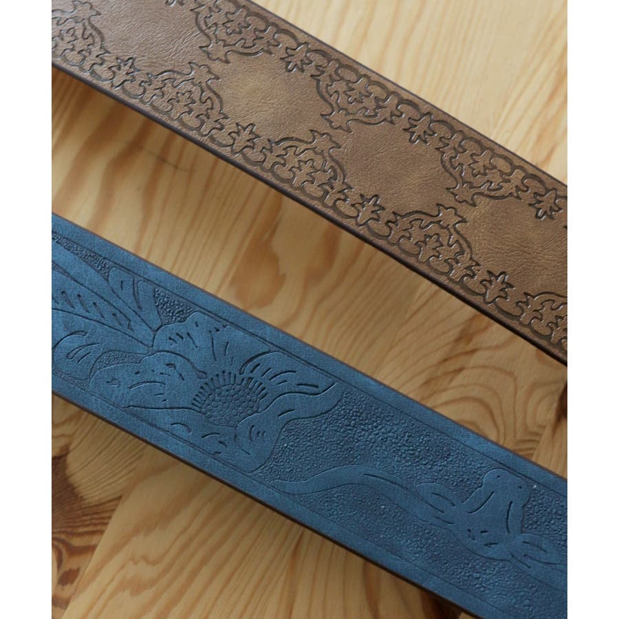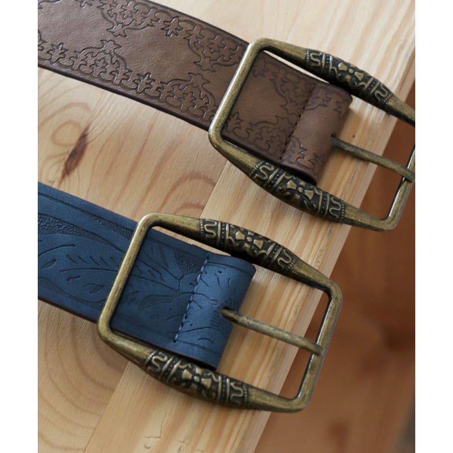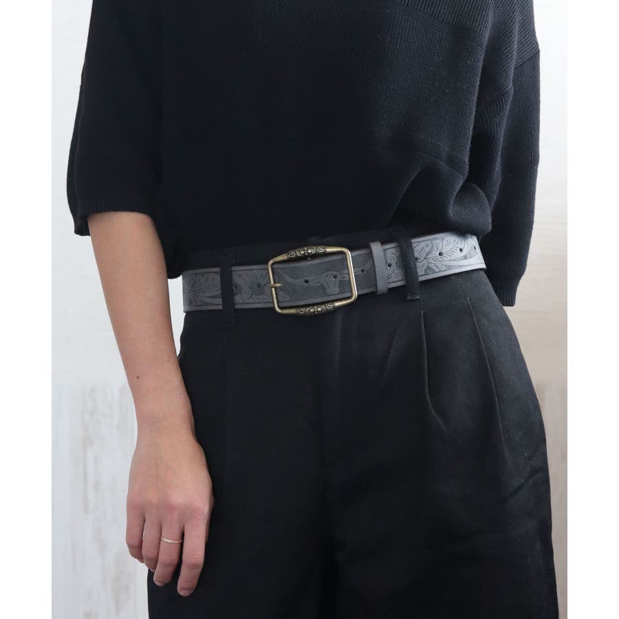 ベルト全体に彫刻のようなボタニカル柄を刻印し、コーデに映えるボリュームベルトに。