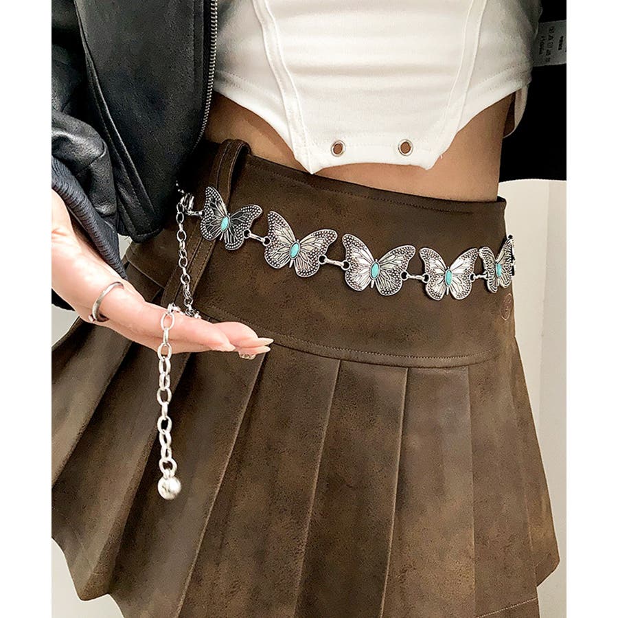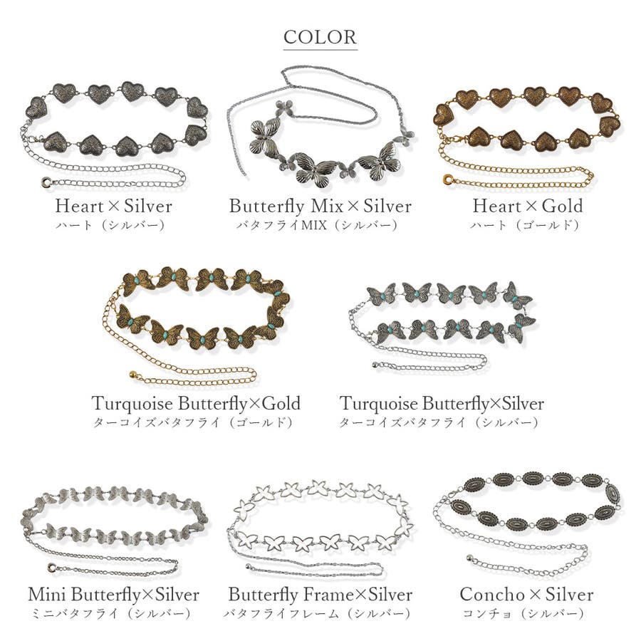 蝶々やハートなどのモチーフをチェーンで連ねて、コーデのアクセントになるおしゃれなチェーンベルトに。