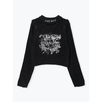 フロントに描かれたゴシック調のエンジェルが病み可愛い雰囲気を放つニット。