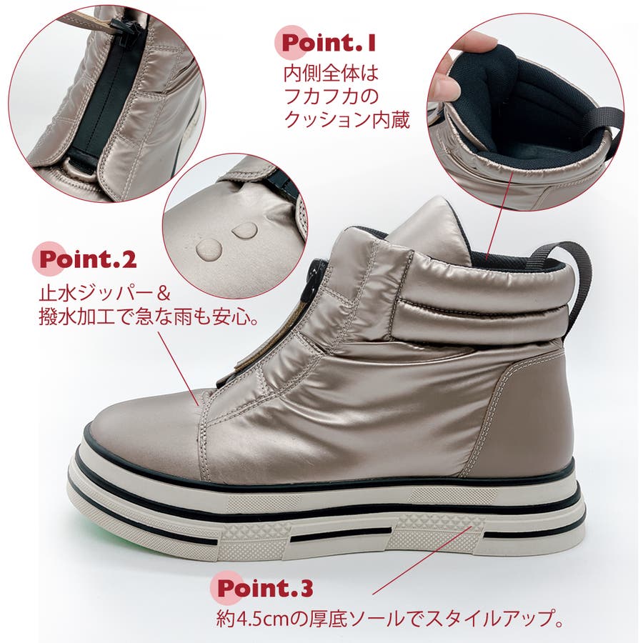 センタージッパーで脱ぎ履きが簡単なうえ、止水仕様なので水が入り込みにくく、あたたかさを持続。