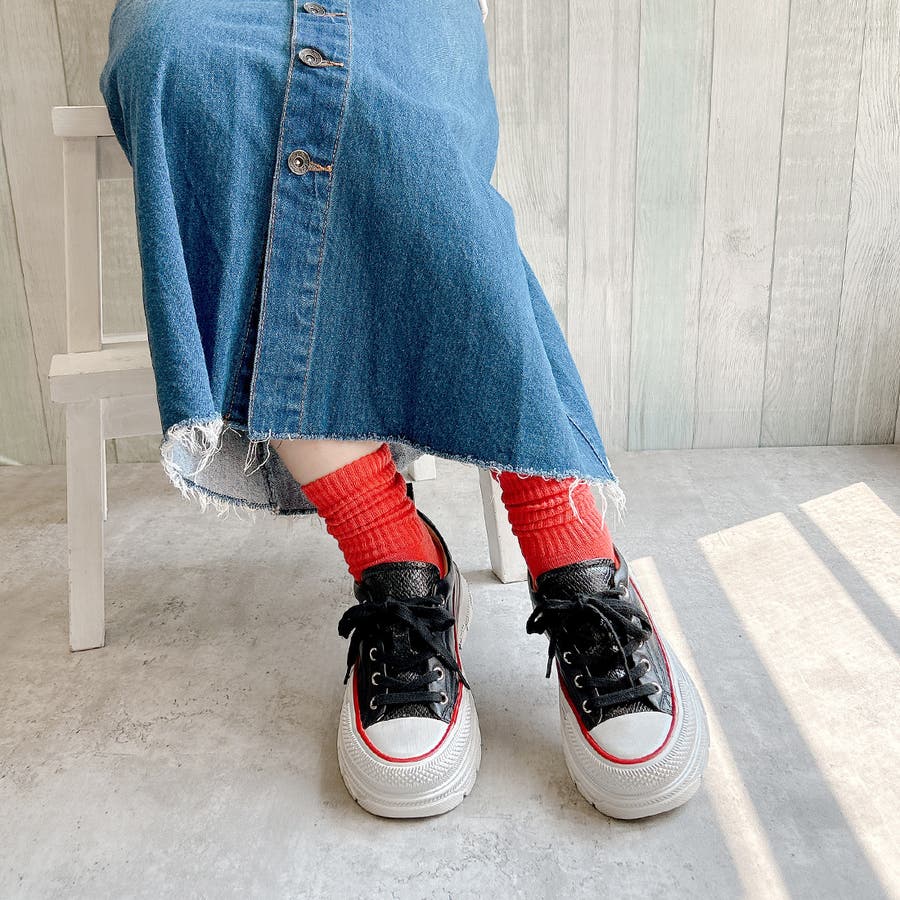 カラーソックスと合わせると、スタイリングの幅が広がります。