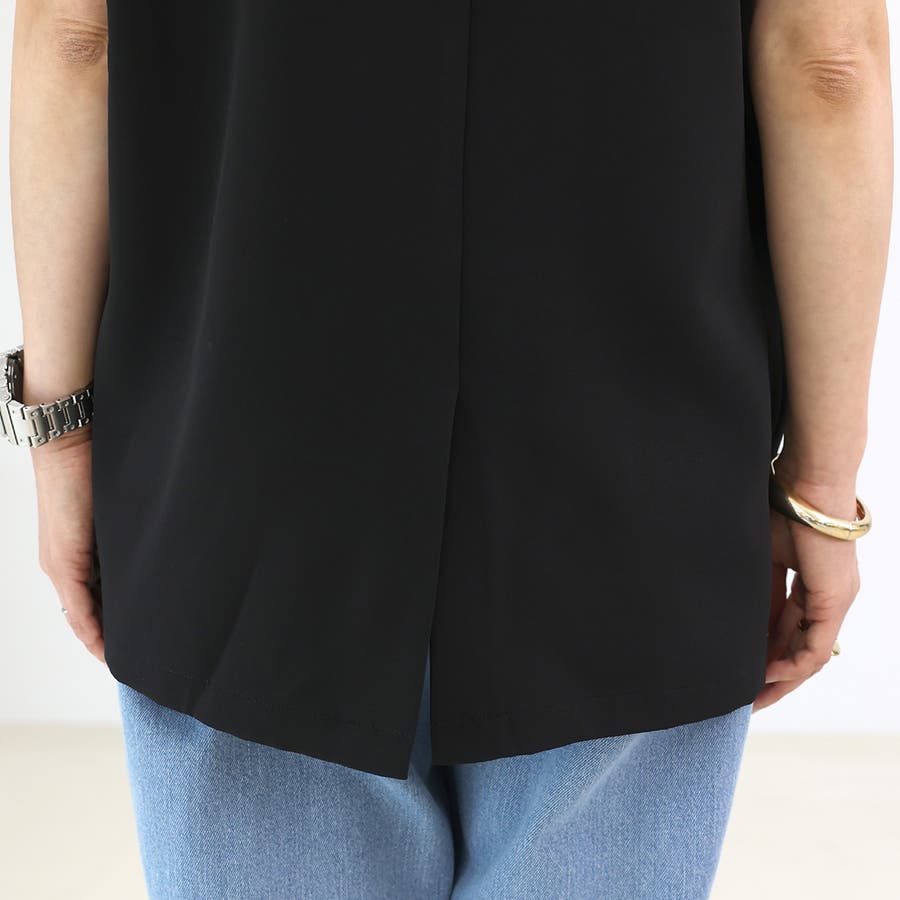 袖周りが広いので、ボリュームある袖のブラウスでも着れるので、合わせると映えます。