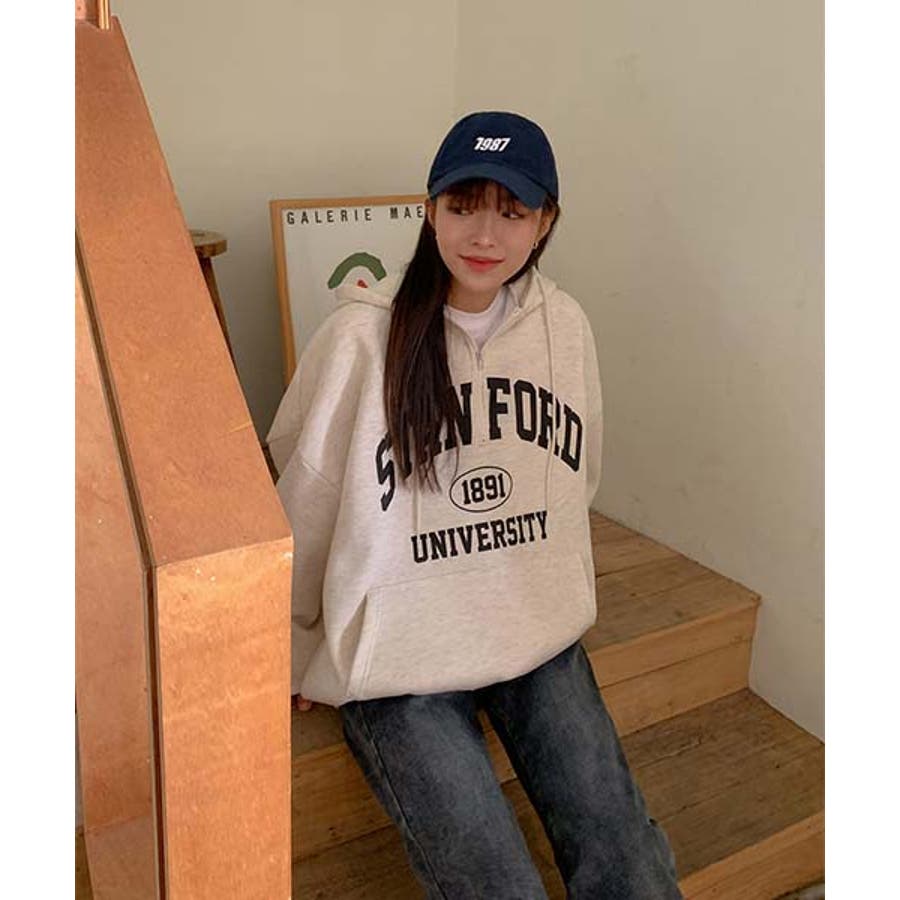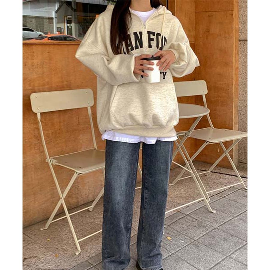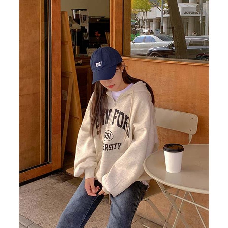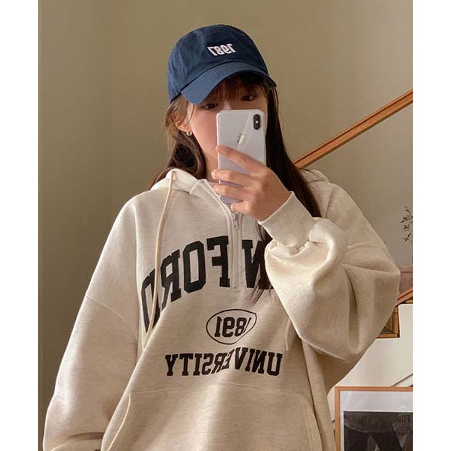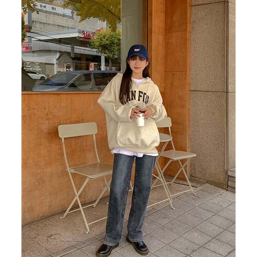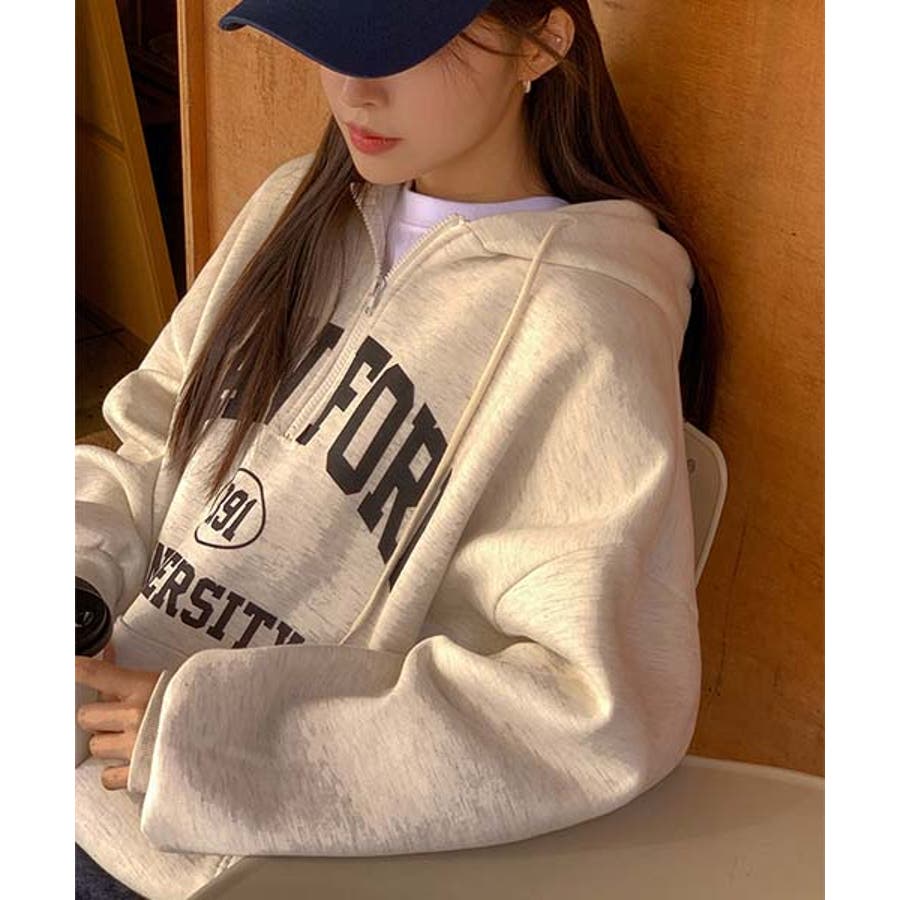 韓国 韓国ファッション 英文 プリント 裏起毛 ハーフジップアップ パーカー コットン ストリート カジュアル 着回し 秋冬 秋 冬服 冬