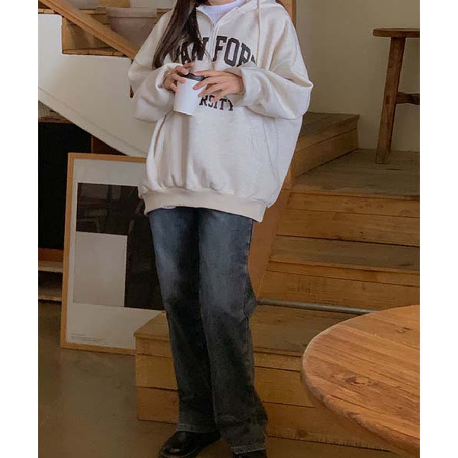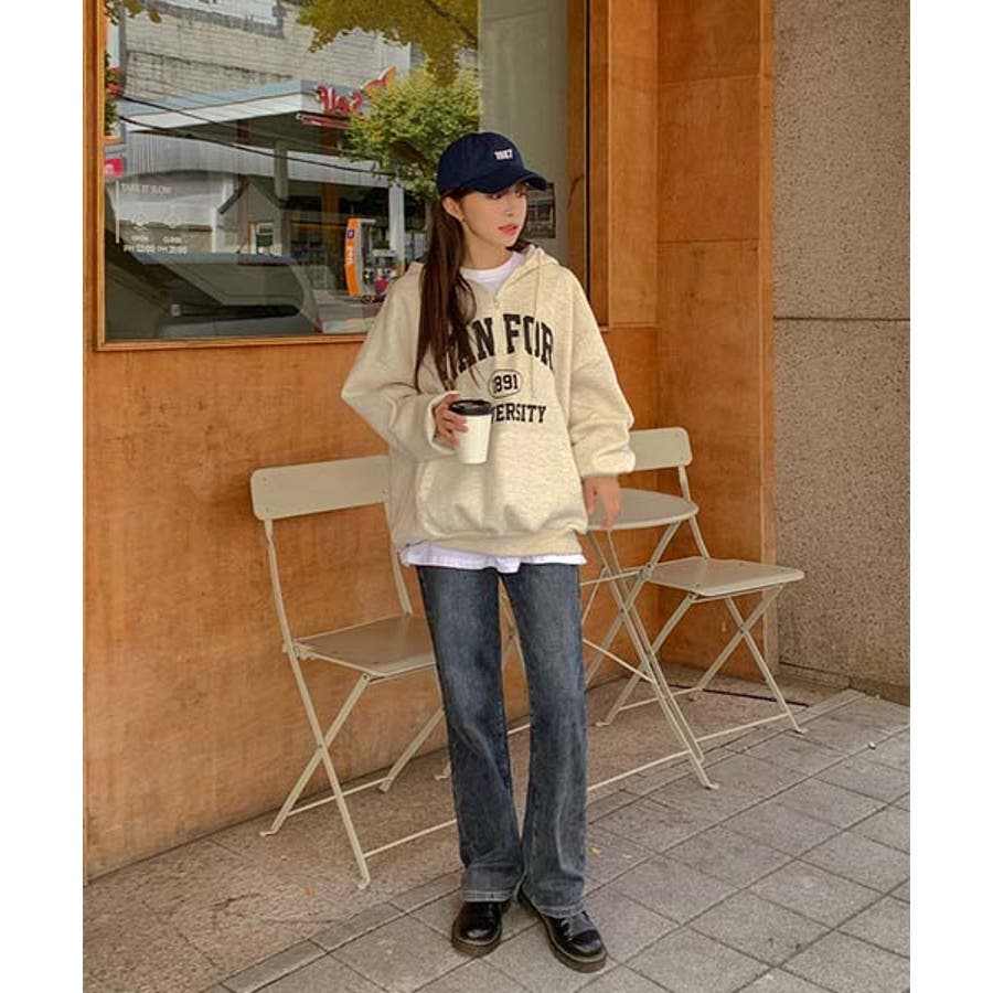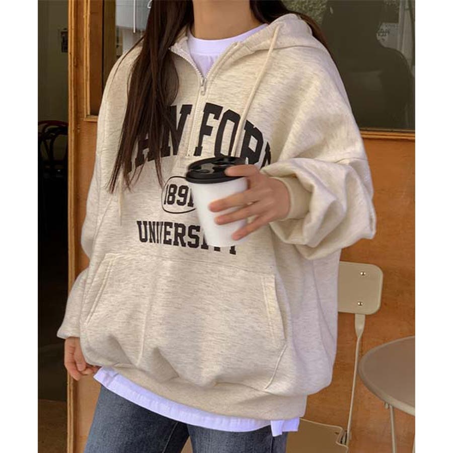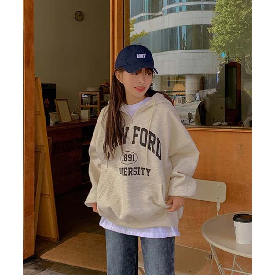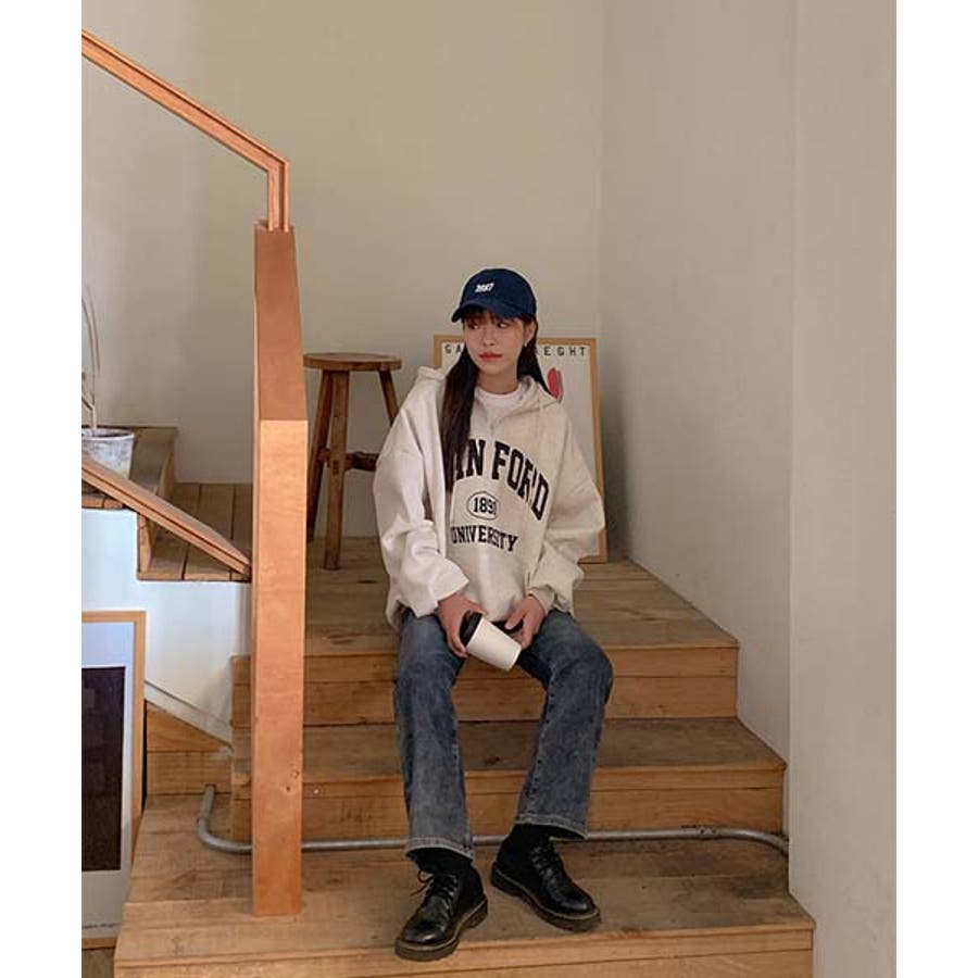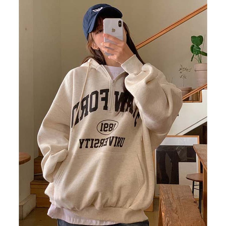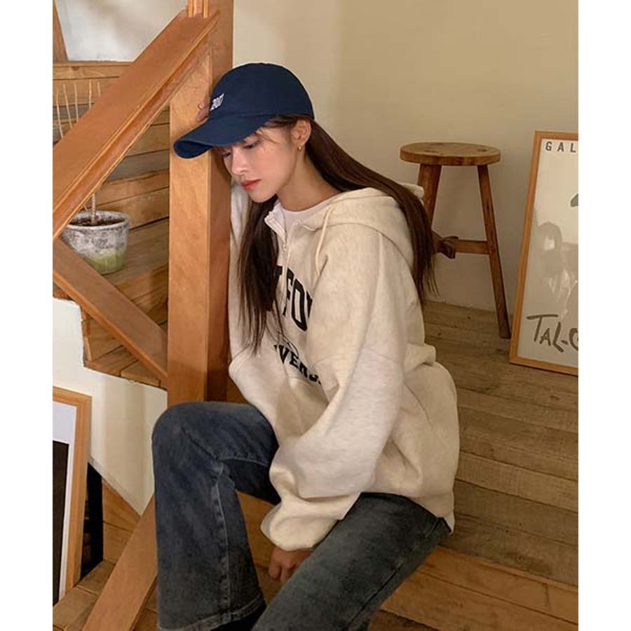 韓国 韓国ファッション 英文 プリント 裏起毛 ハーフジップアップ パーカー コットン ストリート カジュアル 着回し 秋冬 秋 冬服 冬