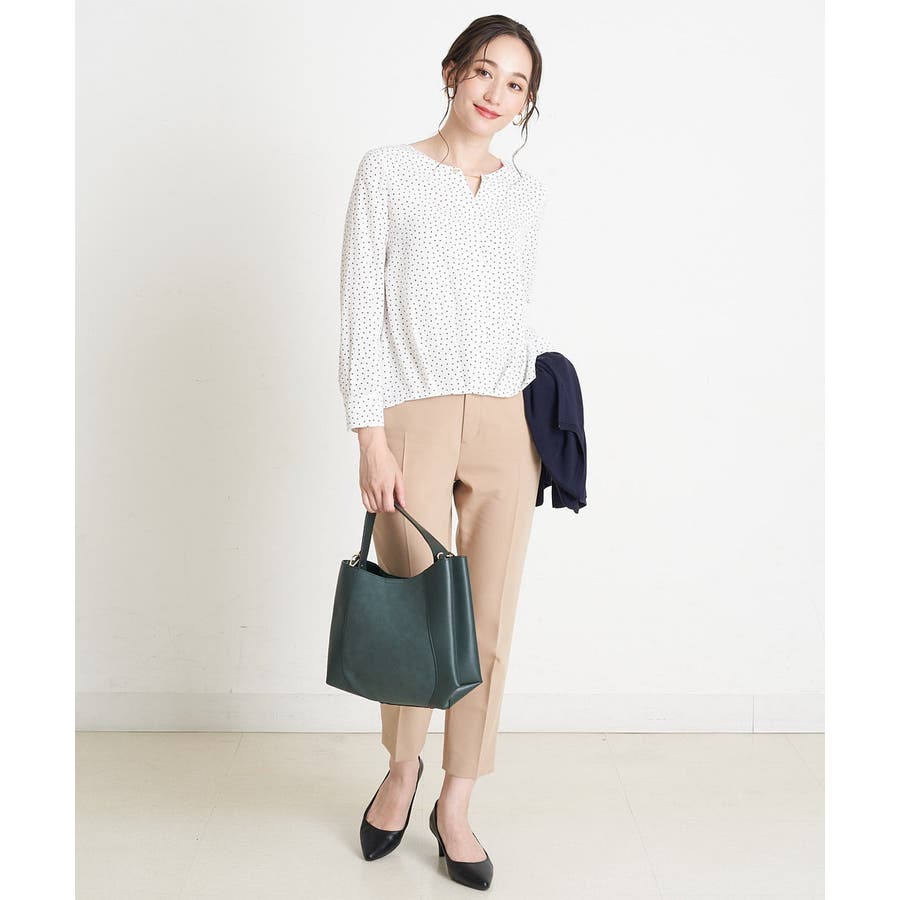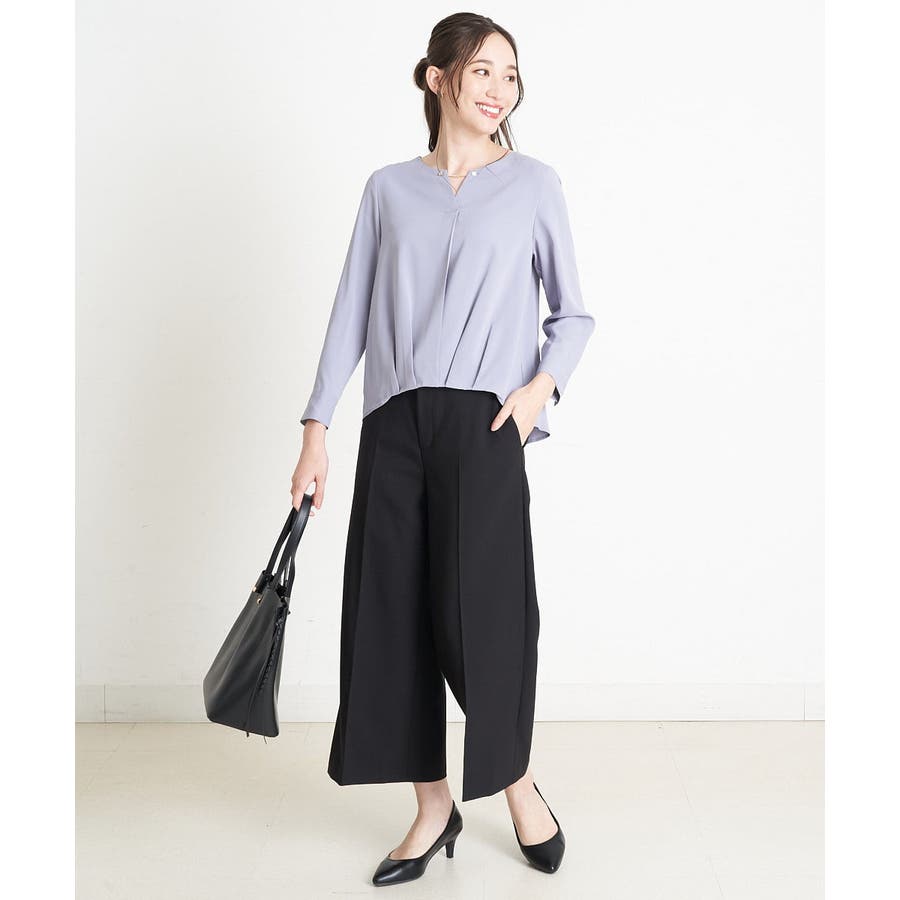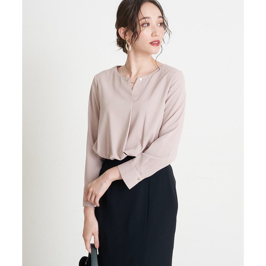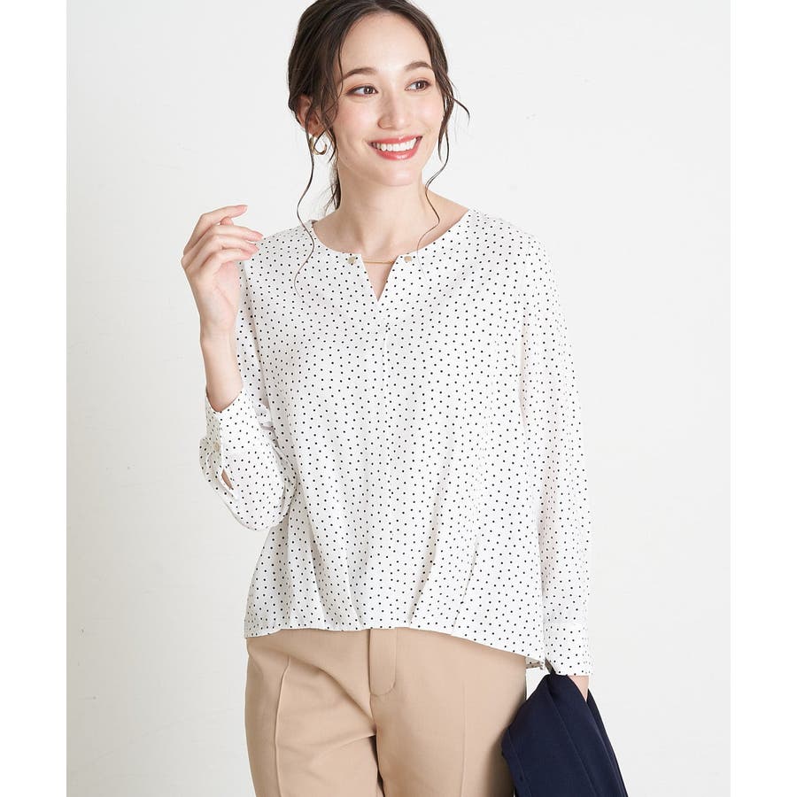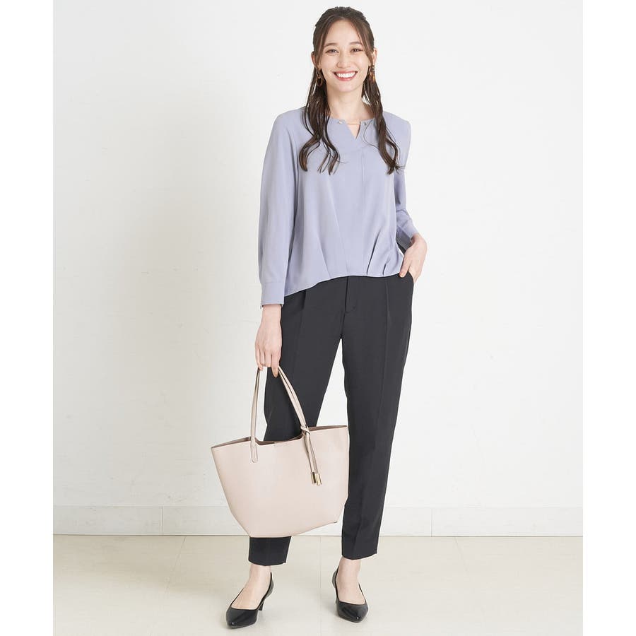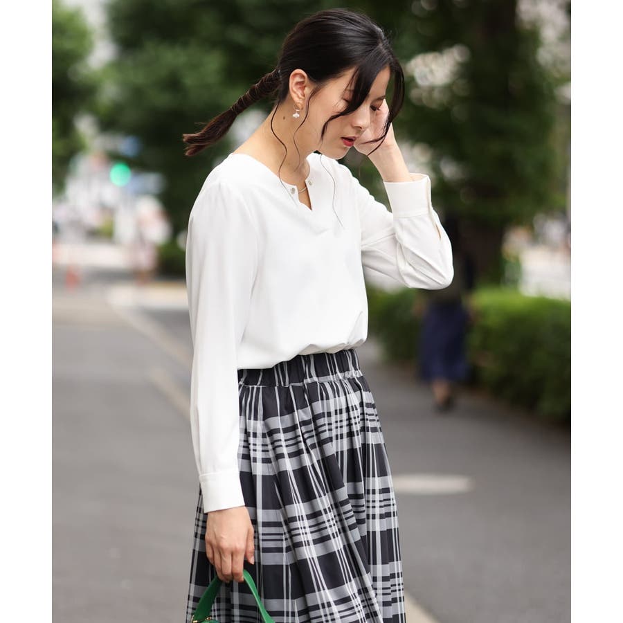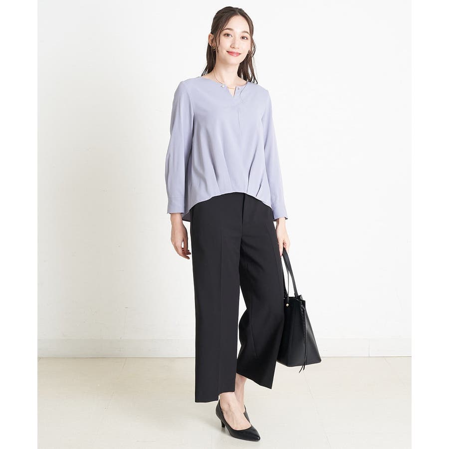 すっきりした襟周りに、チャームがポイントのブラウスです。