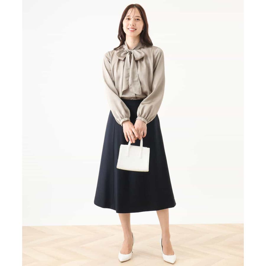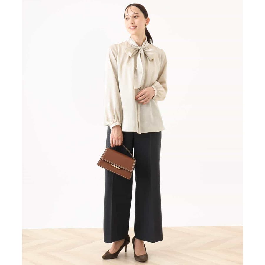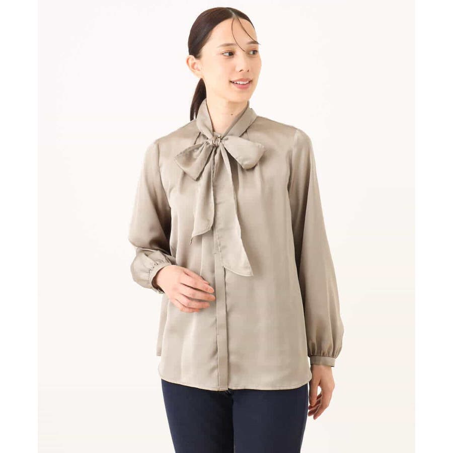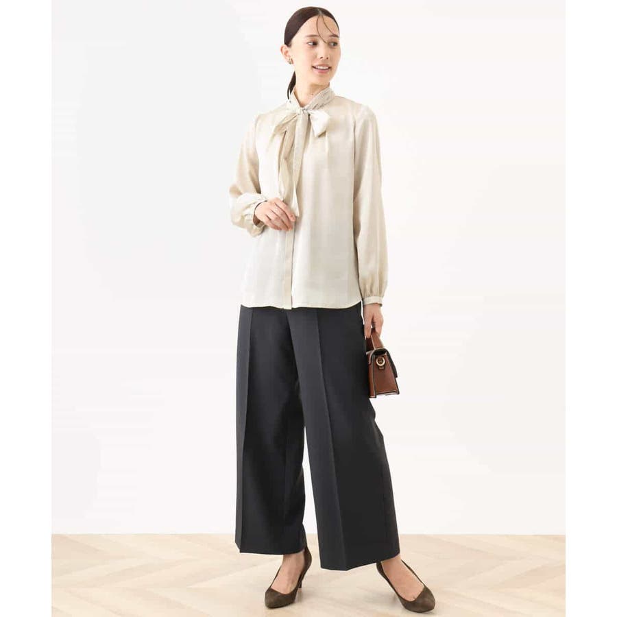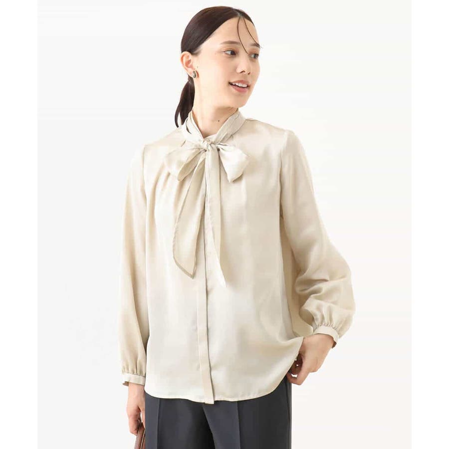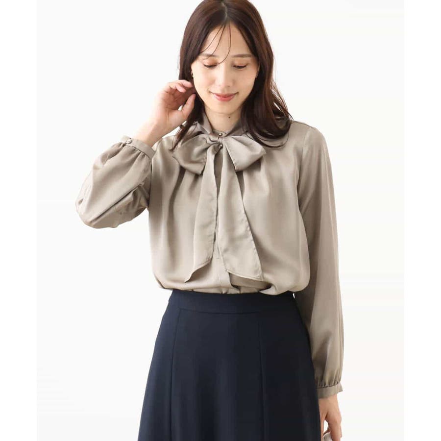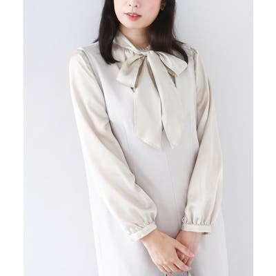 大きめのリボンは一枚でも華やか見え。きちんと感のあるブラウスに上品さをプラスしてくれます。一枚でもジャケットのインナーにも映えるデザインは、ジャンスカなどのインナーとしてもおすすめです。
