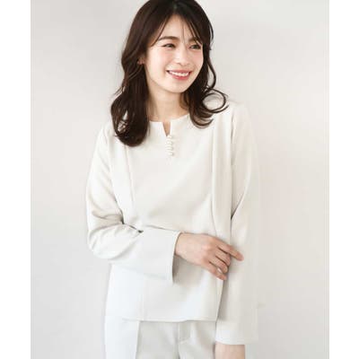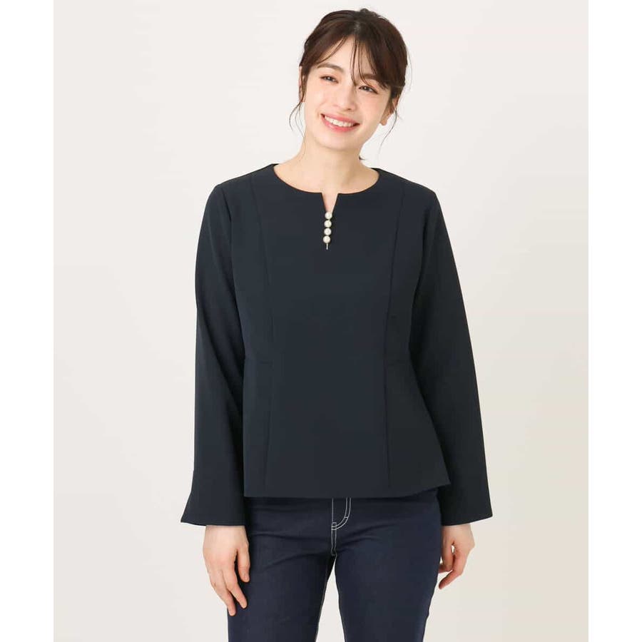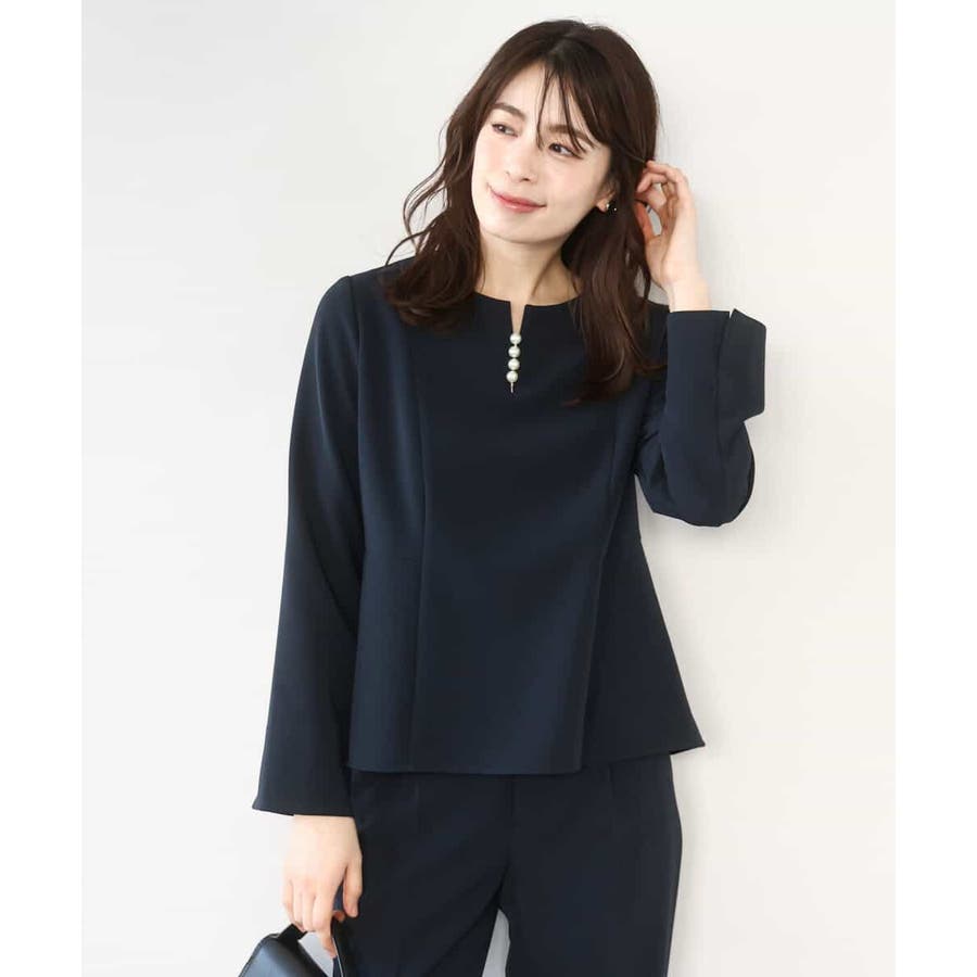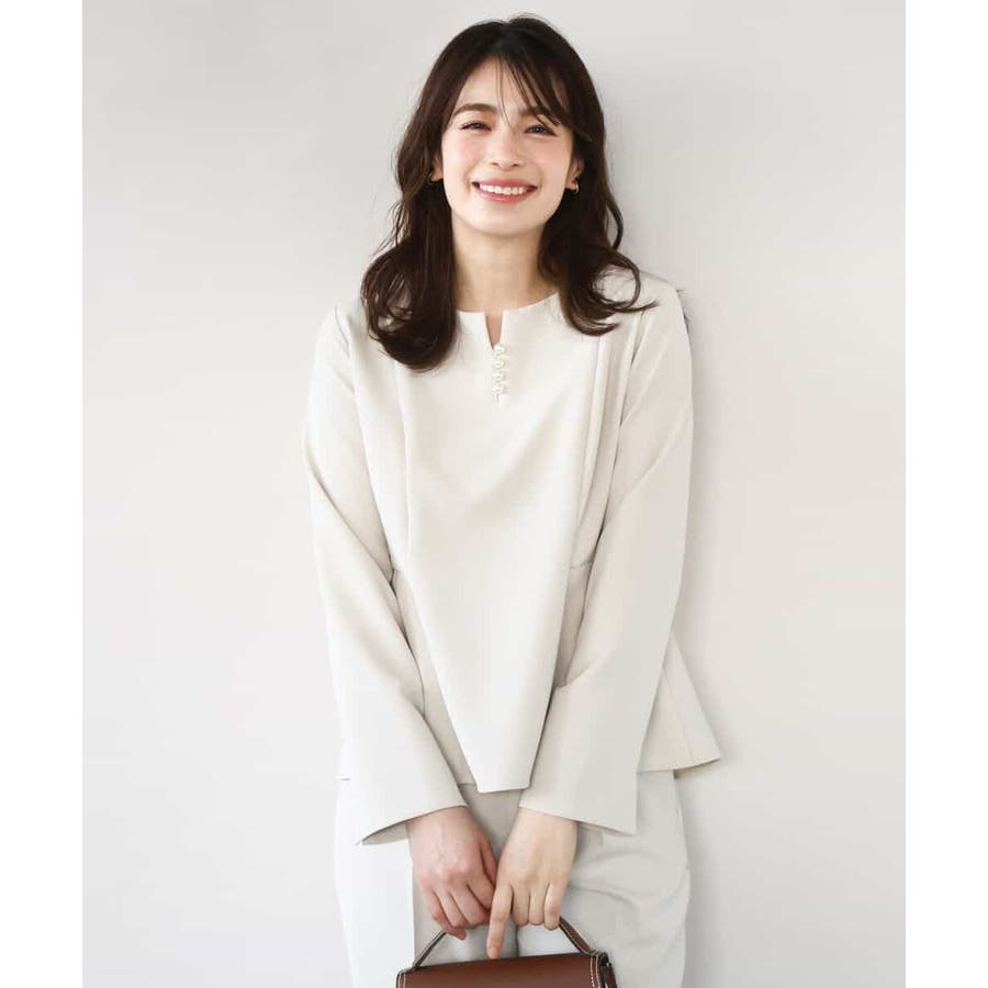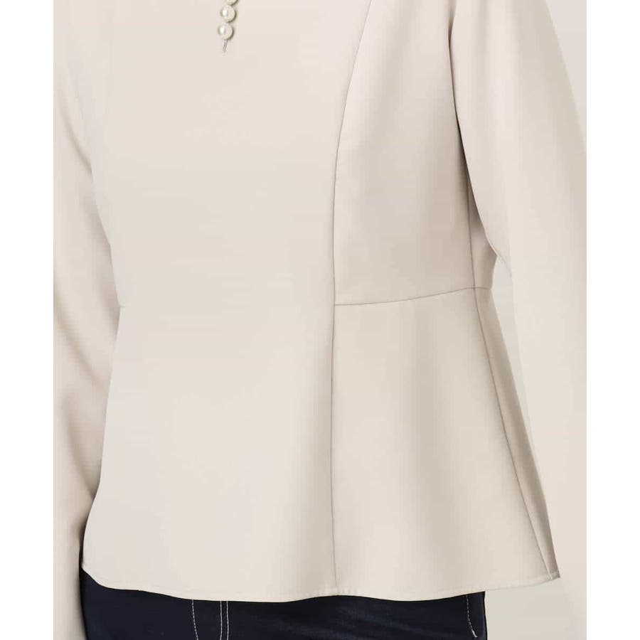 ボディラインをさりげなくカバーしつつ華やかさを演出するペプラムデザインのブラウス。後ろ身頃丈を少し長めにすることで、気になるヒップもカバーしてくれます。アクセントに胸元には取り外し可能なフェイクパールをあしらいました。外すとシンプルなブラウスとして着用可能。袖口は折り返し可能なスリット開きに。