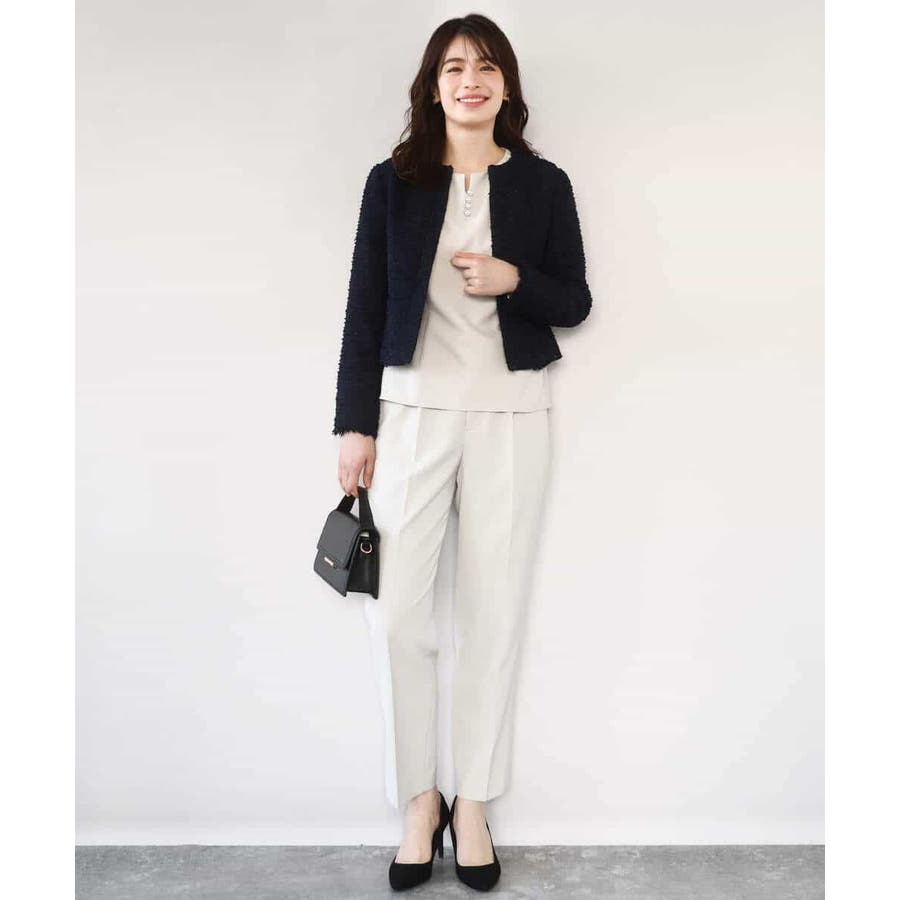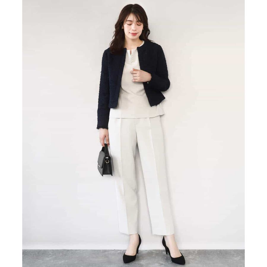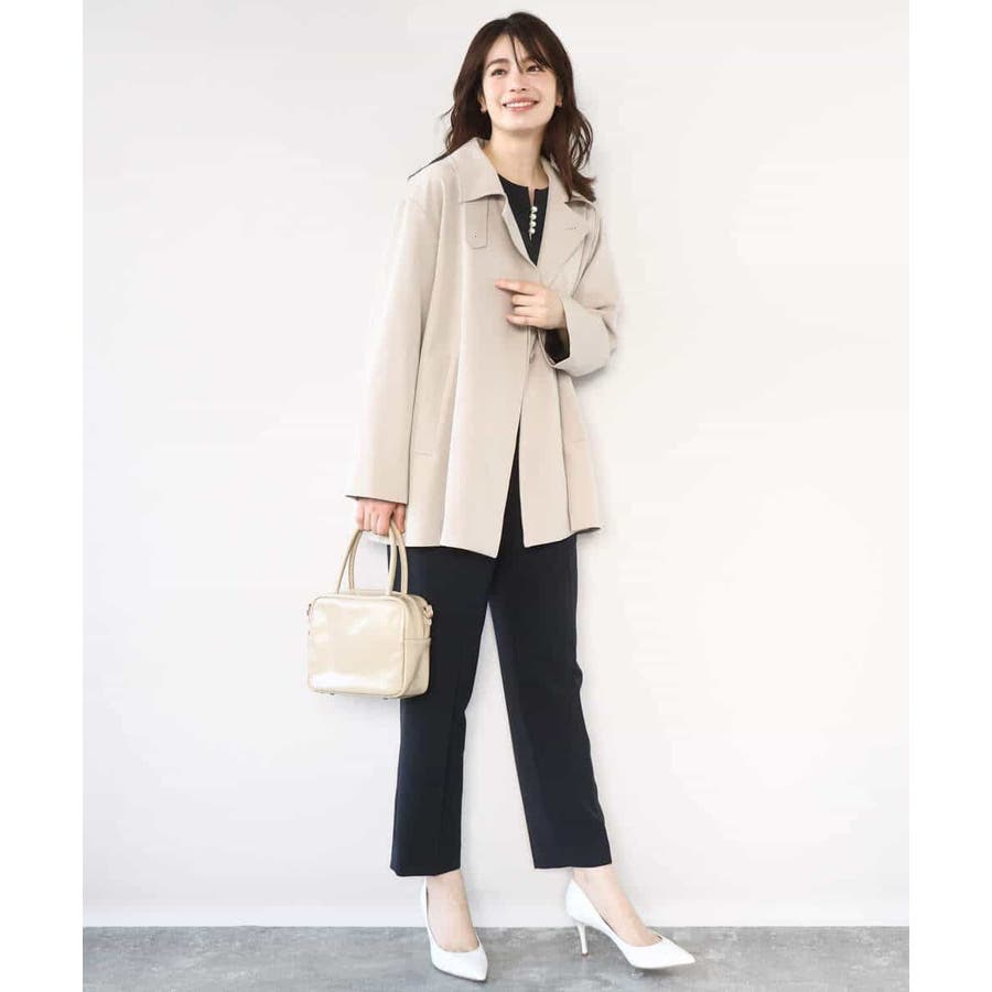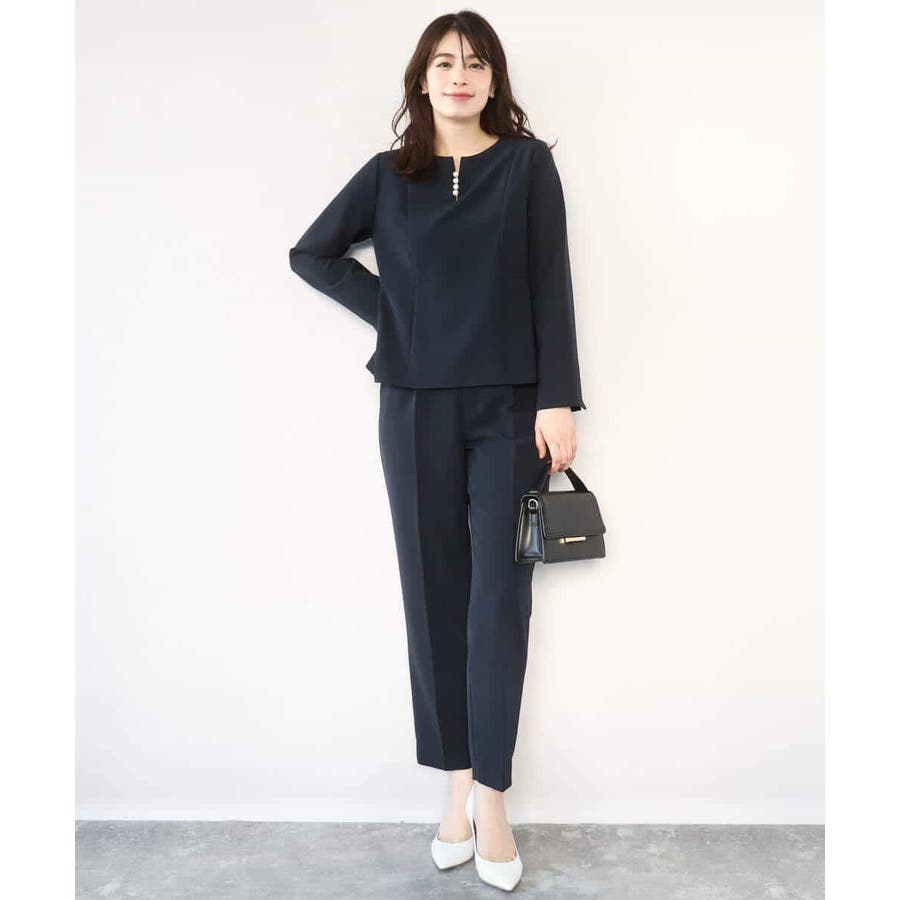 シワになりにくくお手入れもラクなきれい見え素材を使用。なめらかな表面感と程よい光沢感が魅力の素材はシーズン関係なく着用しやすい素材感です。動きやすいストレッチ感とお仕事にも嬉しい防シワ機能付き。
