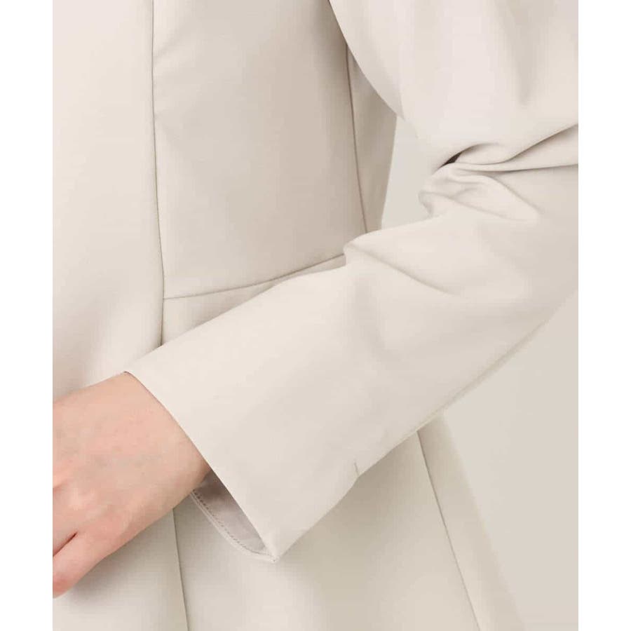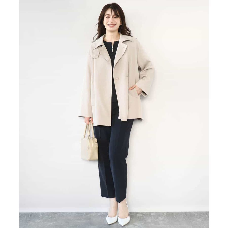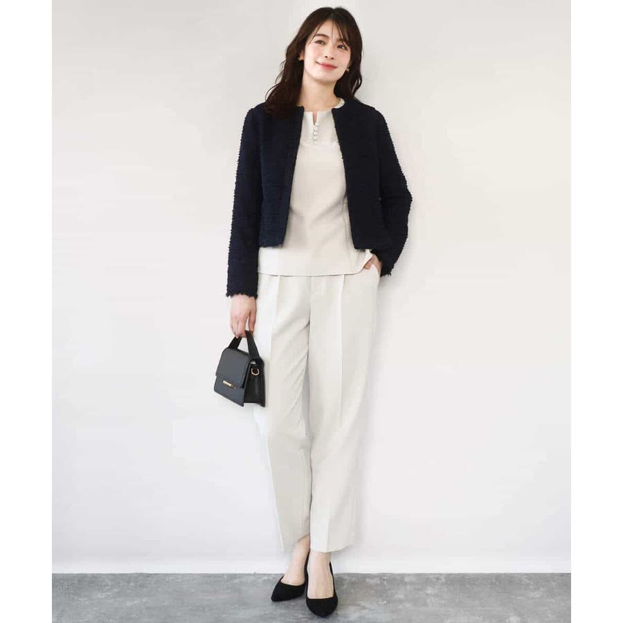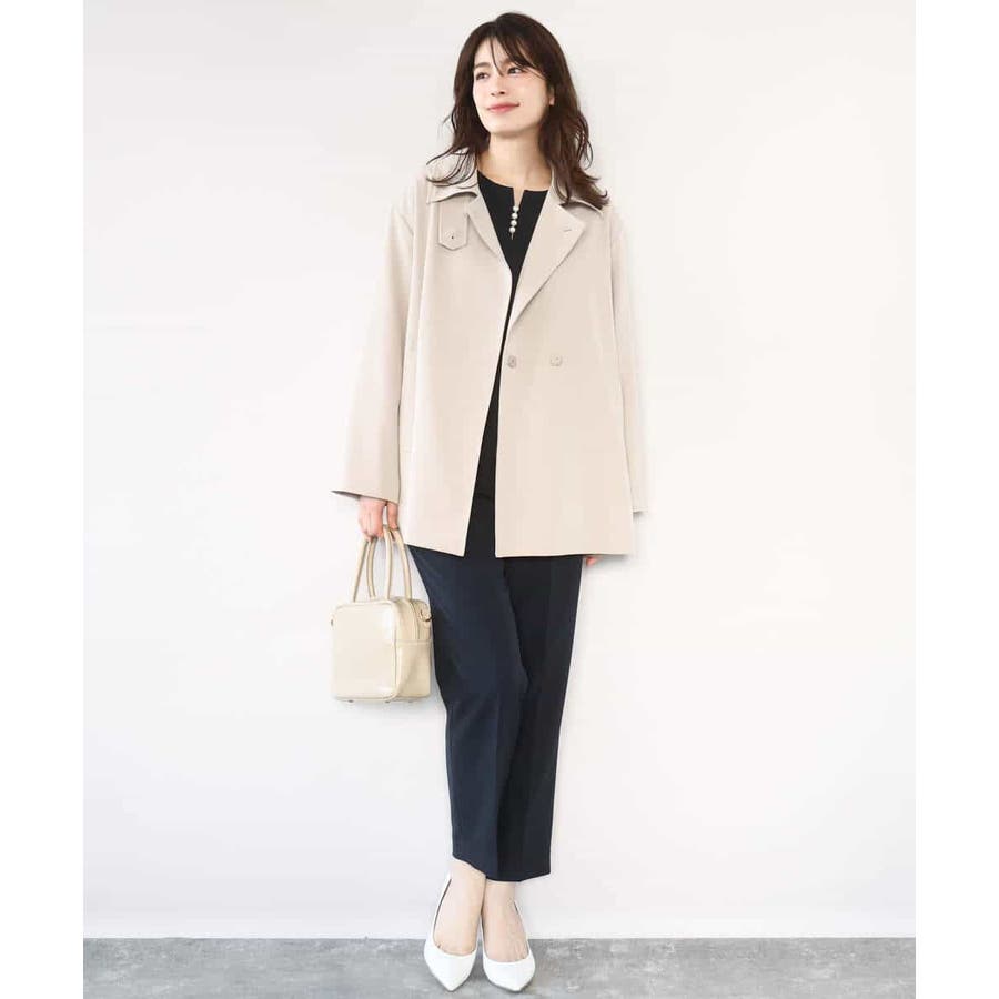 シワになりにくくお手入れもラクなきれい見え素材を使用。なめらかな表面感と程よい光沢感が魅力の素材はシーズン関係なく着用しやすい素材感です。動きやすいストレッチ感とお仕事にも嬉しい防シワ機能付き。