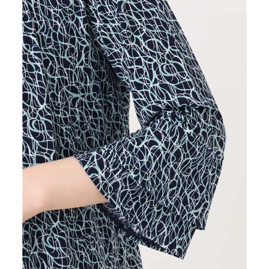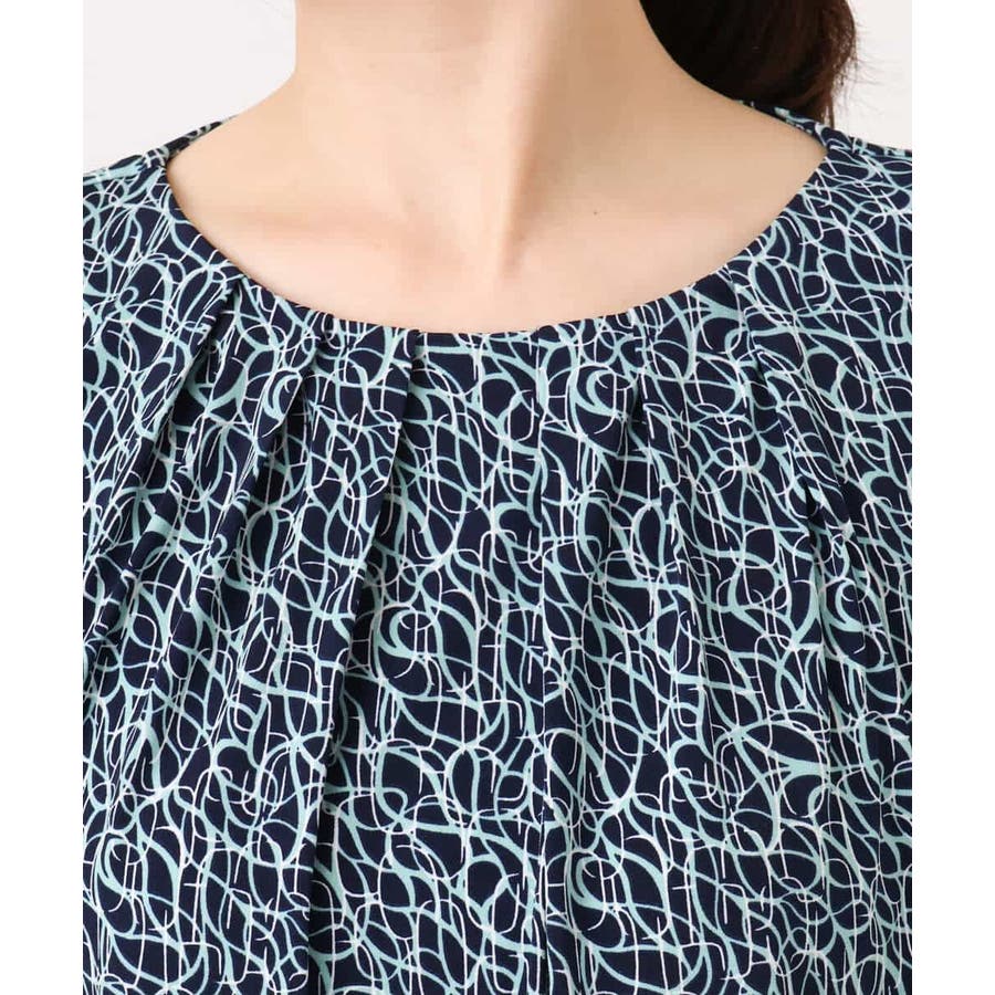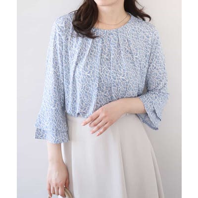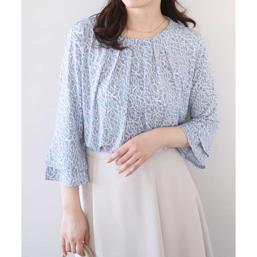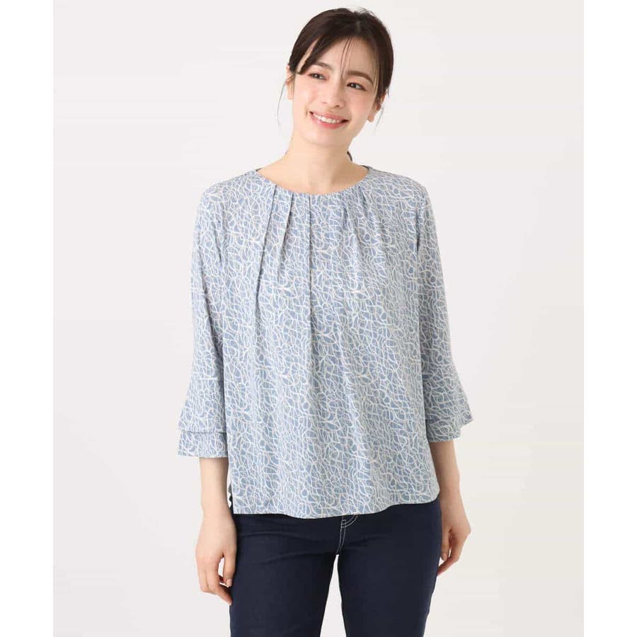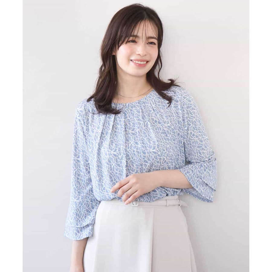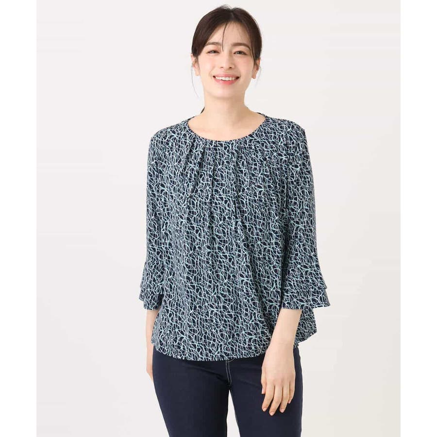 きれいめ上品な雰囲気にぴったりな着る人を選ばないプリントブラウス。カリグラフィーのような女性らしいプリントが特徴です。衿ぐりのタックと袖口の重ねたフレアーデザインが女性らしく着こなせます。