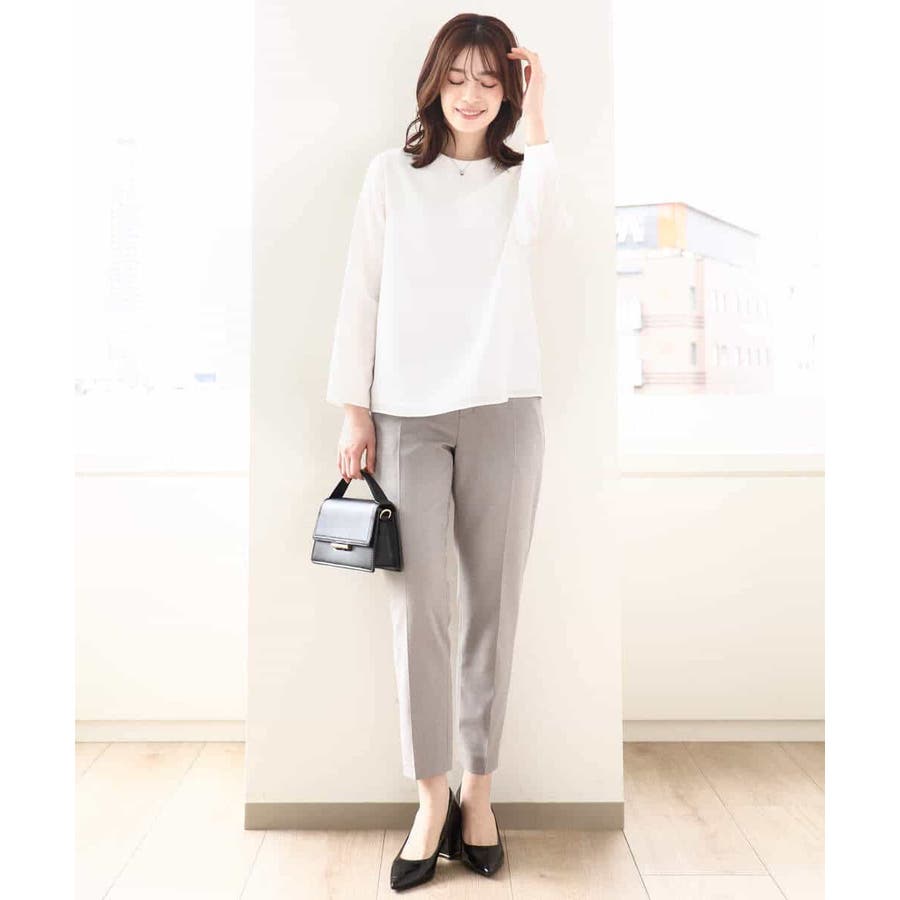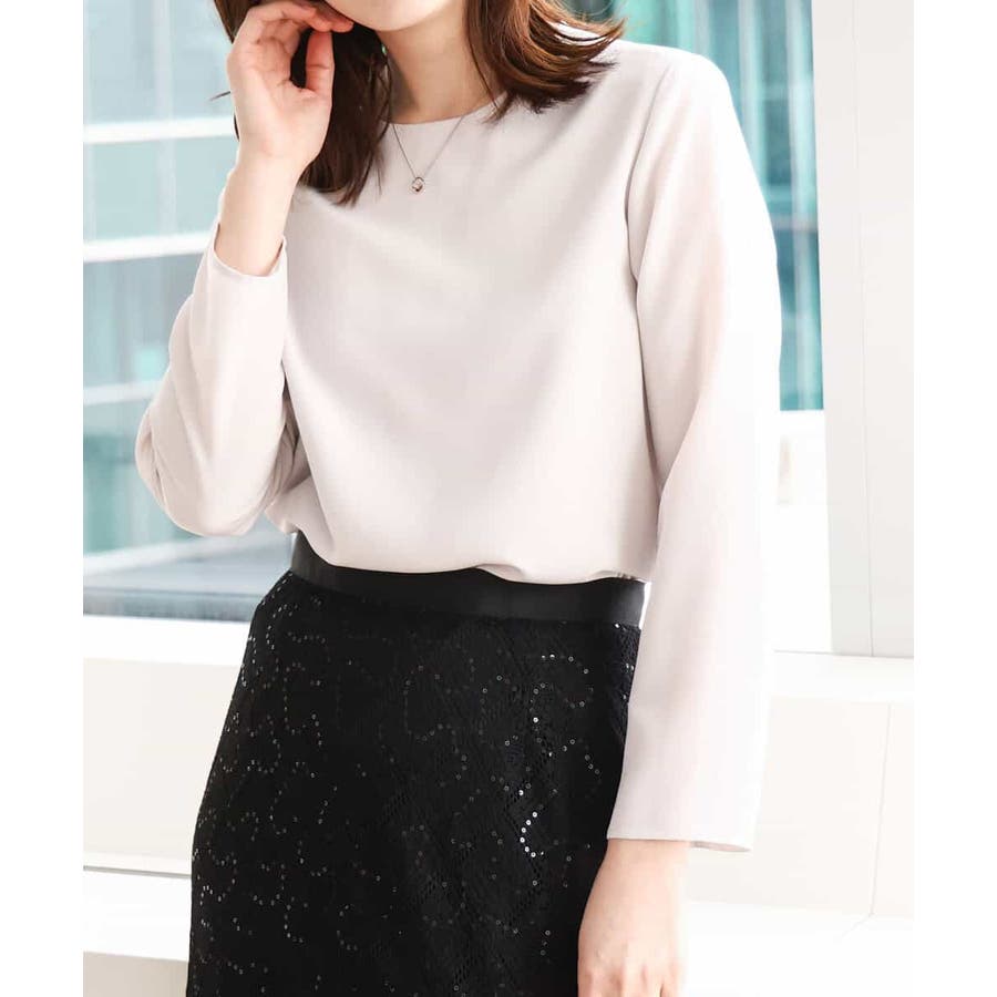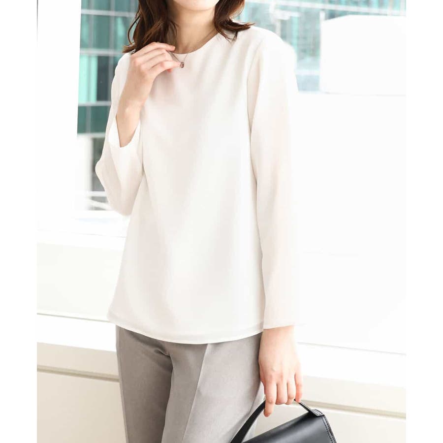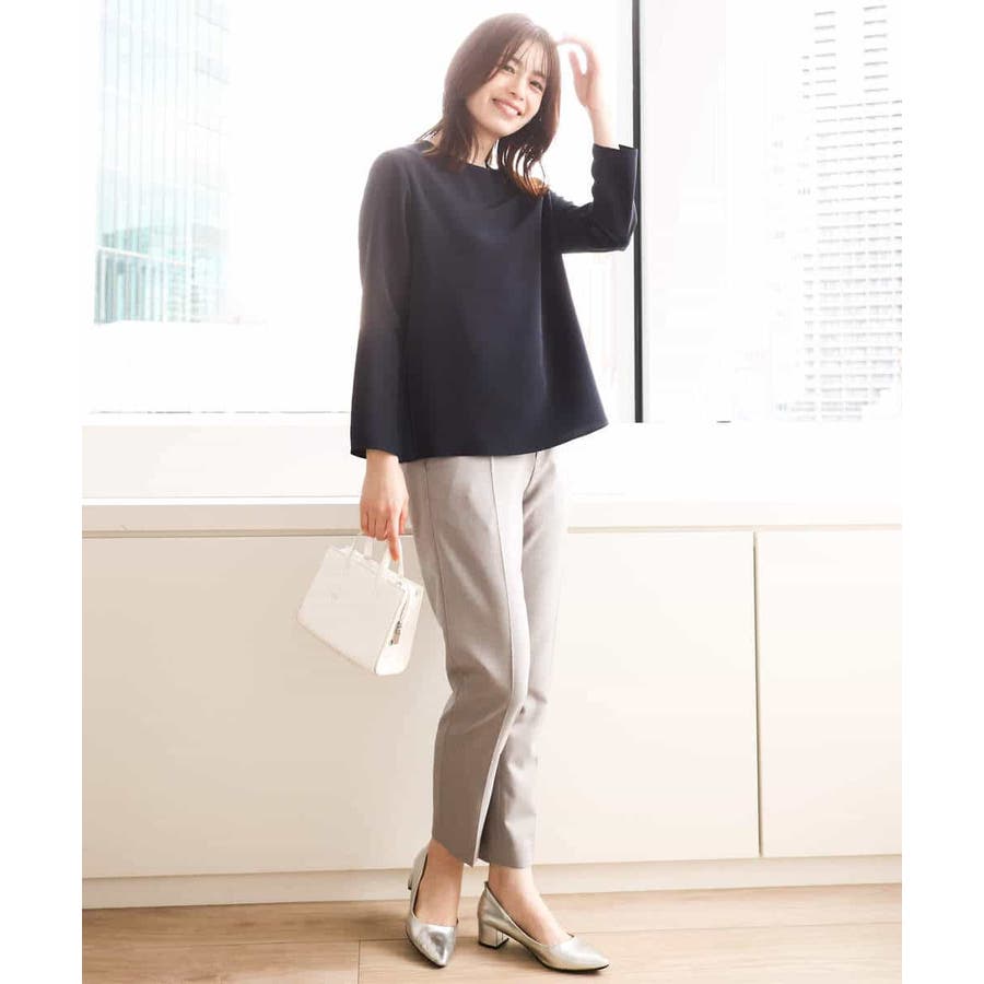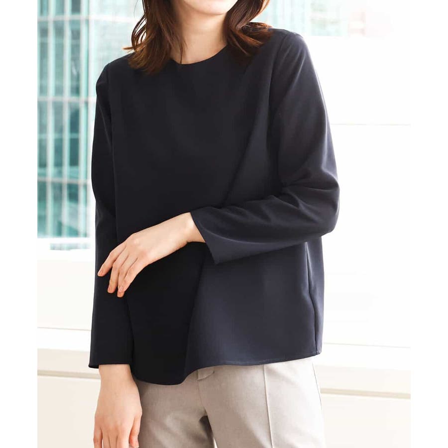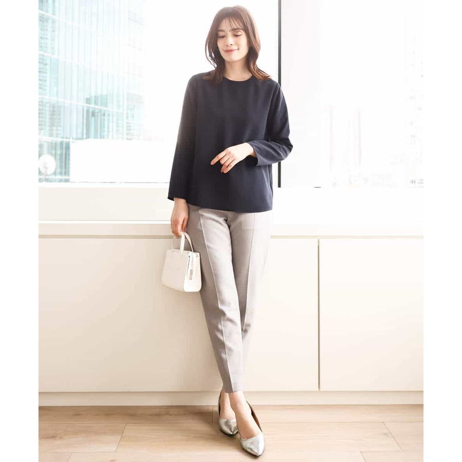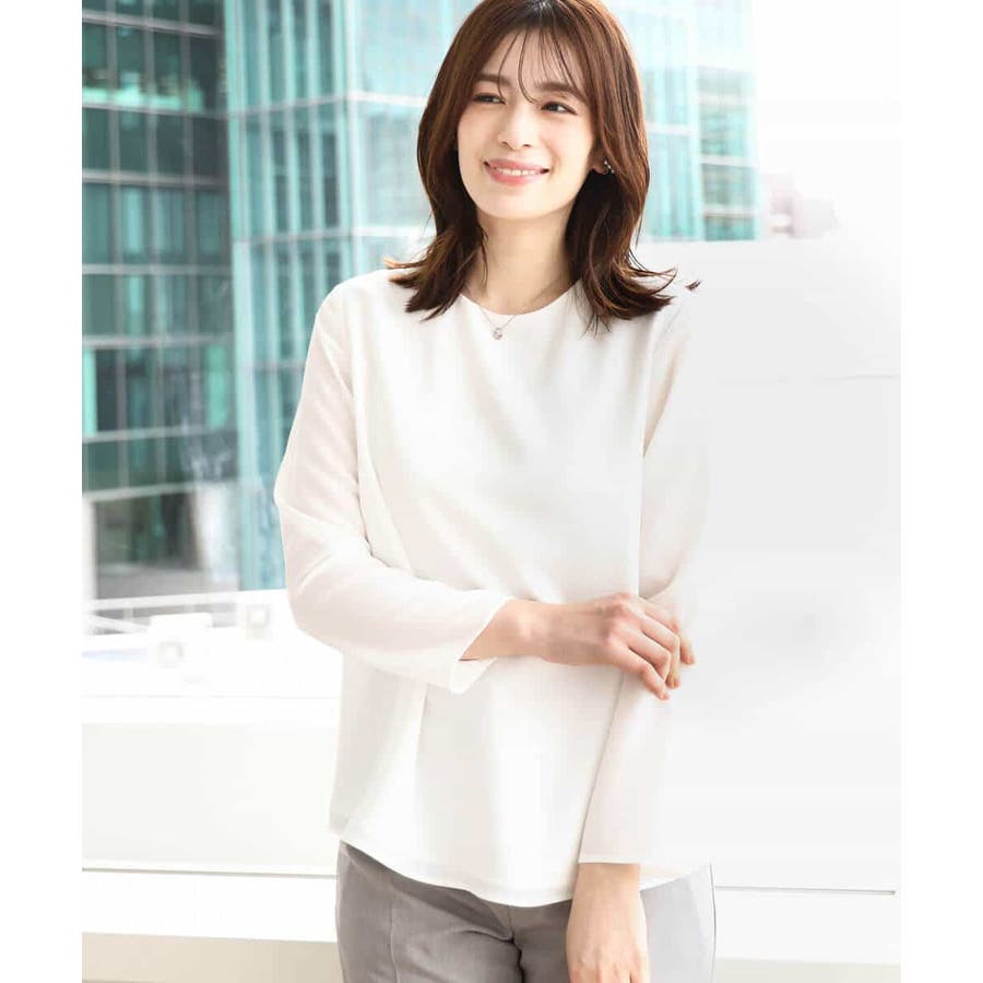 装飾などもないシンプルなクルーネックブラウスは一枚でもインナー使いもおすすめ。スーツジャケットのインナーとしても重宝してくれます。腰周りをふんわりとカバーしてくれるシルエットはパンツとも好相性。