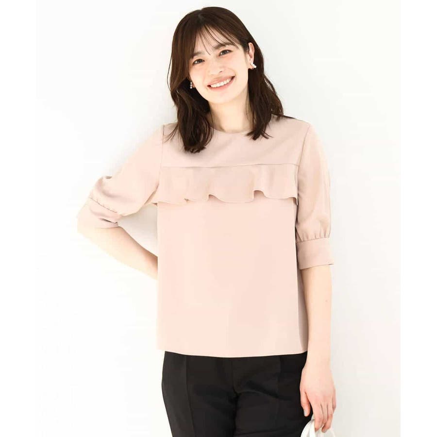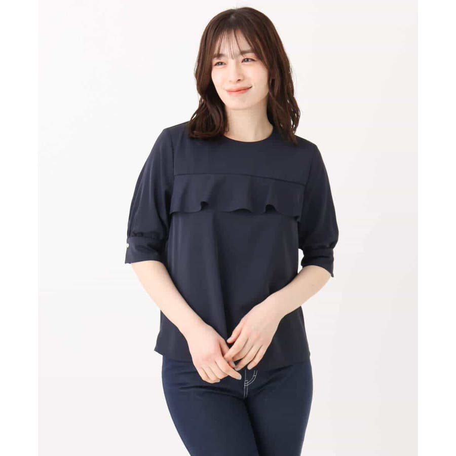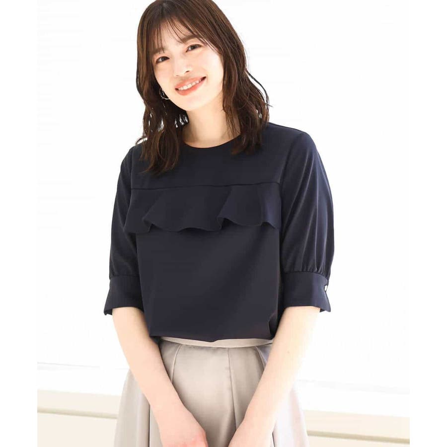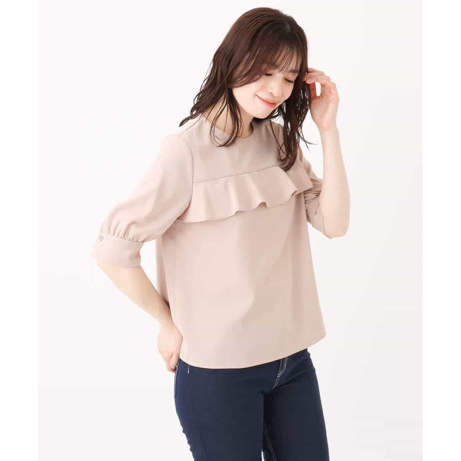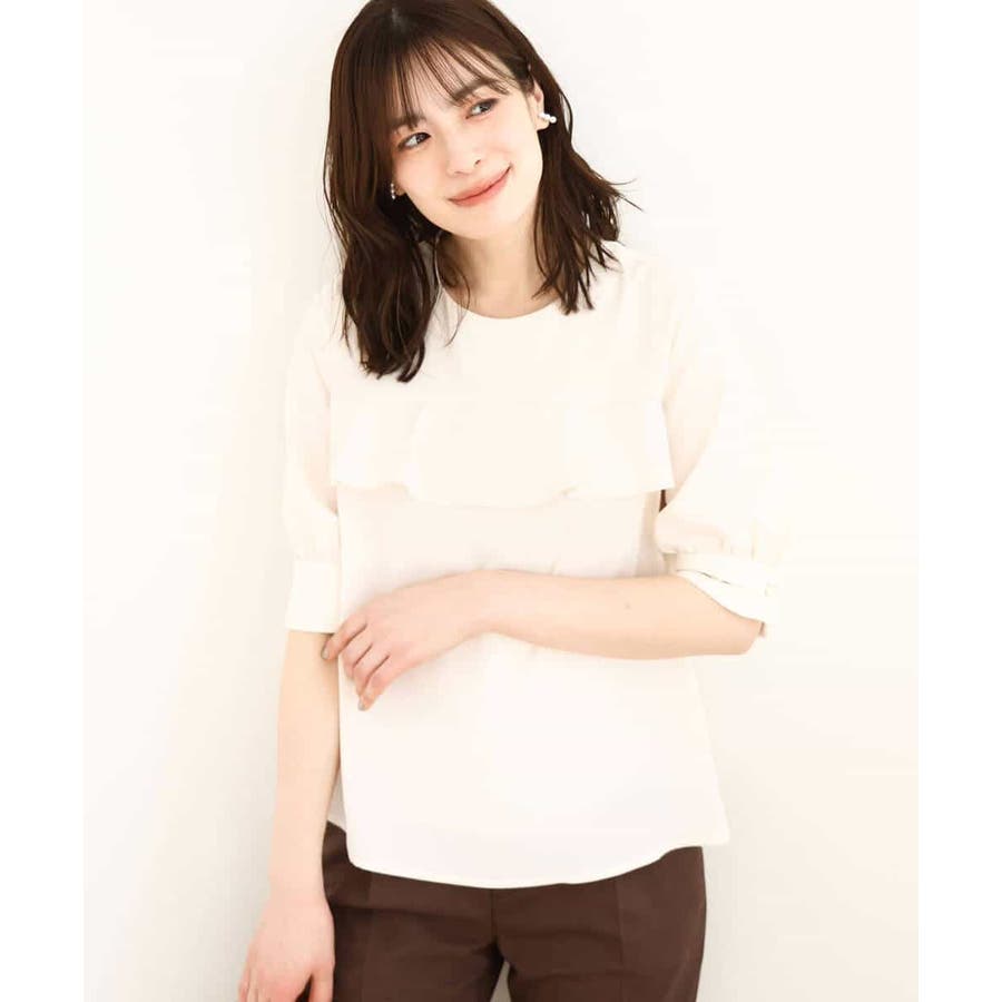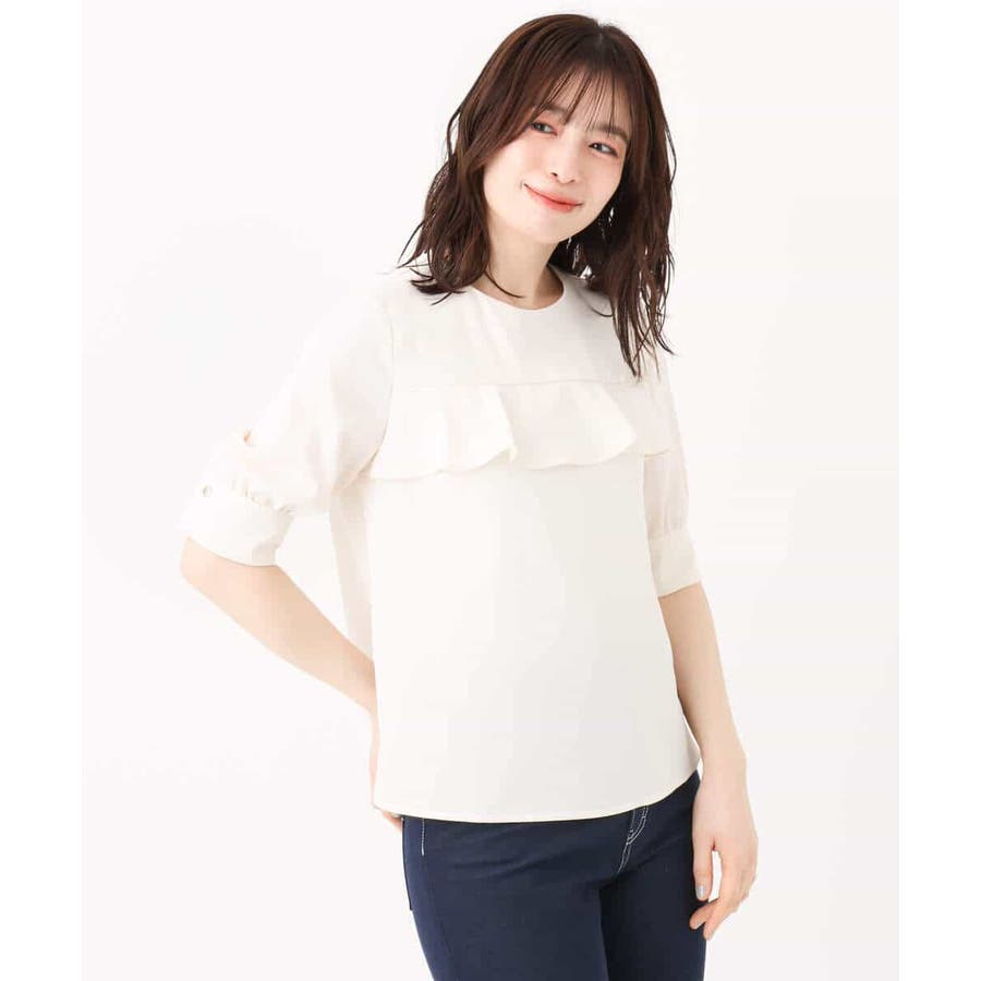 前ヨーク部分を二重にした透け感が気になりにくいデザインが嬉しいブラウス。胸元のフリルが上品で女性らしさを引き立てます。袖丈は長めの五分袖で長いシーズンで着こなせるのも嬉しい。