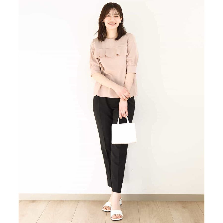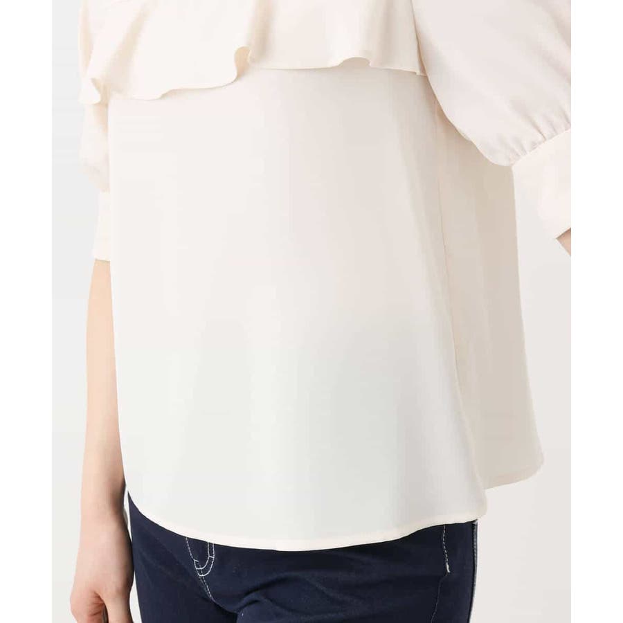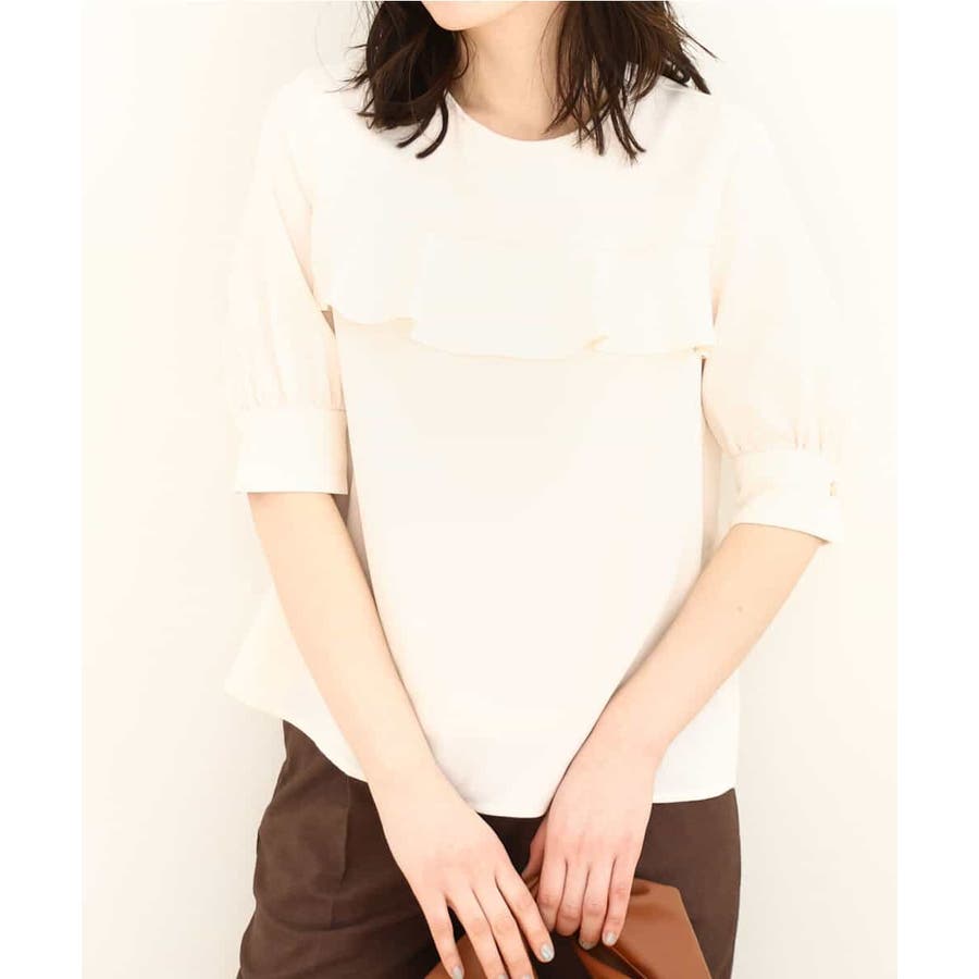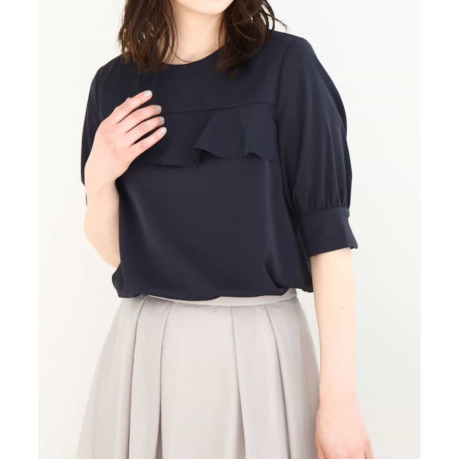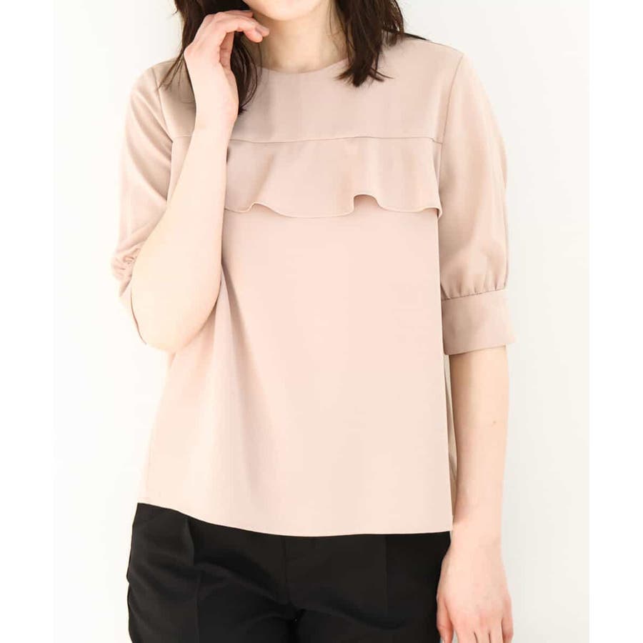 前ヨーク部分を二重にした透け感が気になりにくいデザインが嬉しいブラウス。胸元のフリルが上品で女性らしさを引き立てます。袖丈は長めの五分袖で長いシーズンで着こなせるのも嬉しい。