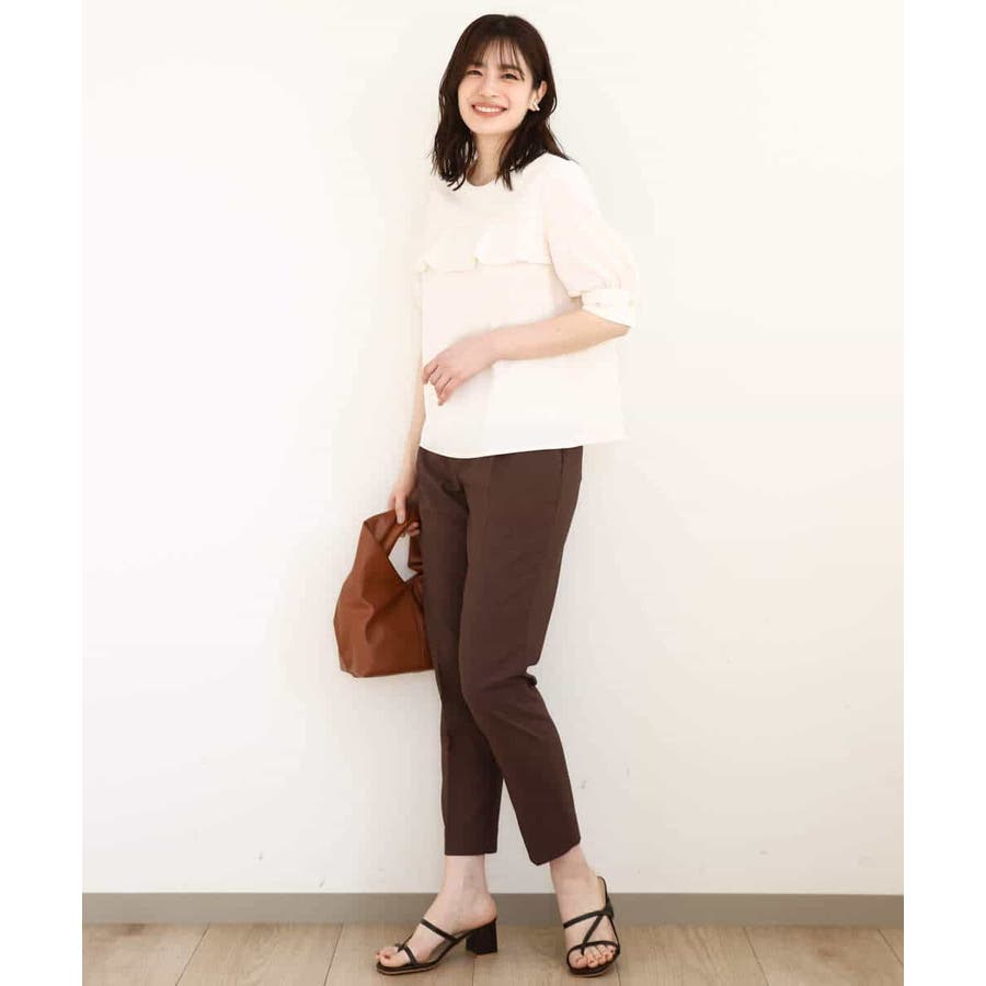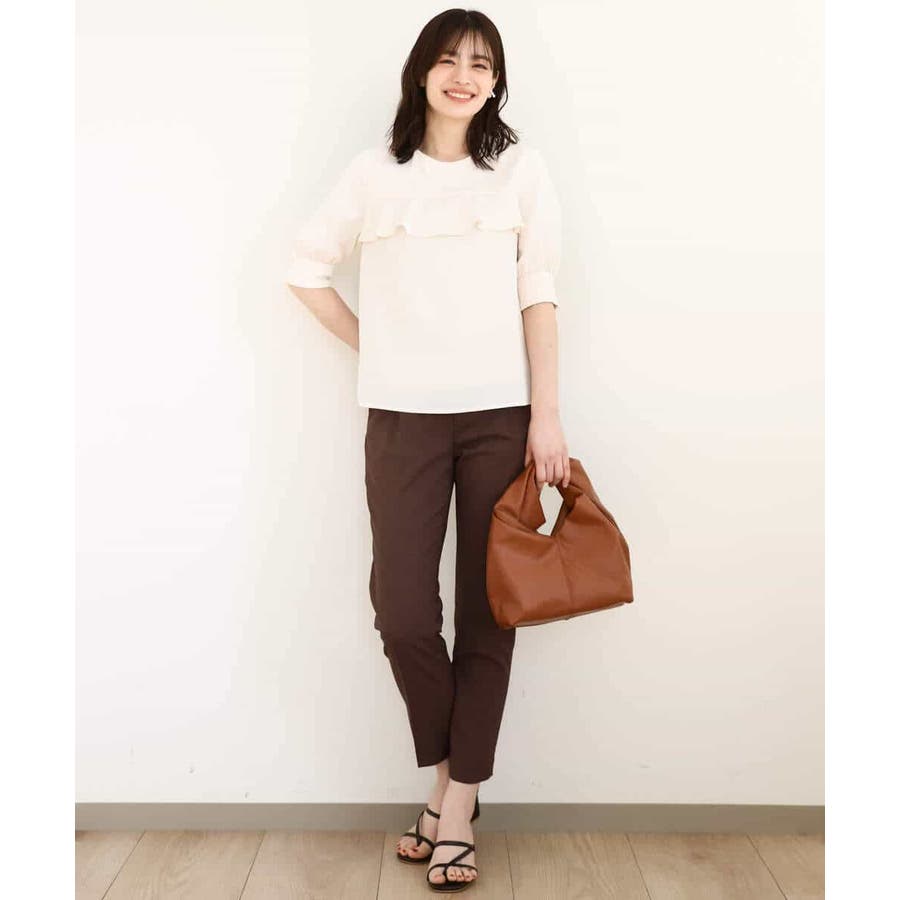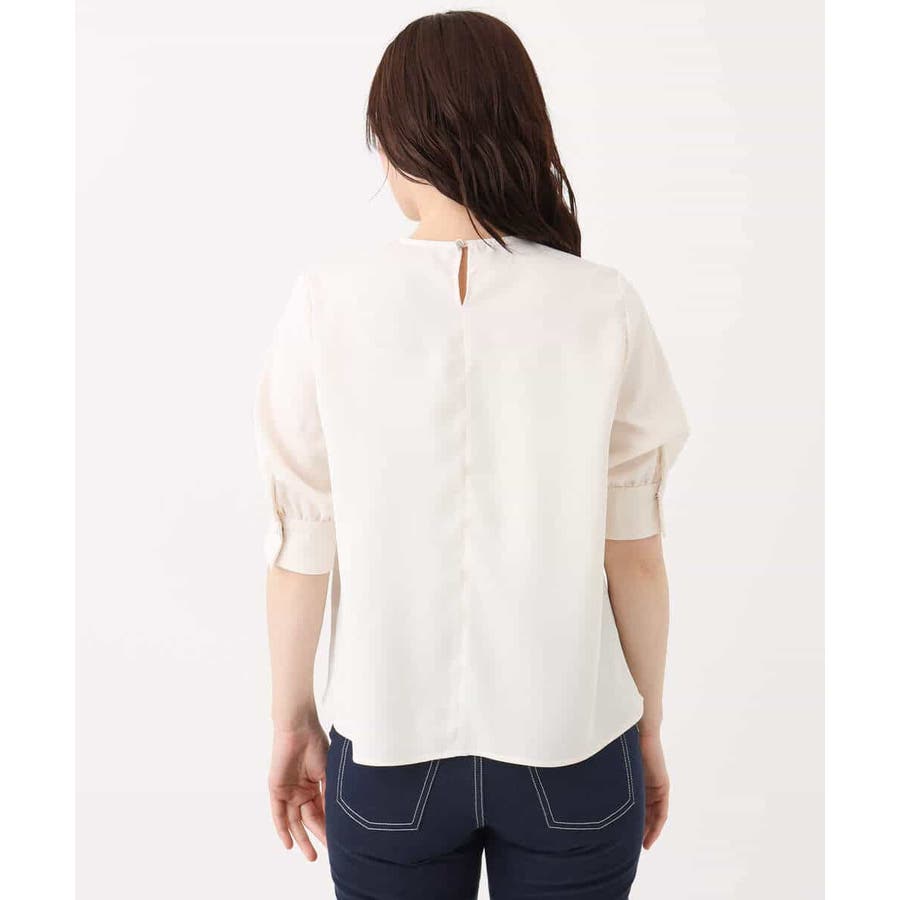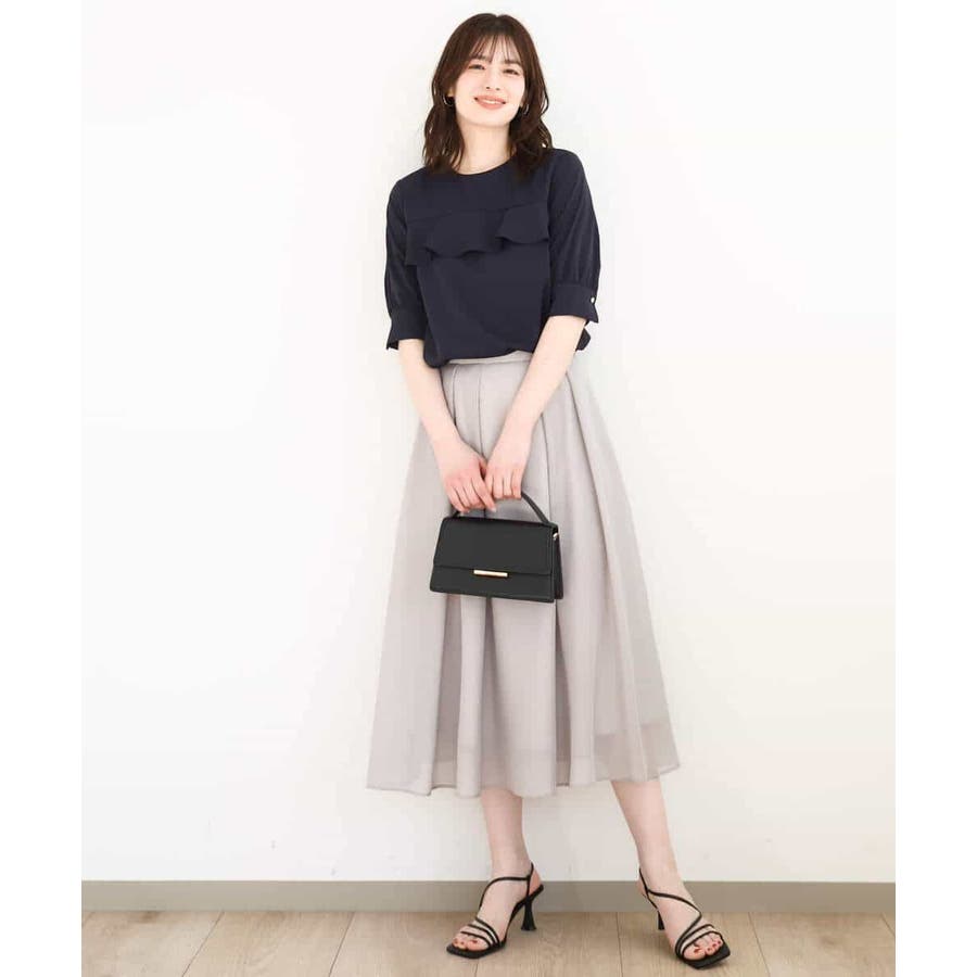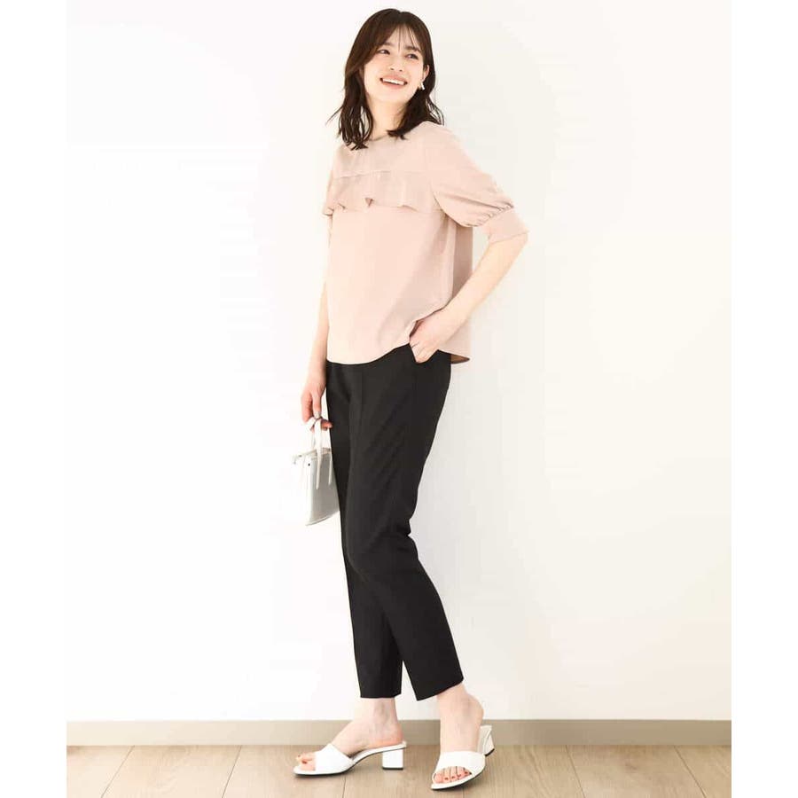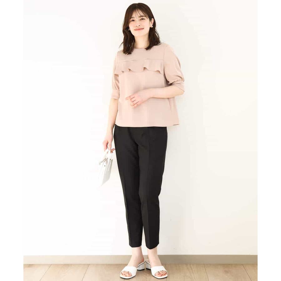 前ヨーク部分を二重にした透け感が気になりにくいデザインが嬉しいブラウス。胸元のフリルが上品で女性らしさを引き立てます。袖丈は長めの五分袖で長いシーズンで着こなせるのも嬉しい。