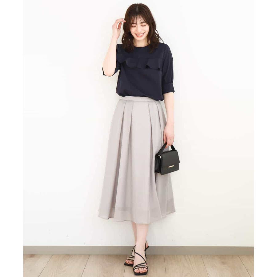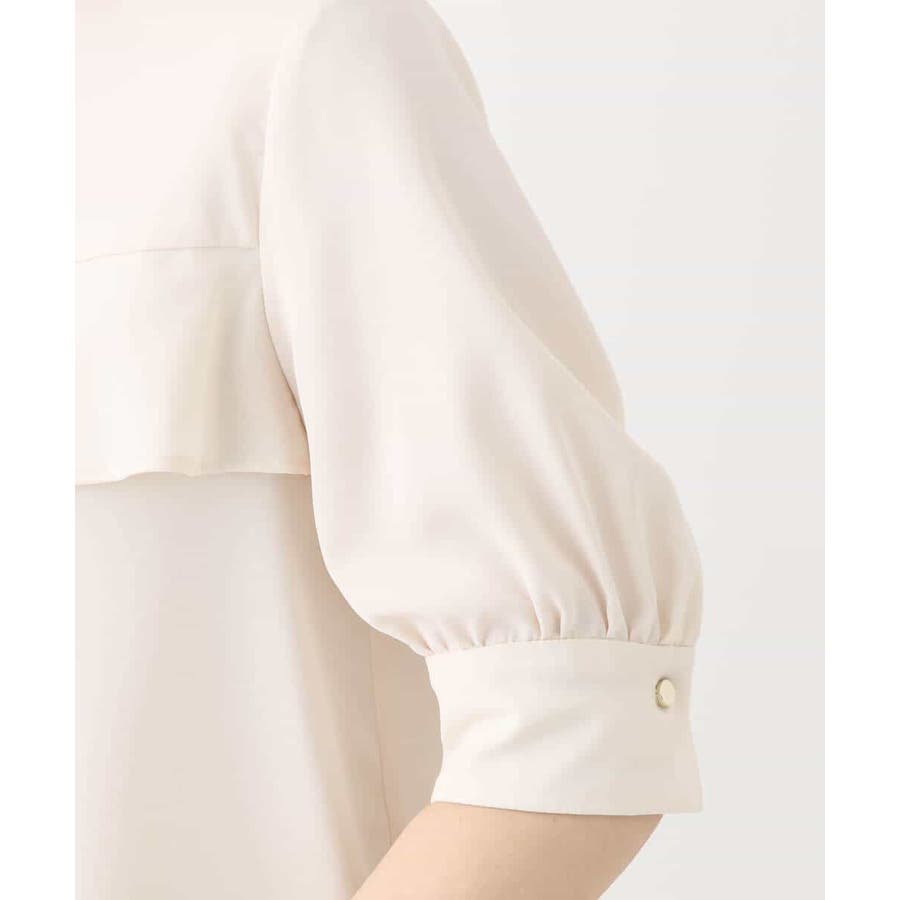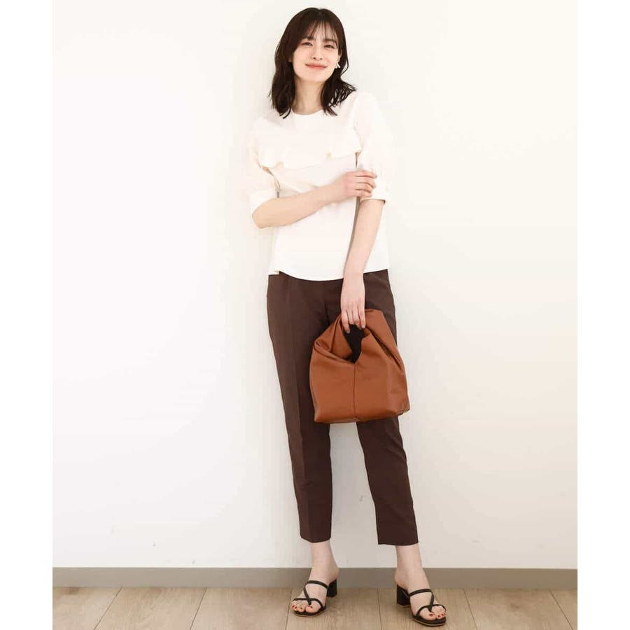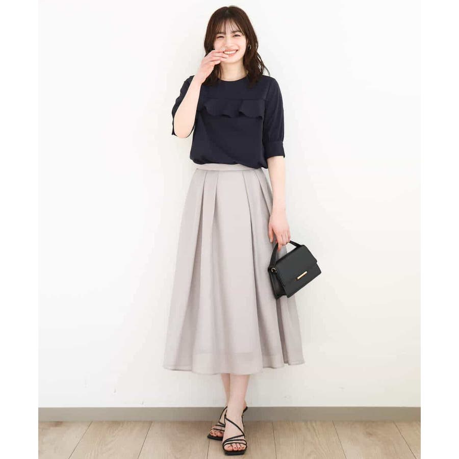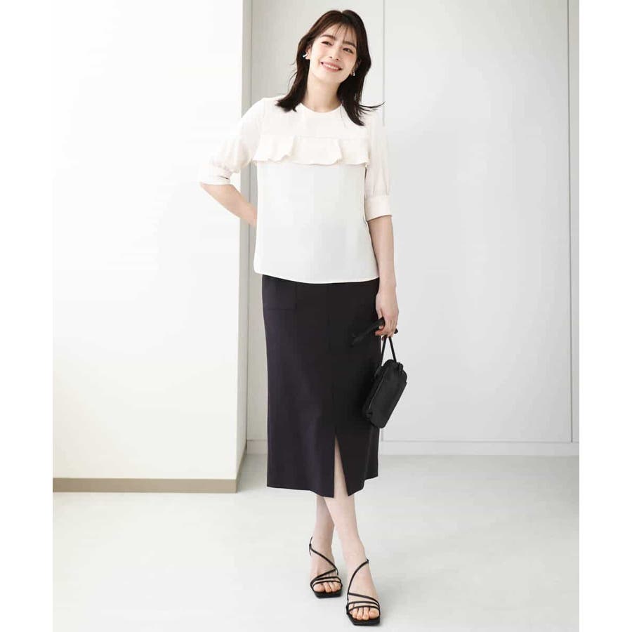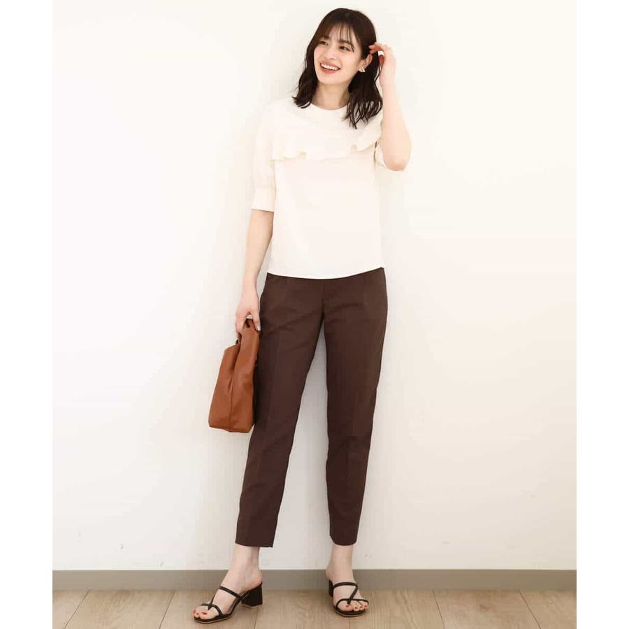 前ヨーク部分を二重にした透け感が気になりにくいデザインが嬉しいブラウス。胸元のフリルが上品で女性らしさを引き立てます。袖丈は長めの五分袖で長いシーズンで着こなせるのも嬉しい。