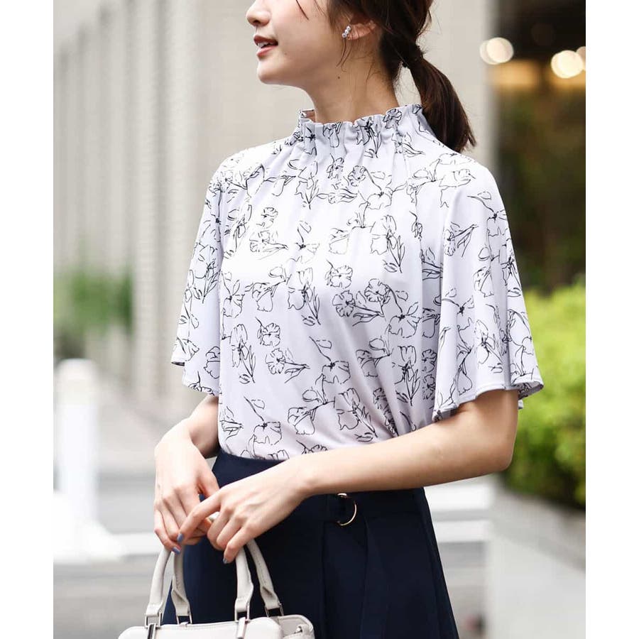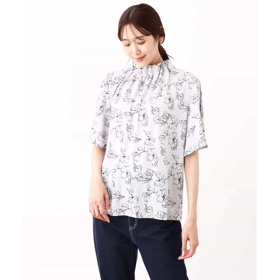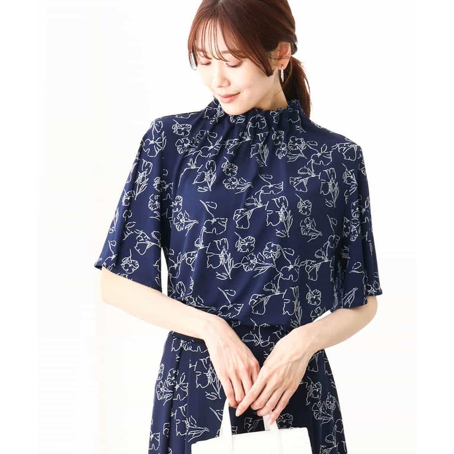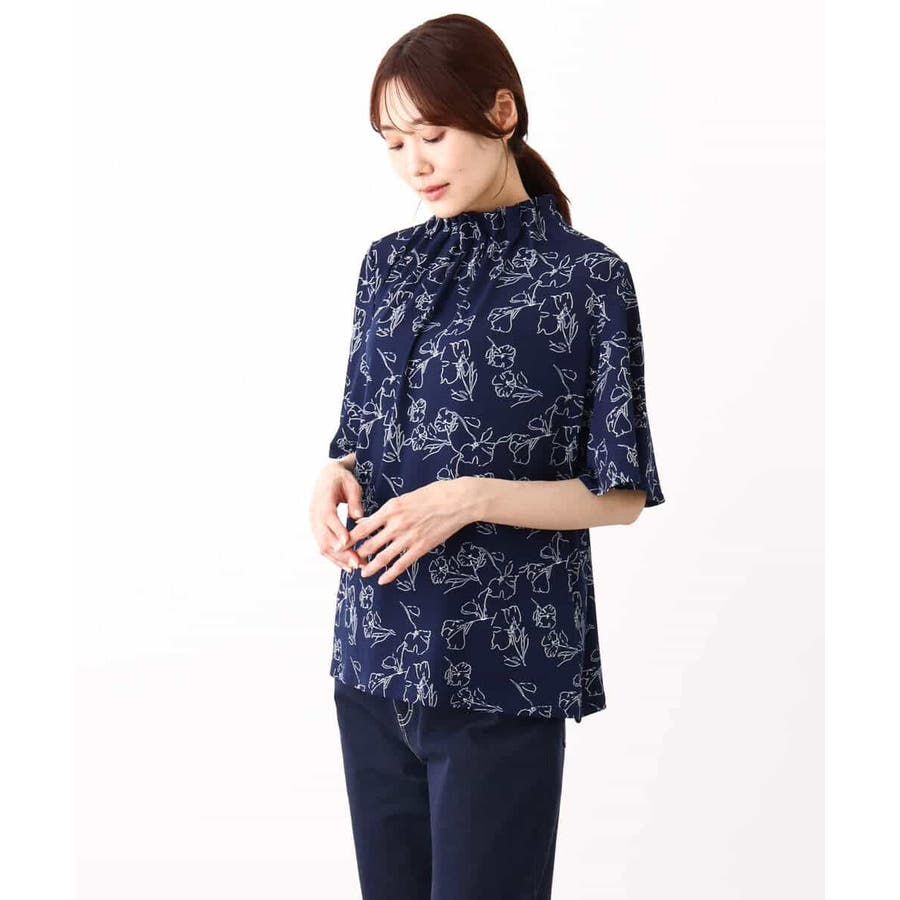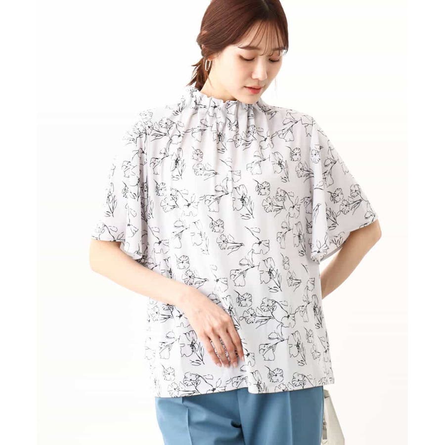 ペンで描いたような繊細な花柄が女性らしいブラウス。きれいに立ち上がるネックのタックがポイントです。フレアースリーブは華やかで涼しげに。