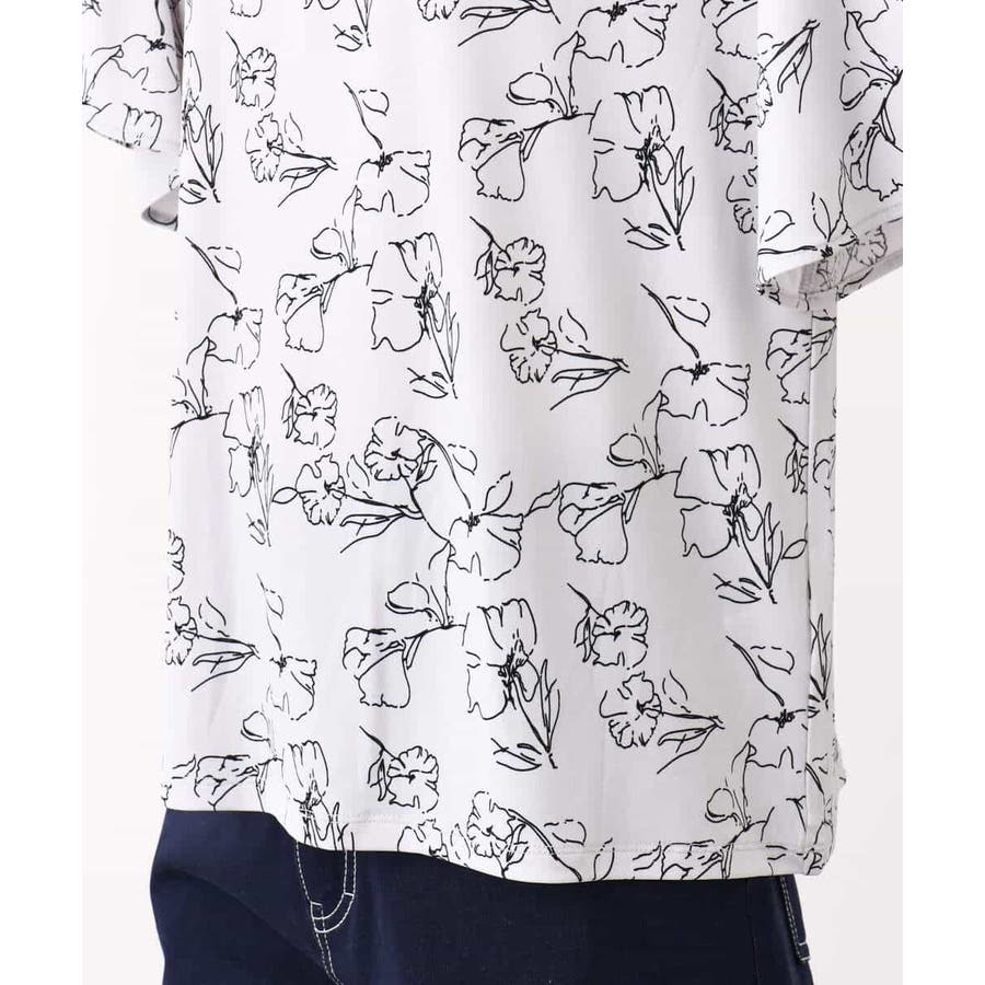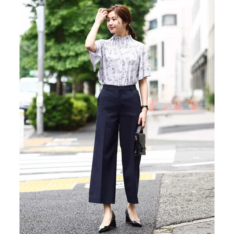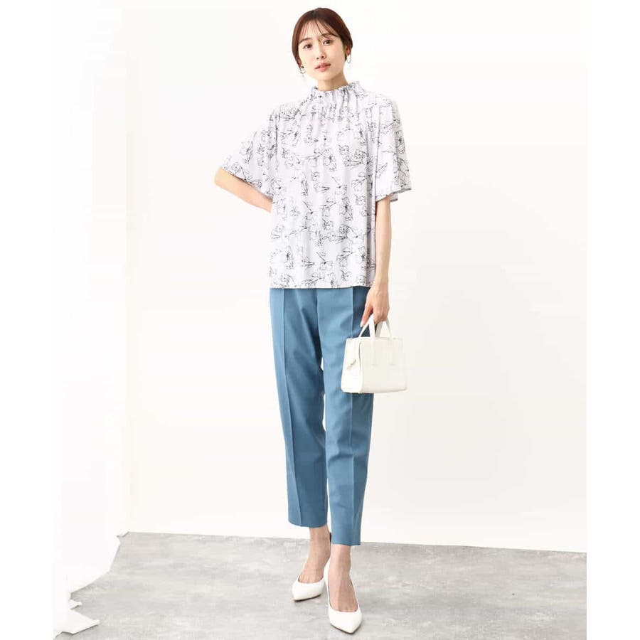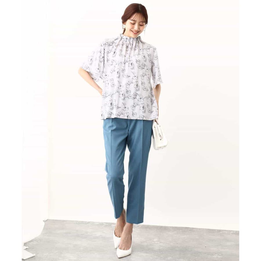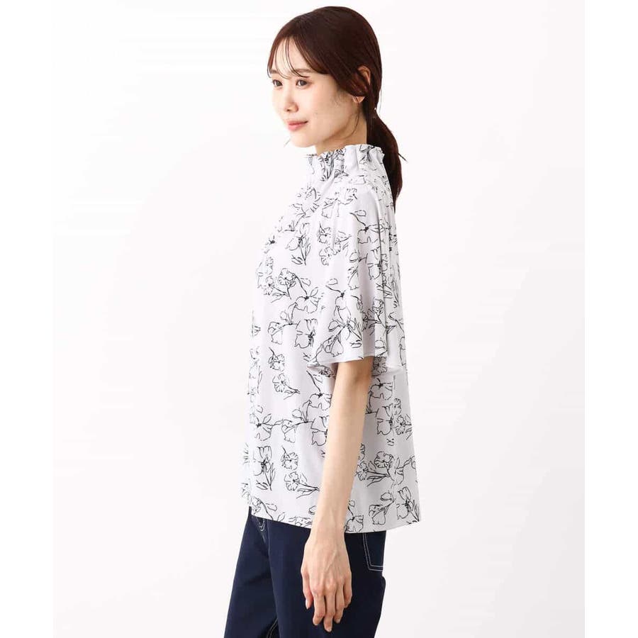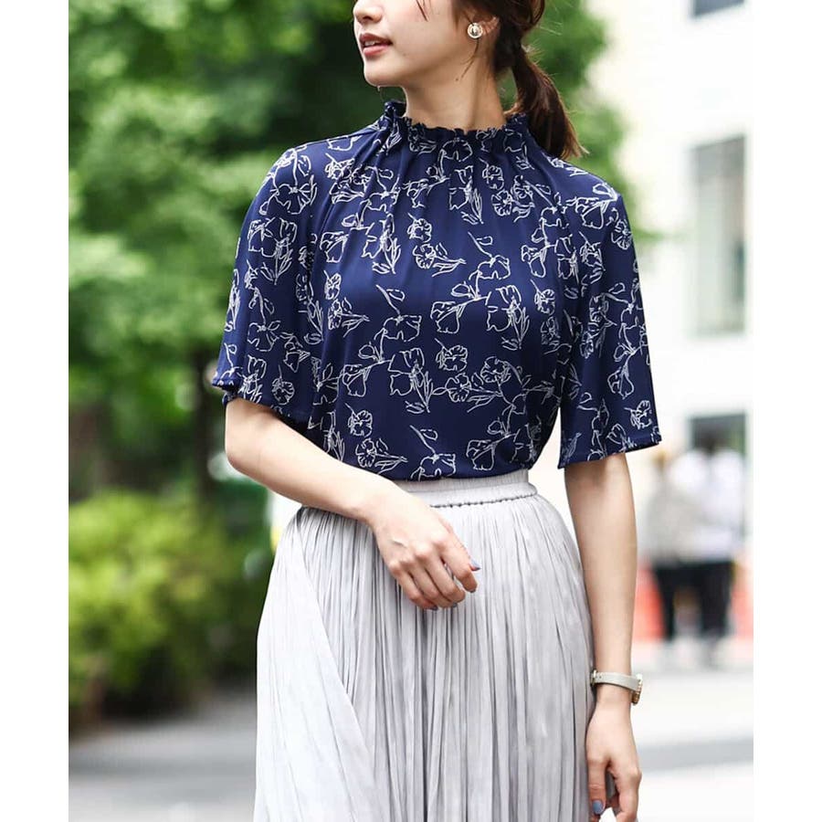 ペンで描いたような繊細な花柄が女性らしいブラウス。きれいに立ち上がるネックのタックがポイントです。フレアースリーブは華やかで涼しげに。