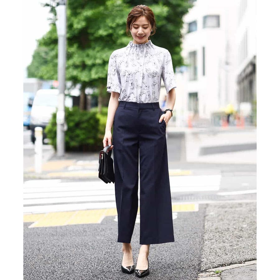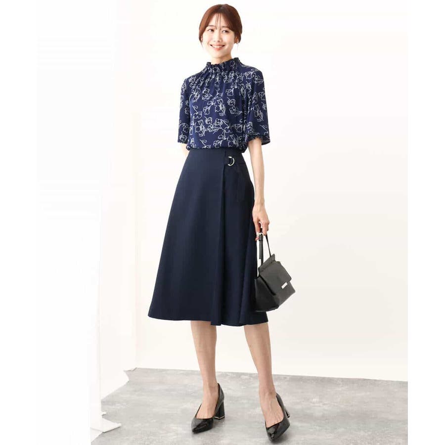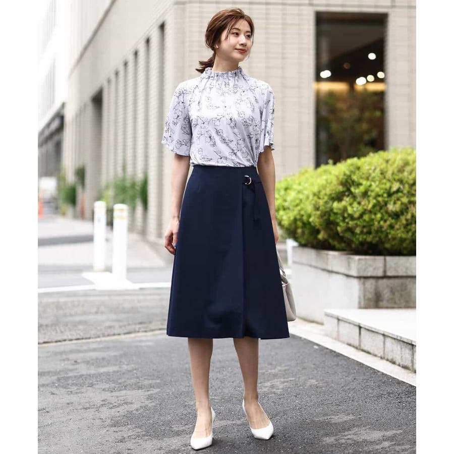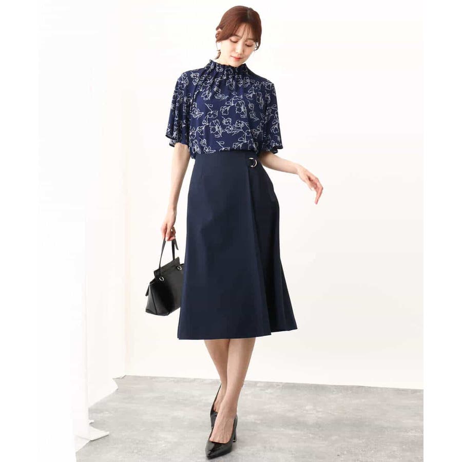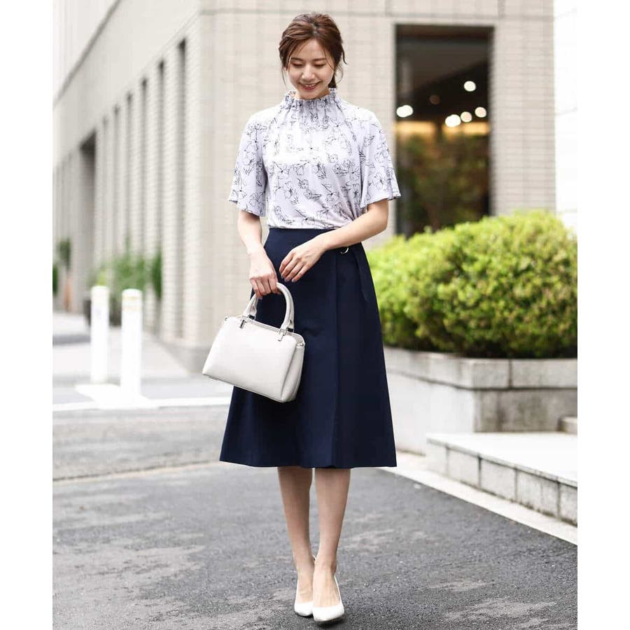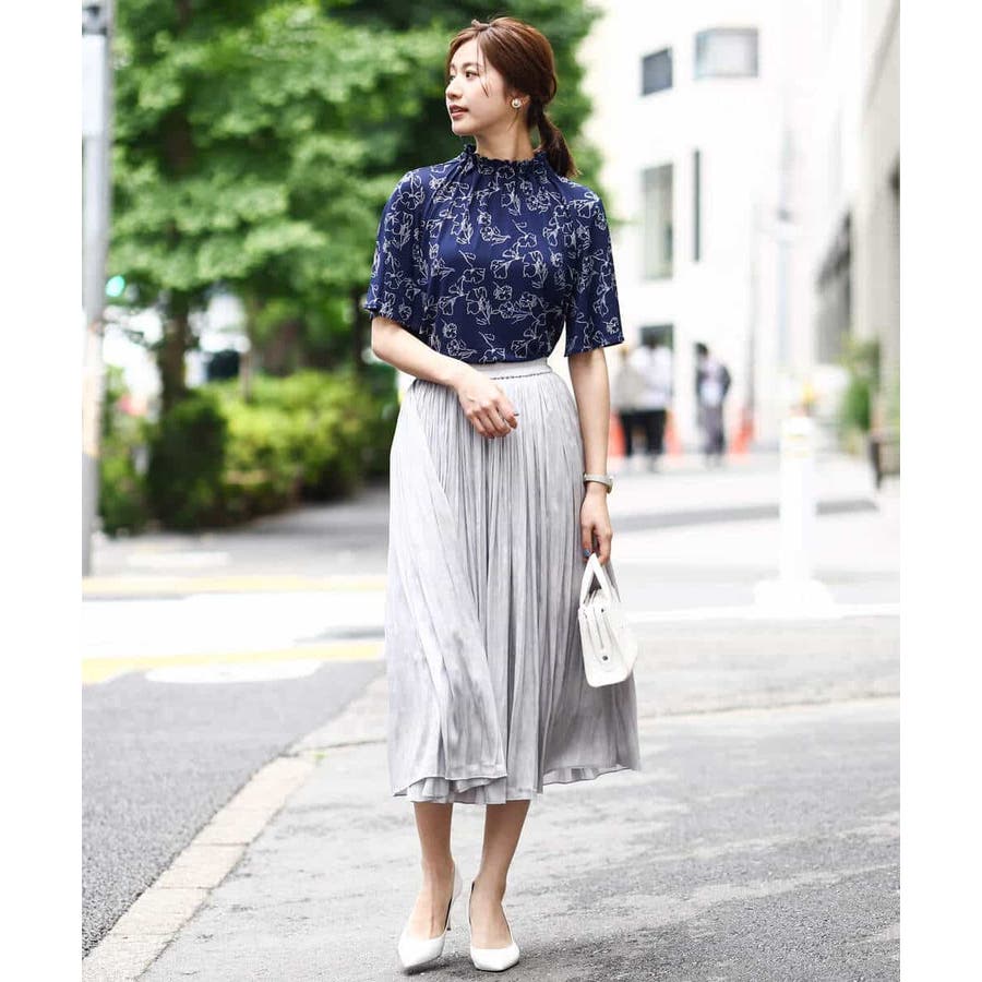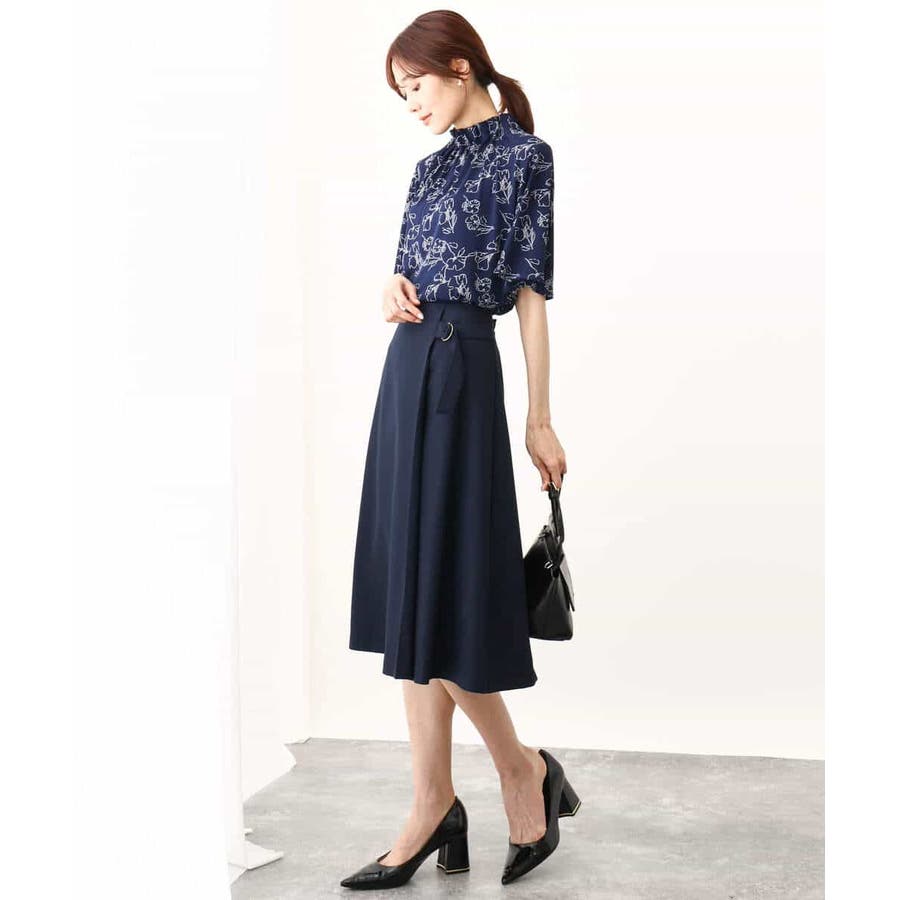 同柄のスカートとセットアップでワンピース見えの着こなしも楽しめます。薄手の素材はボトムにインしてもすっきりと決まります。パンツもスカートもボトムを選ばないブラウスはオンのきれいめスタイルにも活躍してくれそう。