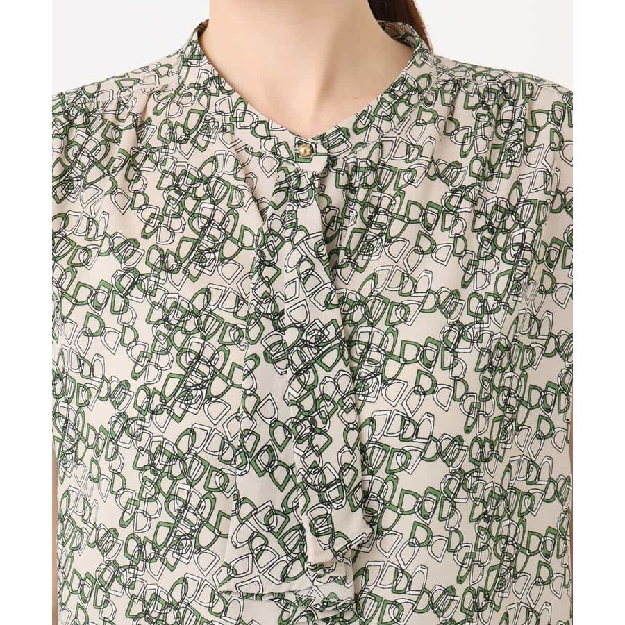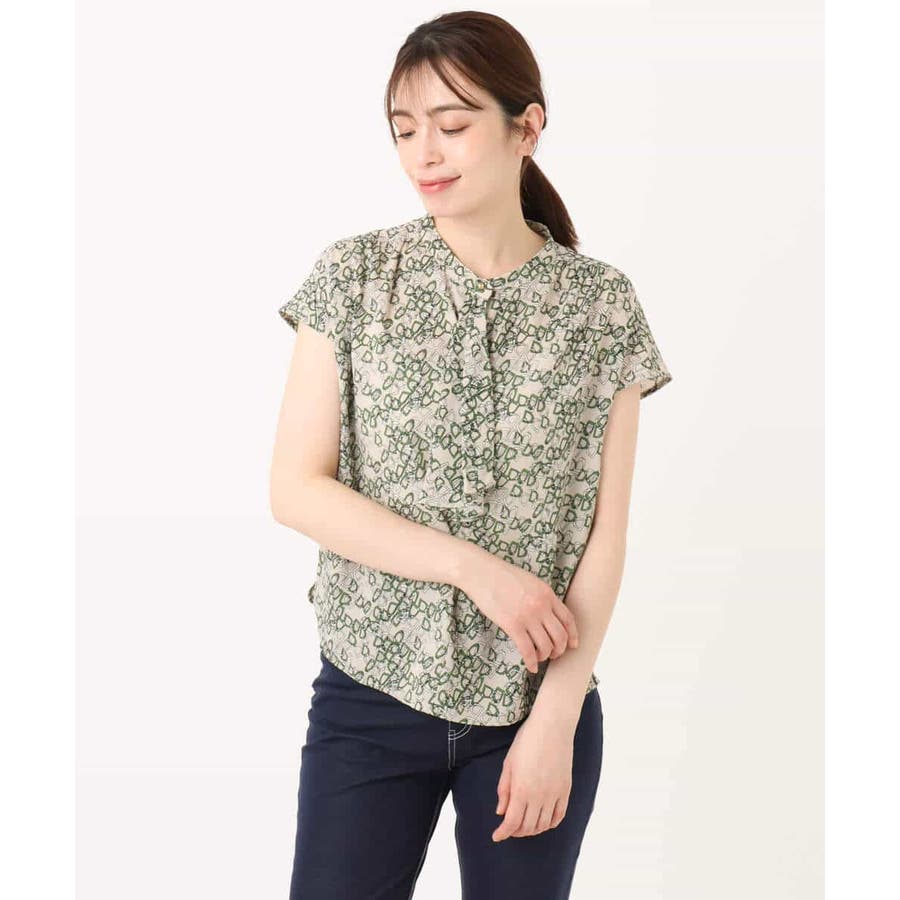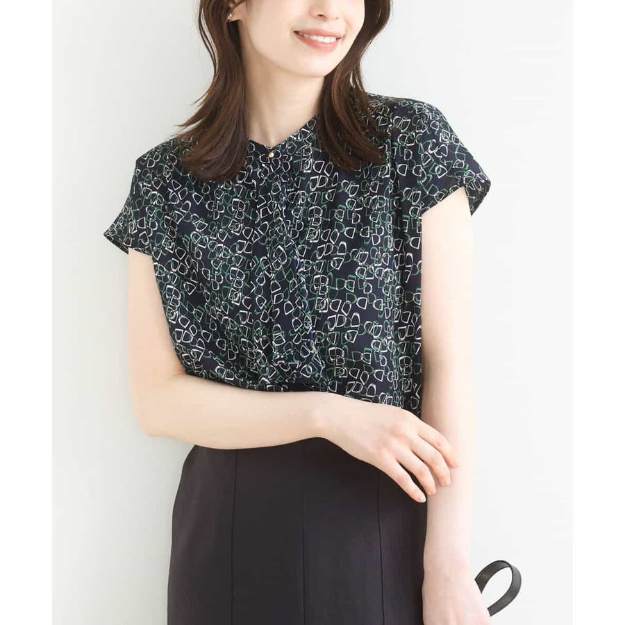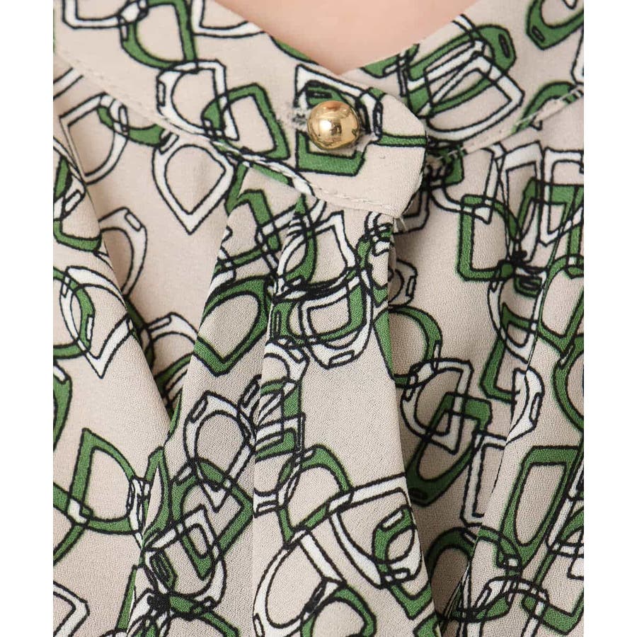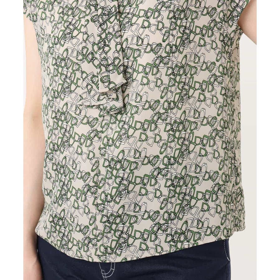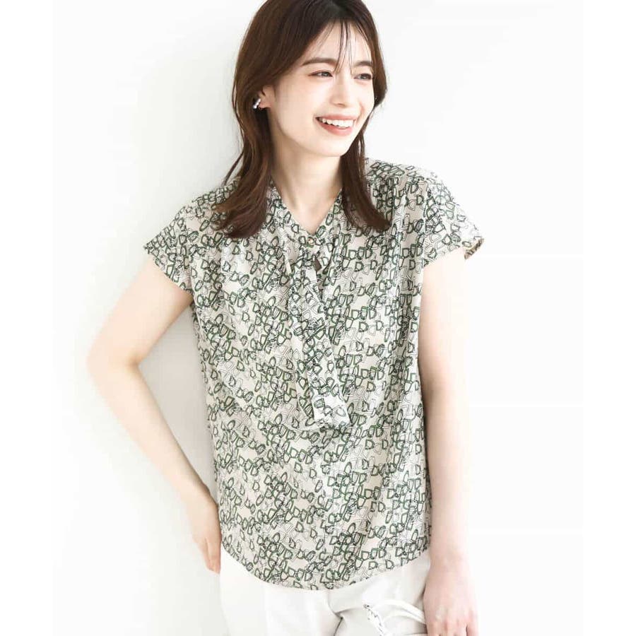 チェーンのようなプリントを落ち着いた色合いで大人な印象に仕上げたブラウス。ボウタイ風のデザインがきちんと感と上品なイメージを与えてくれます。二の腕が気になりにくいよう長めのフレンチスリーブもポイント。