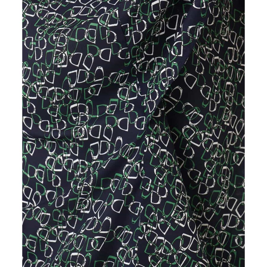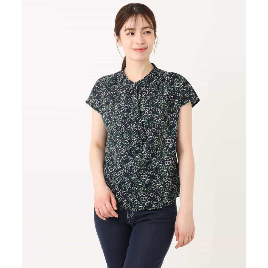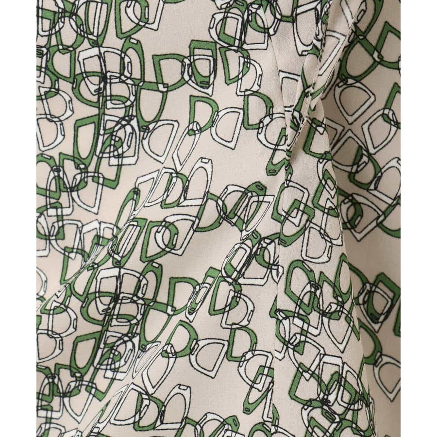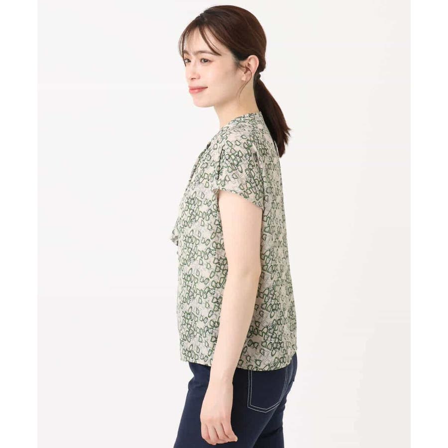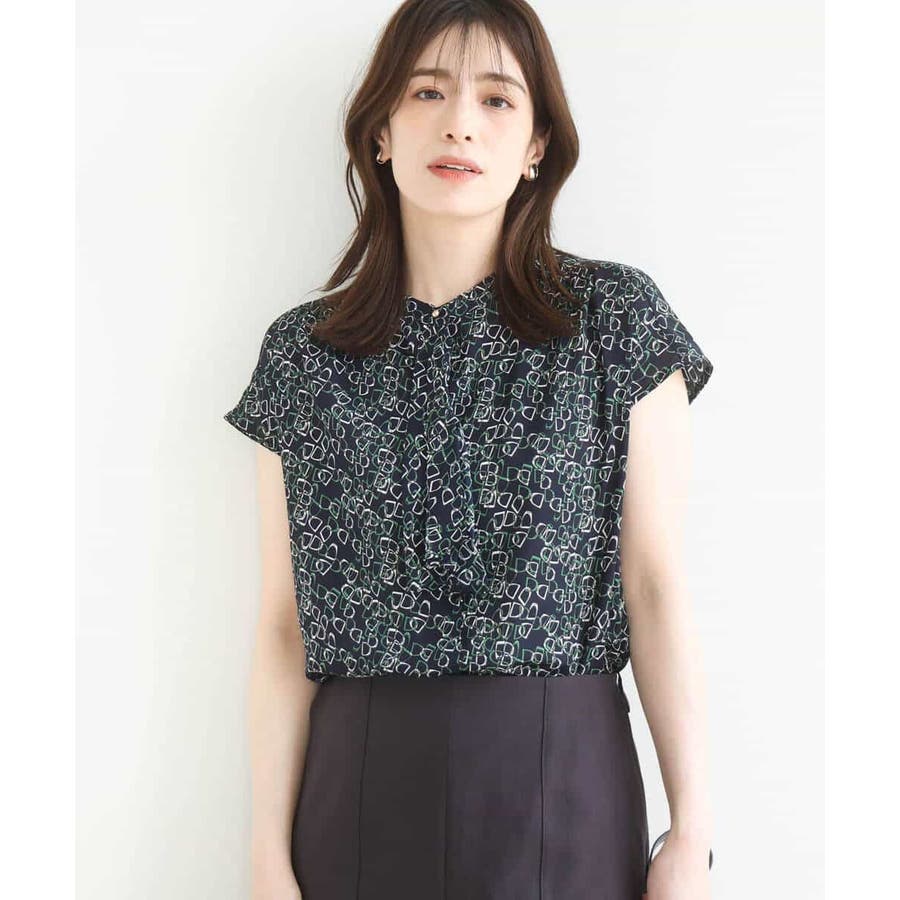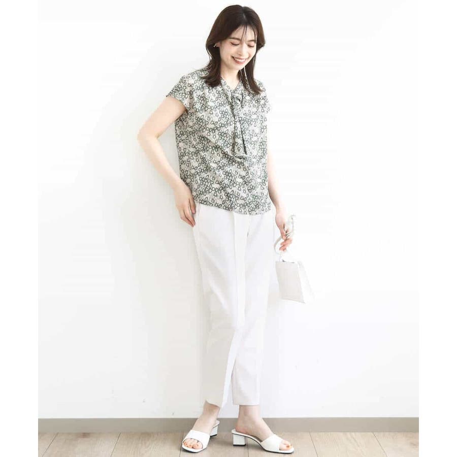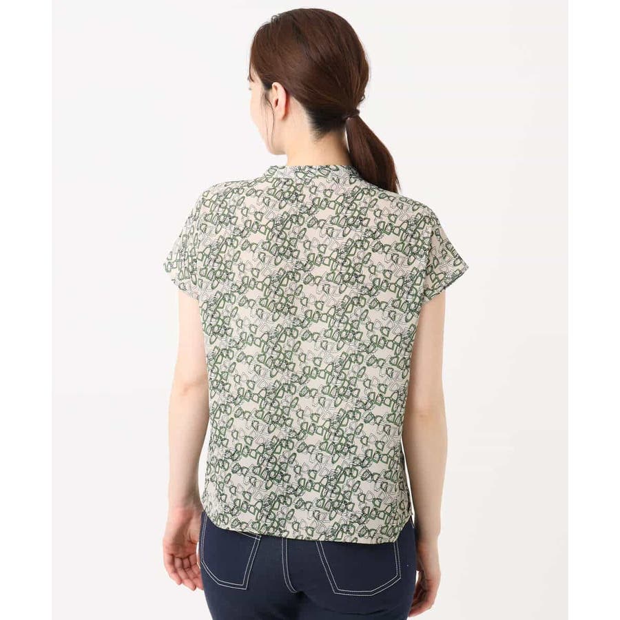 チェーンのようなプリントを落ち着いた色合いで大人な印象に仕上げたブラウス。ボウタイ風のデザインがきちんと感と上品なイメージを与えてくれます。二の腕が気になりにくいよう長めのフレンチスリーブもポイント。