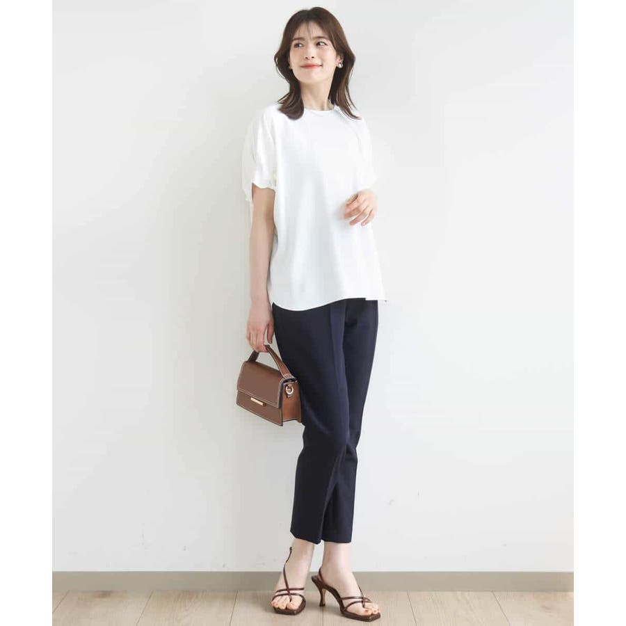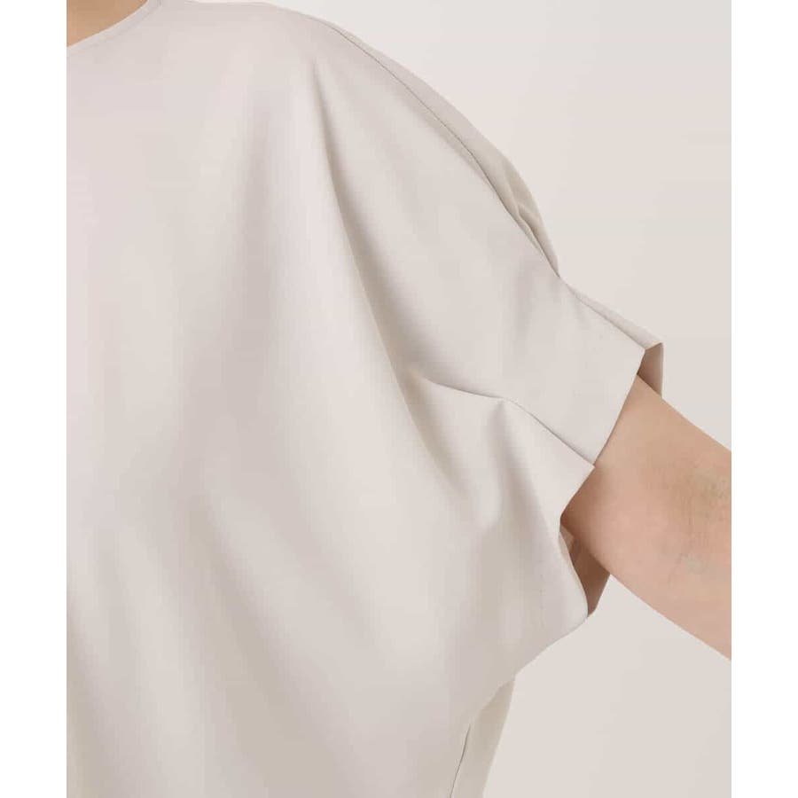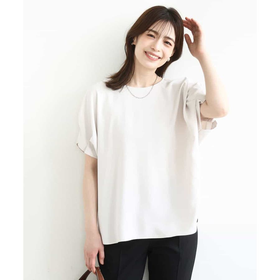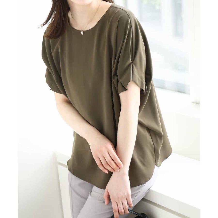 立体的なタックスリーブがデザインポイントのブラウス。顔周りがすっきりと見えるクルーネックデザインです。