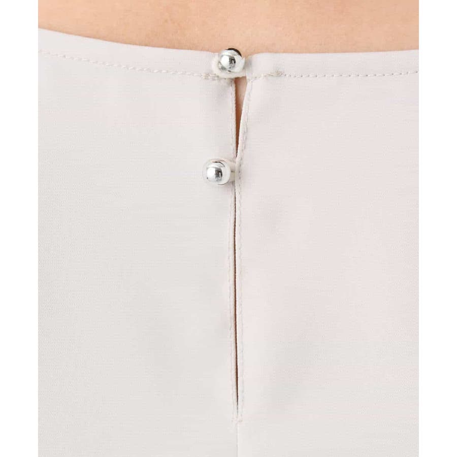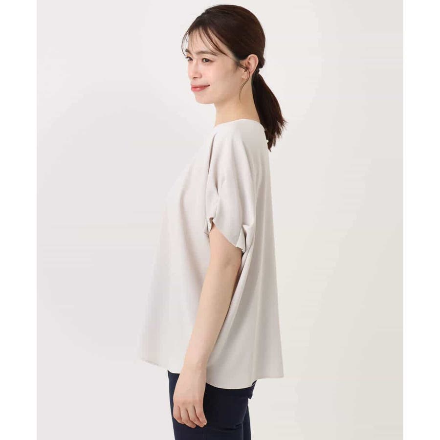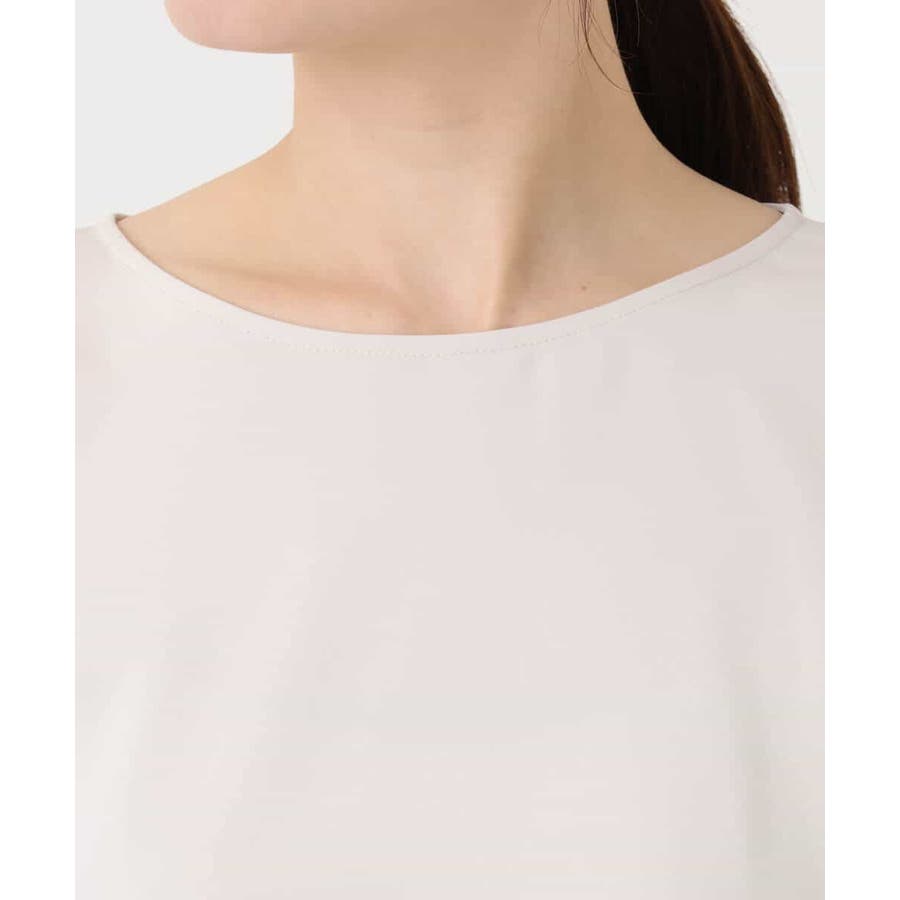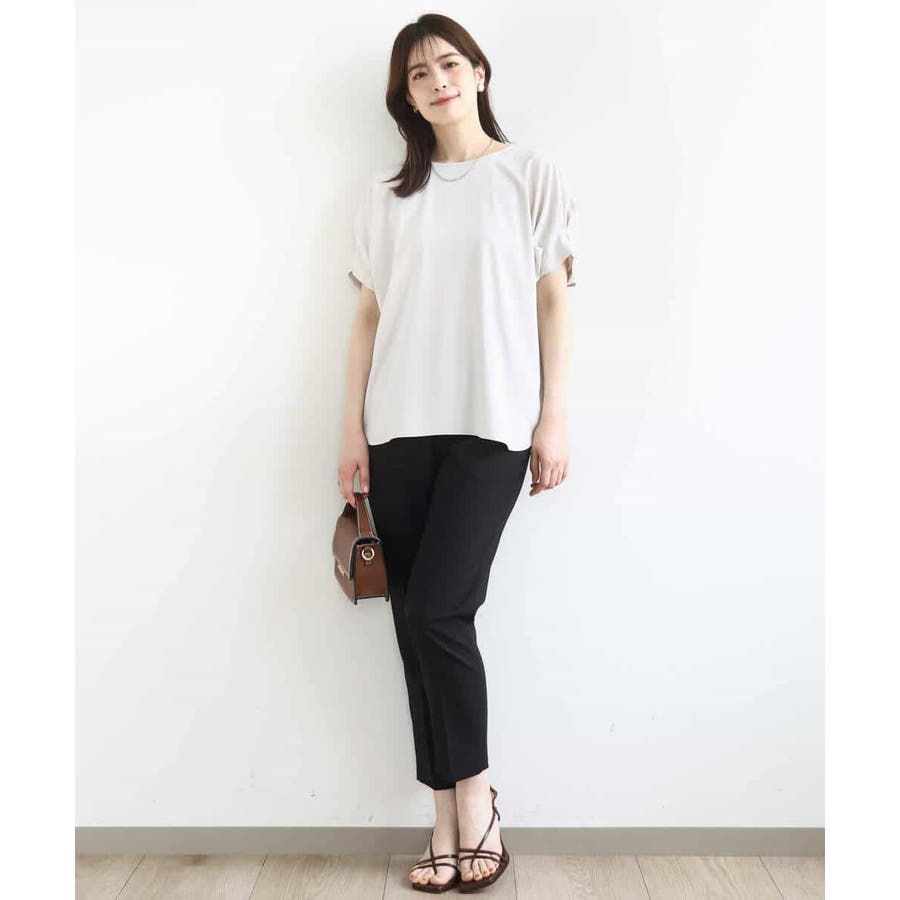 立体的なタックスリーブがデザインポイントのブラウス。顔周りがすっきりと見えるクルーネックデザインです。