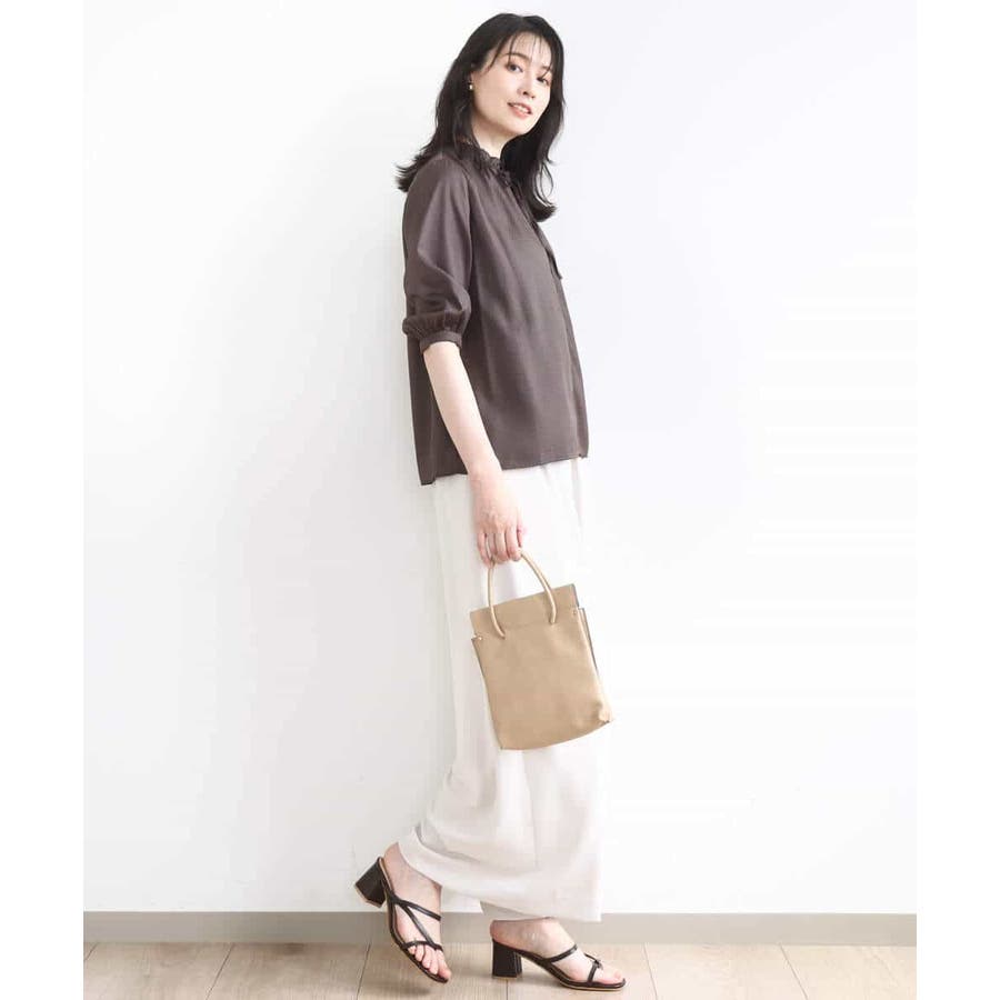 単品としてもジャケットのインナーとしても着こなせるブラウスは、さりげないドット柄がオフィスシーンにも馴染みます。同素材のスカートとセットアップでワンピース見えの着こなしもおすすめ。