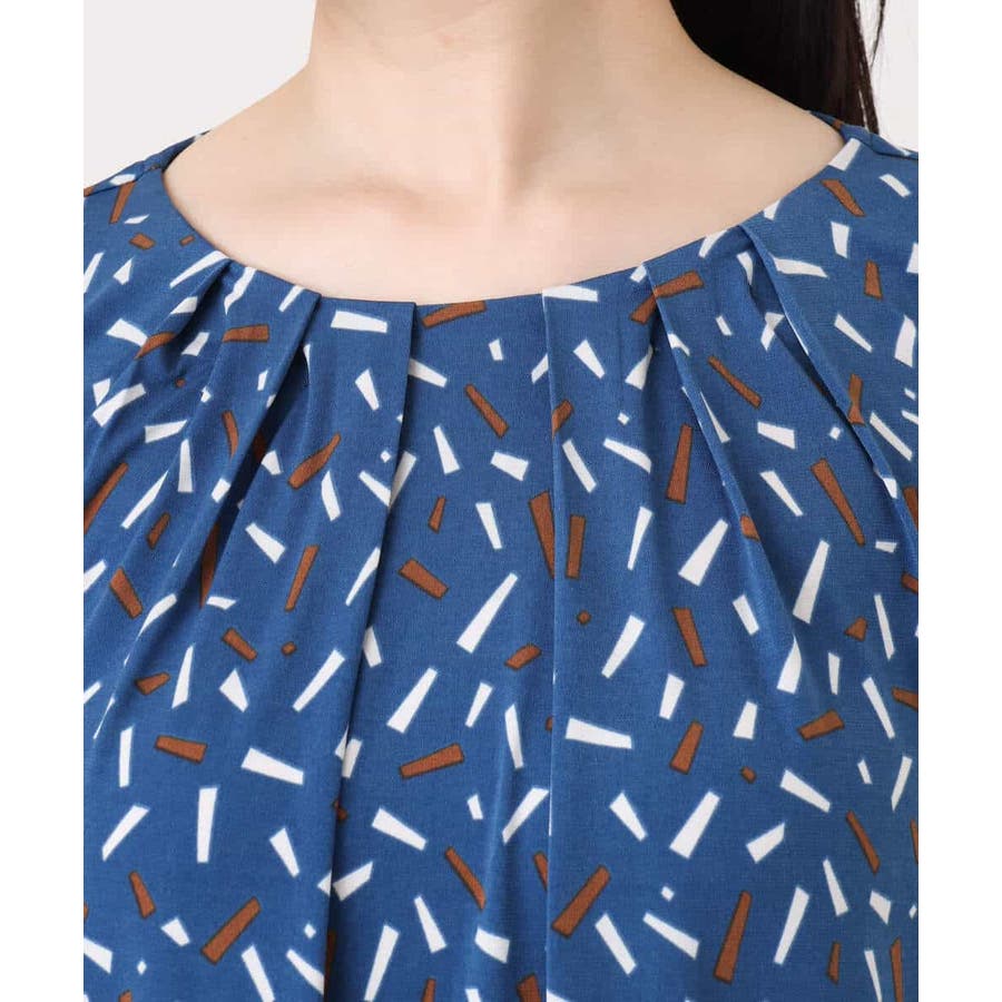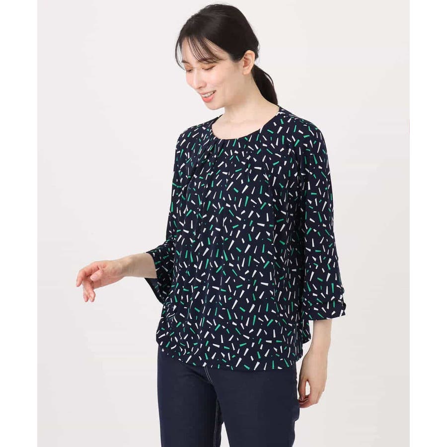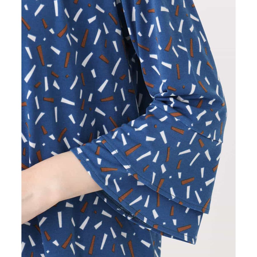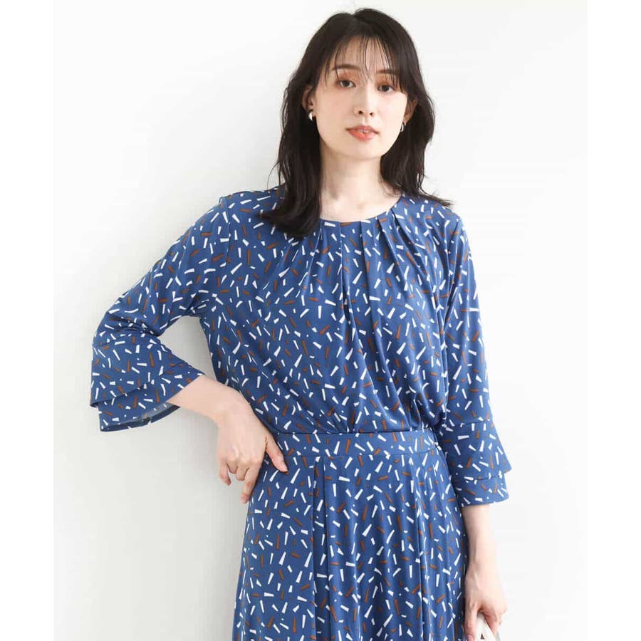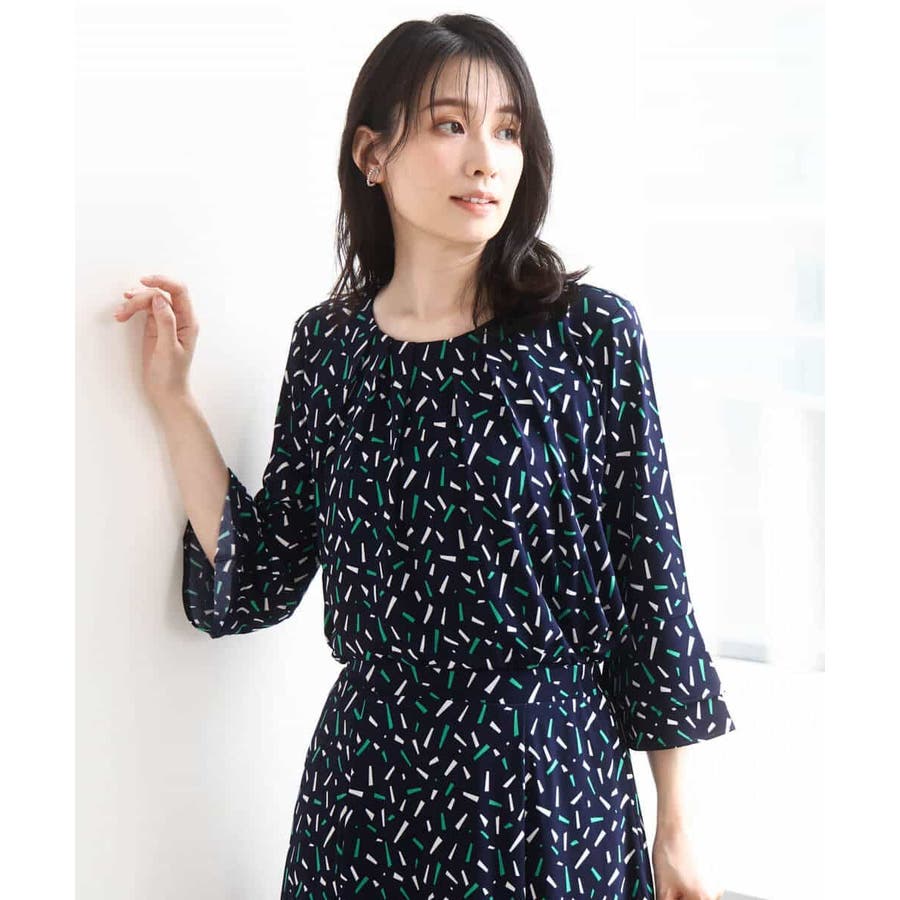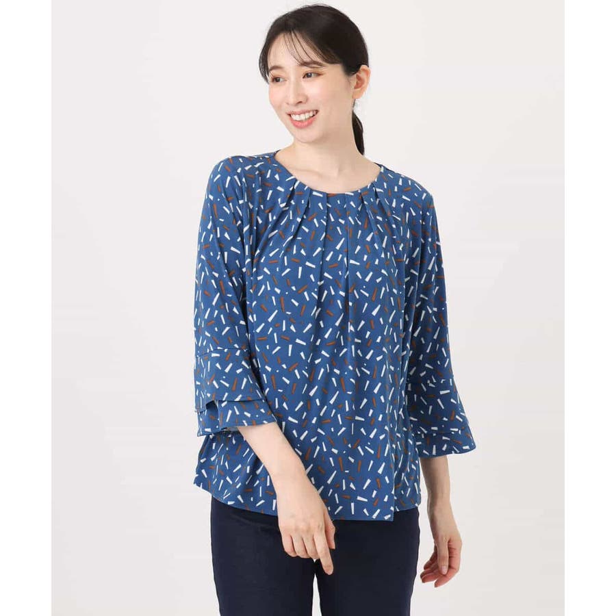 紙吹雪を散らしたような動きのある柄がきちんと見えの中にも華やかさのあるプリントブラウス。衿ぐりのタックと袖口の重ねたフレアーデザインが女性らしく着こなせます。