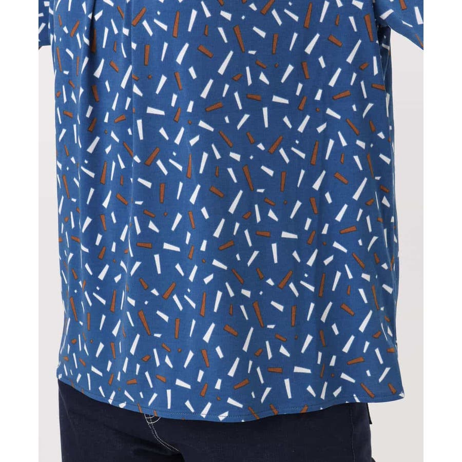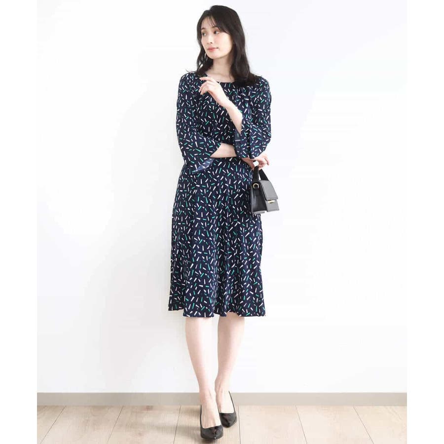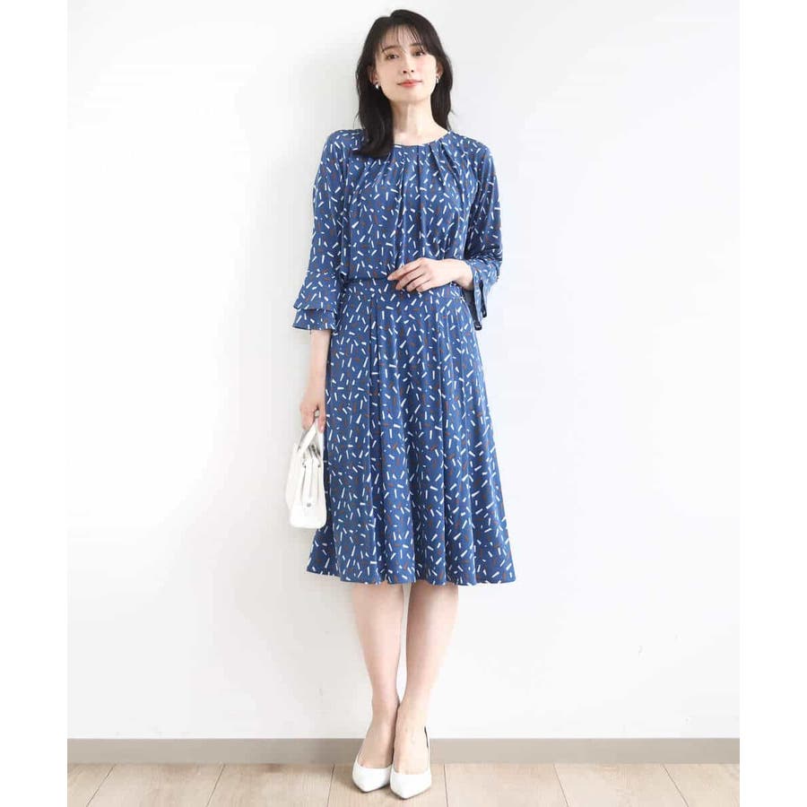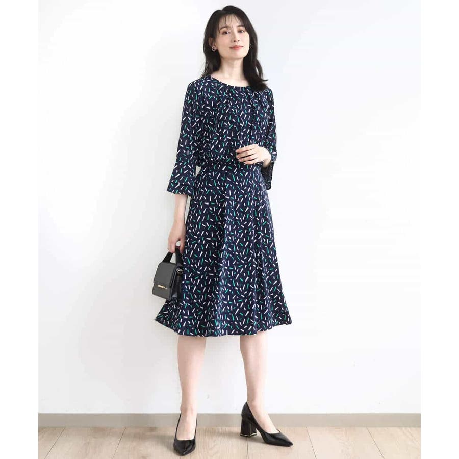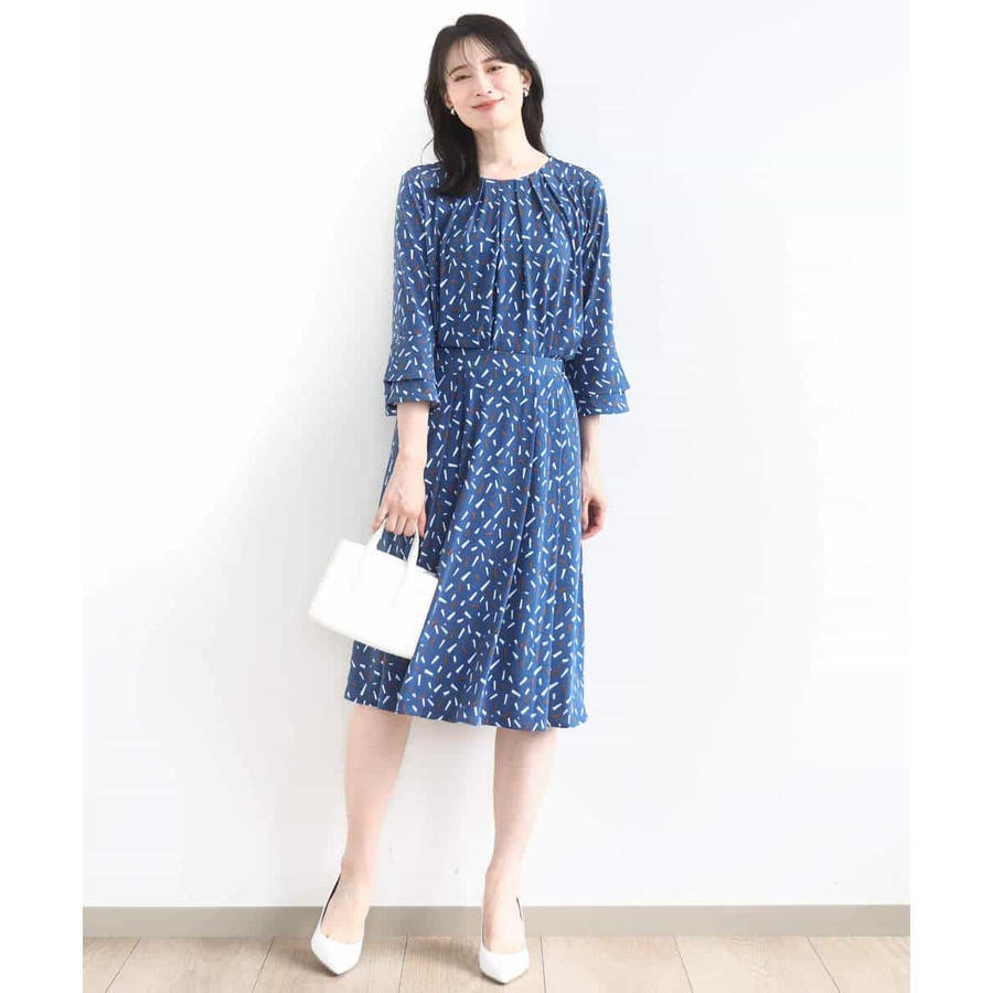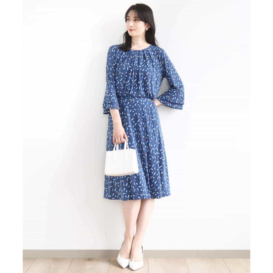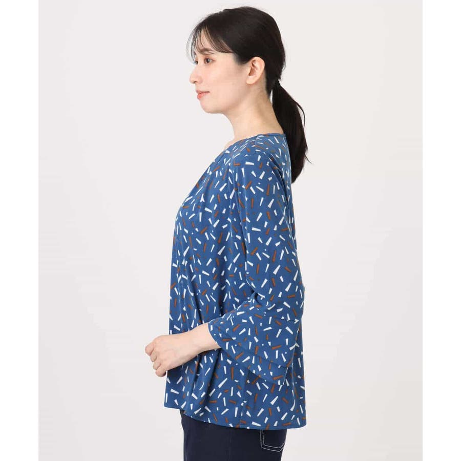紙吹雪を散らしたような動きのある柄がきちんと見えの中にも華やかさのあるプリントブラウス。衿ぐりのタックと袖口の重ねたフレアーデザインが女性らしく着こなせます。