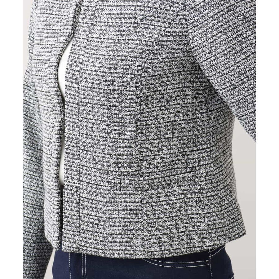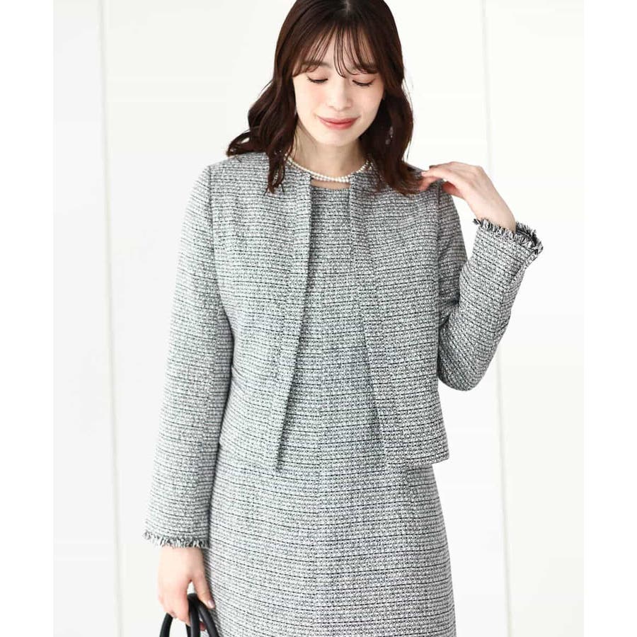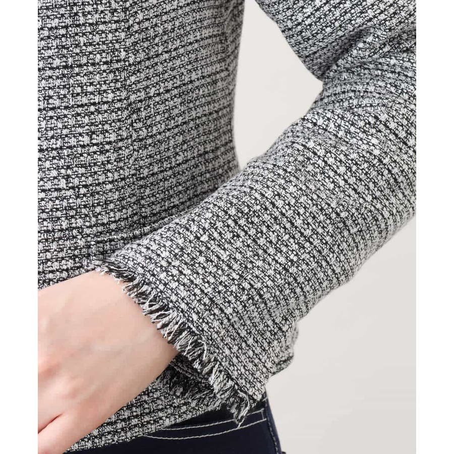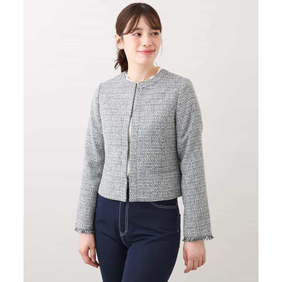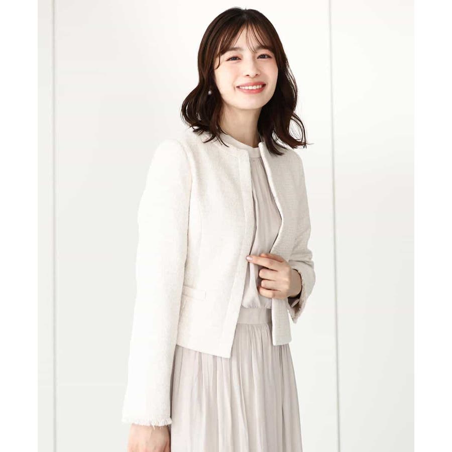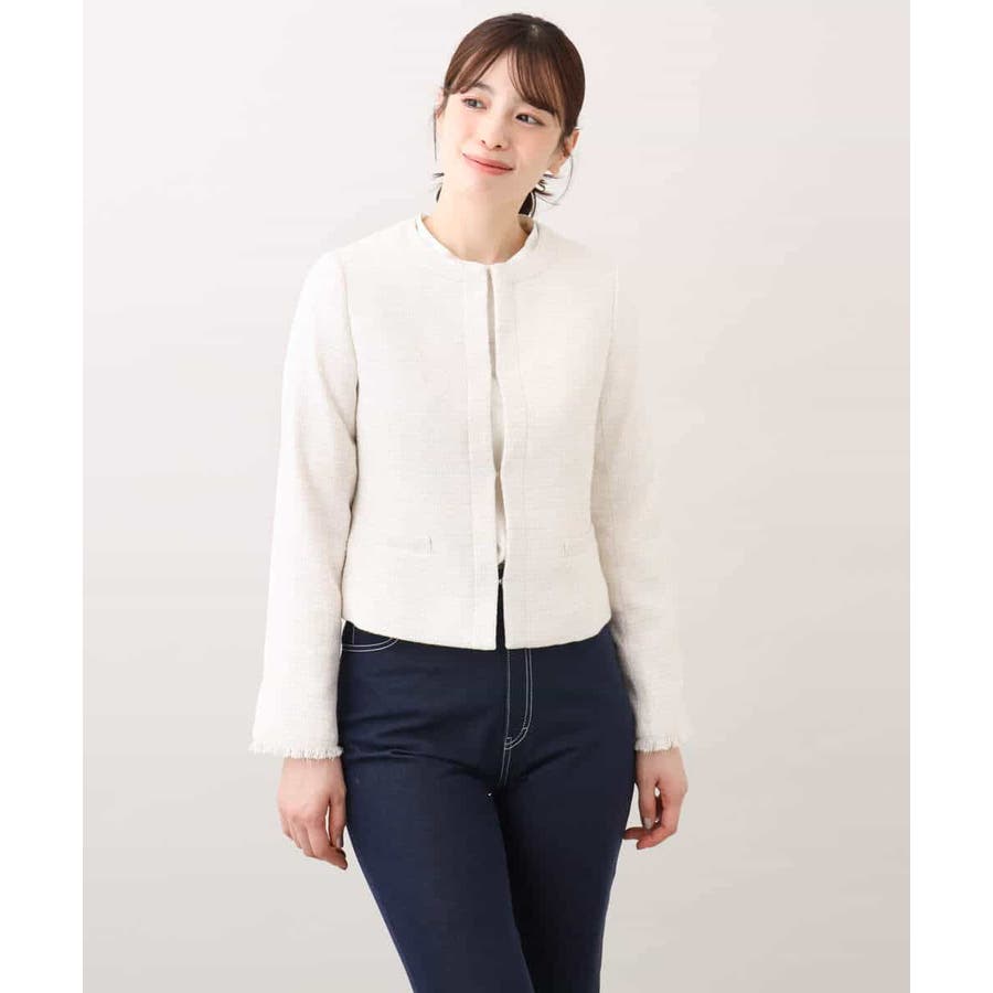 ほのかに光るラメ糸を織り込んだ品のある雰囲気が特徴のツイードジャケット。毎年人気のジャケットを今季は衿ぐりをタイトに旬なディティールにアップデート。コンパクトなショート丈にすっきりとしたノーカラー、表見えしないフロントフック仕様でさっと羽織れる感覚も魅力的です。スリットを施した袖口ラインはあえて抜け感のあるフリンジディテールでアクセントをプラス。