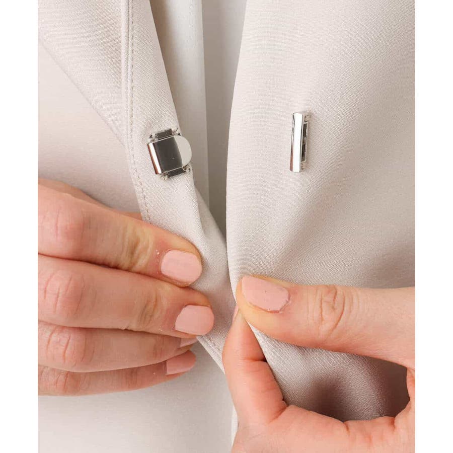着心地の良いベーシックなカラーレスジャケット。フロントのホック留めのシンプルなラウンドカラーがやわらかな印象です。フロントを留めるとスキッパーのように着用でき、かっちりしすぎないこなれ感がポイントに。