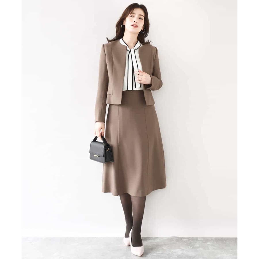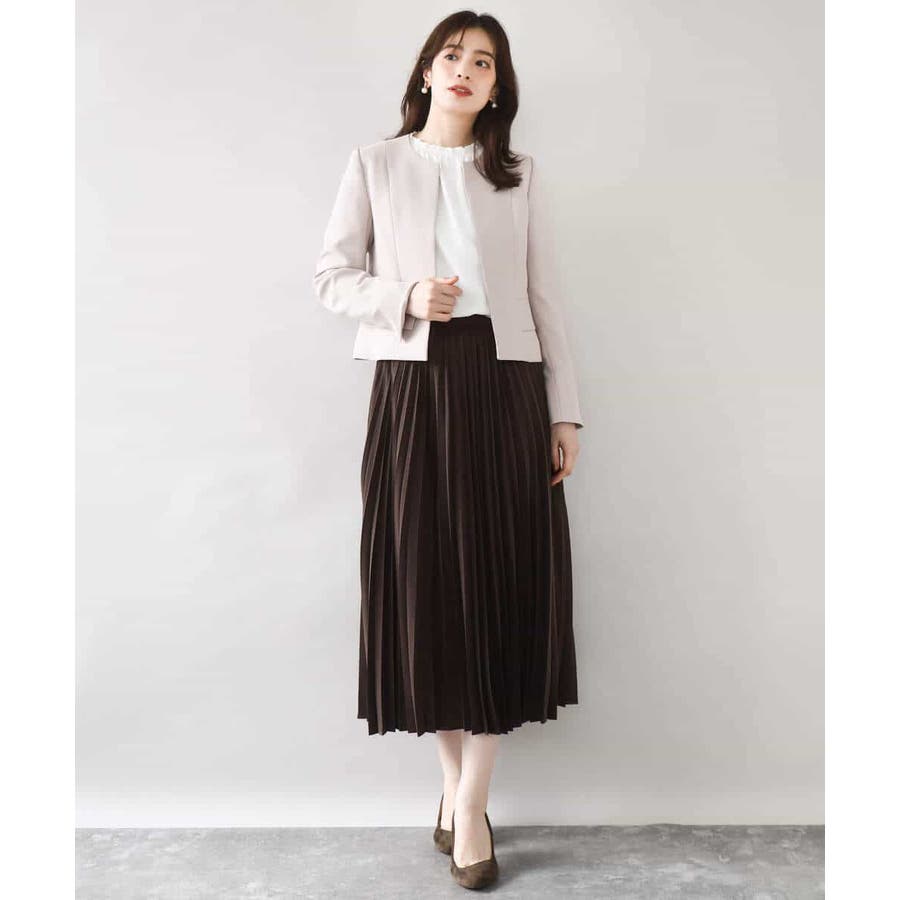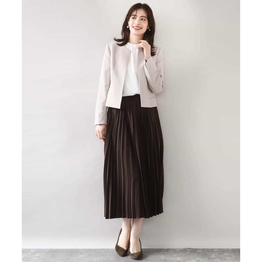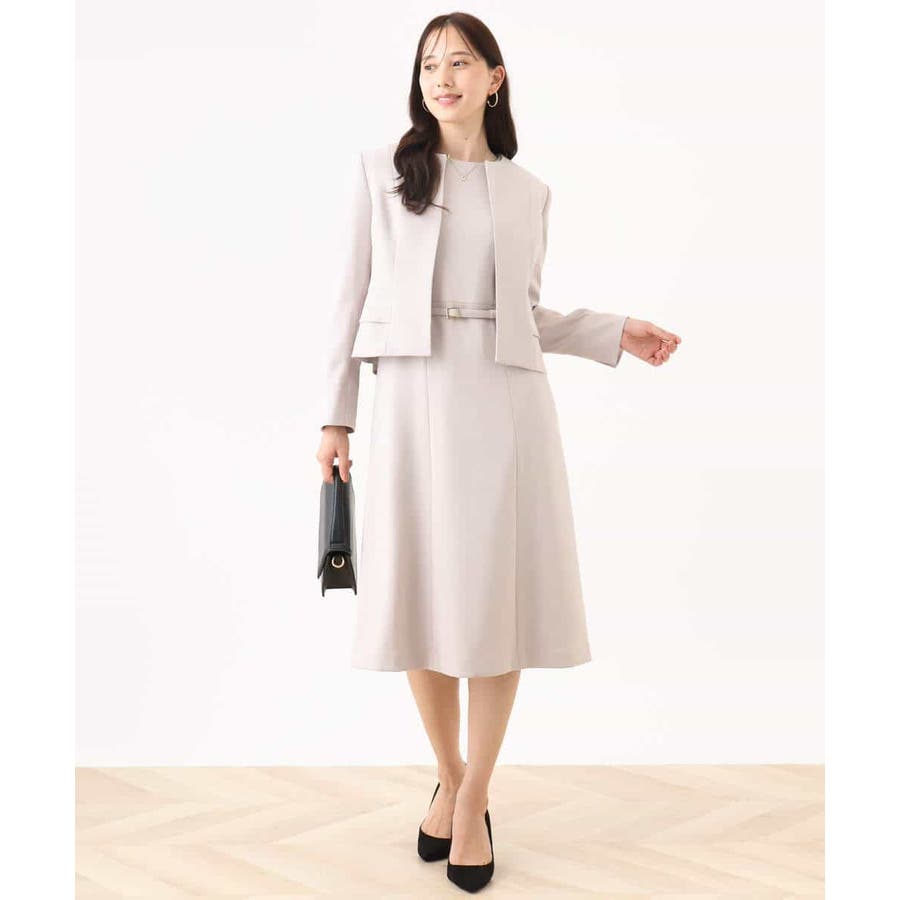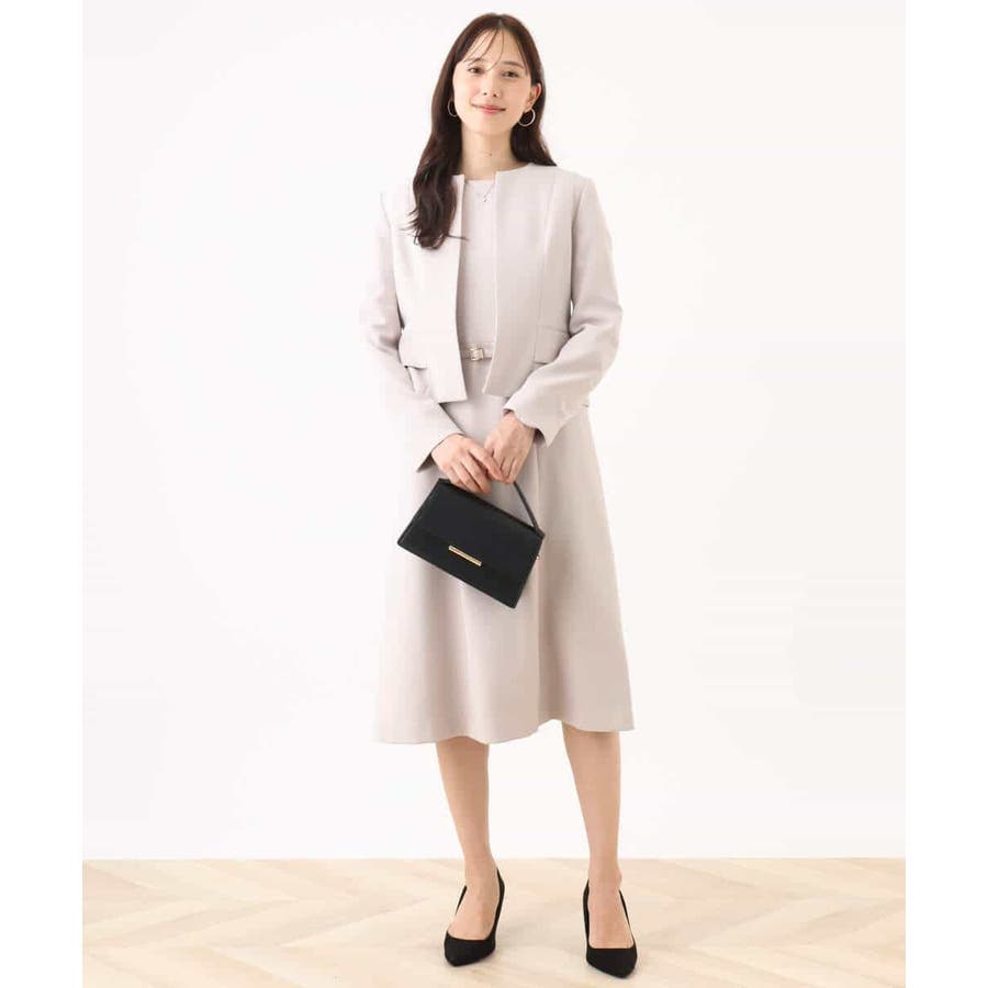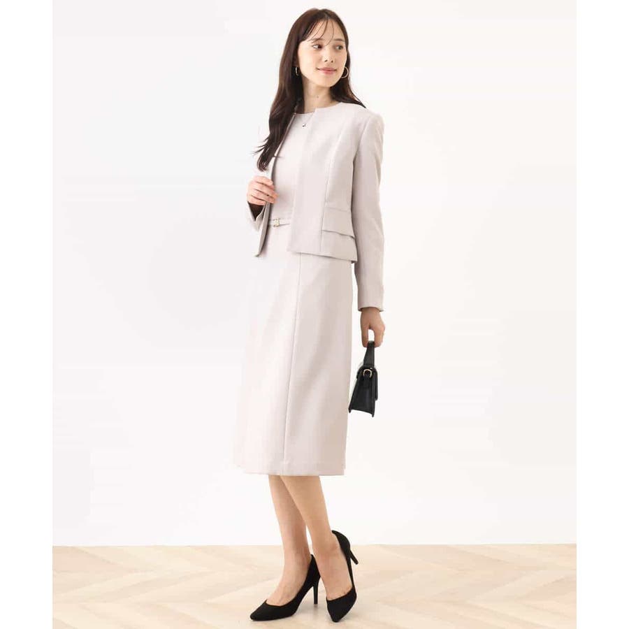 同素材でVネックのカラーレスジャケット、ワンピース、スカートをご用意しており、スーツセットアップとしても着用可能です。