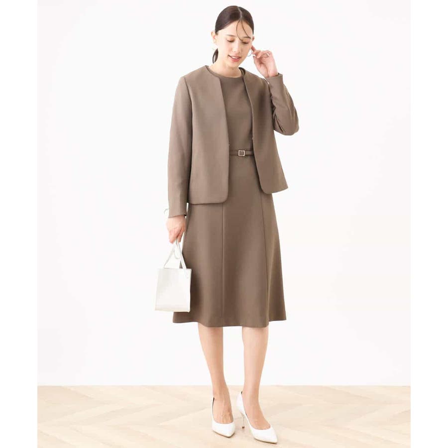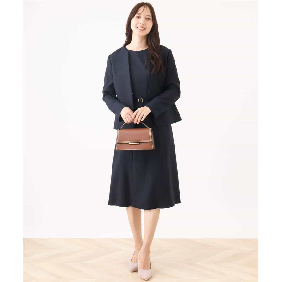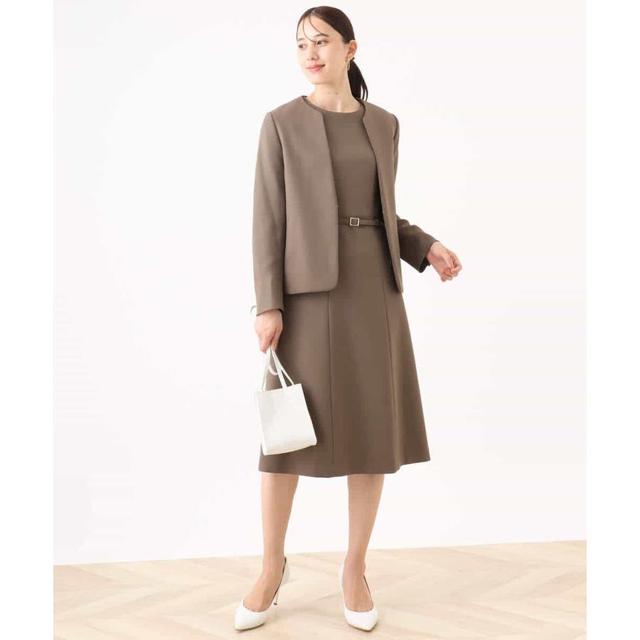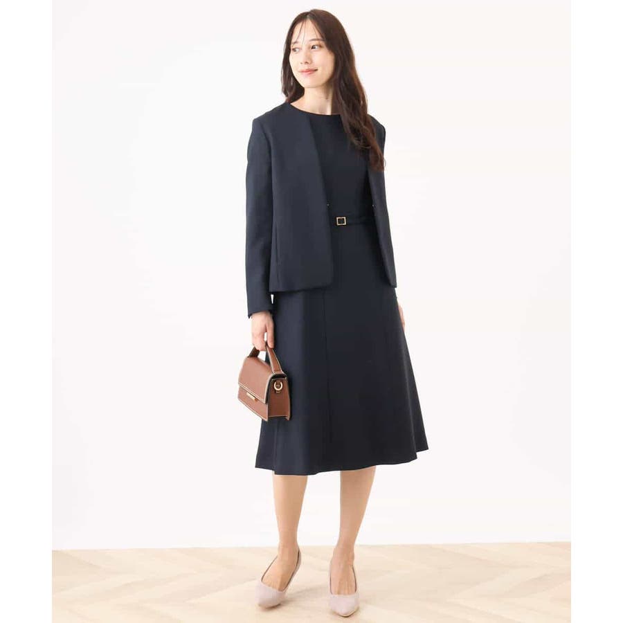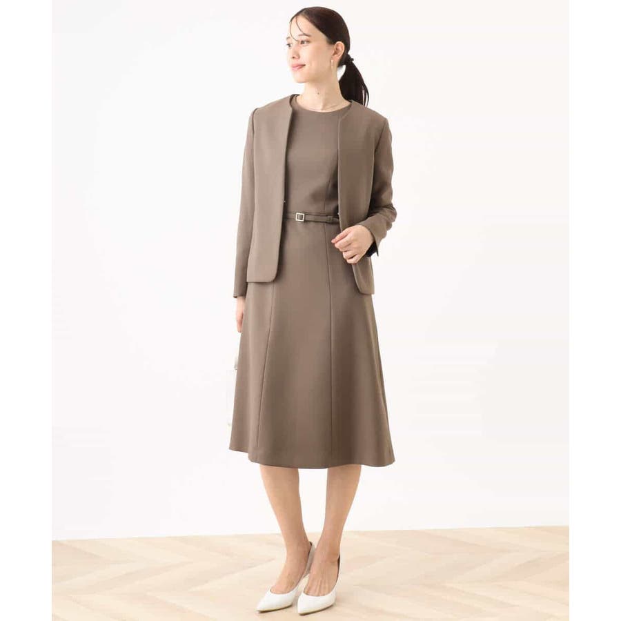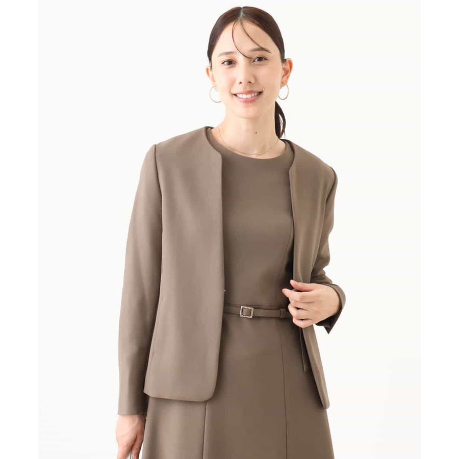 同素材で丸首のノーカラージャケット、ワンピース、スカートをご用意しており、スーツセットアップとしても着用可能です。