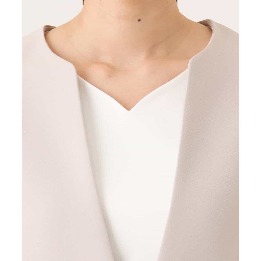シンプルなVネックのカラーレスジャケット。切り替えデザインが体のラインをきれいにすっきりと見せてくれます。フロントの留め具はホック仕様で、女性らしい印象に。