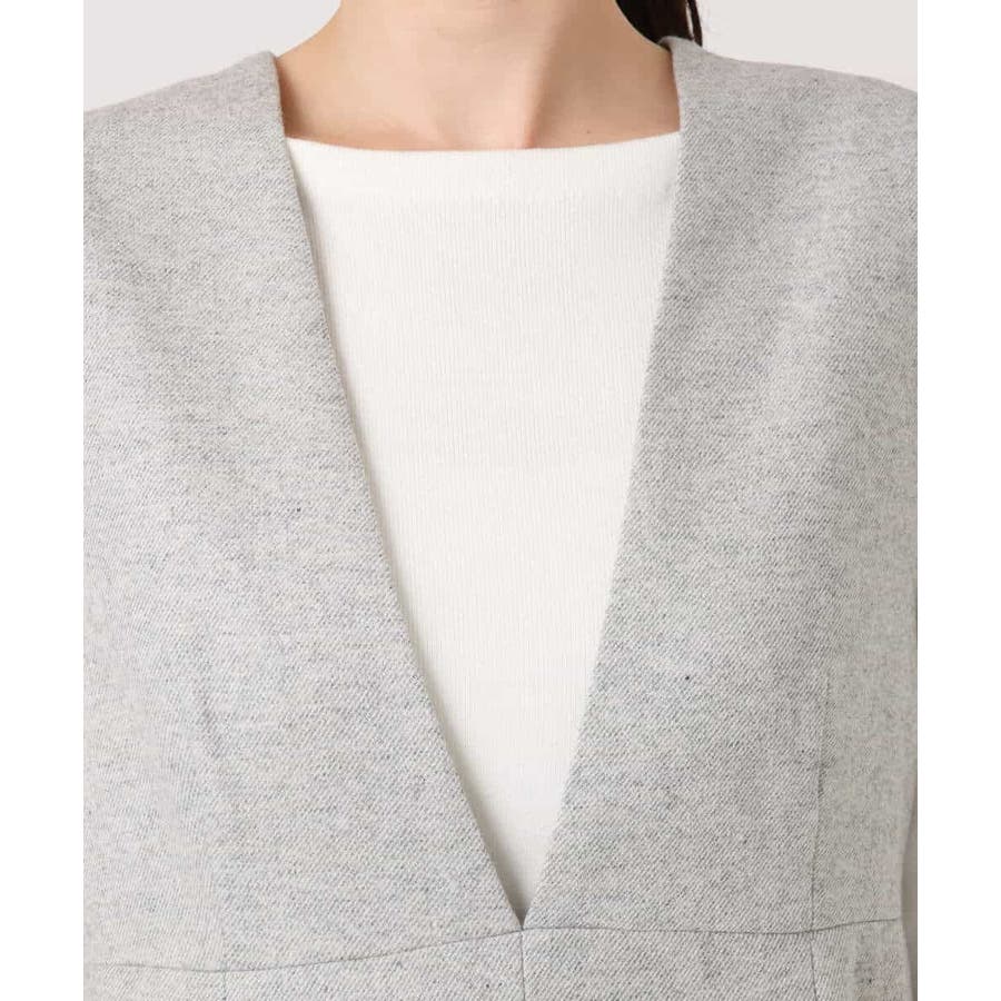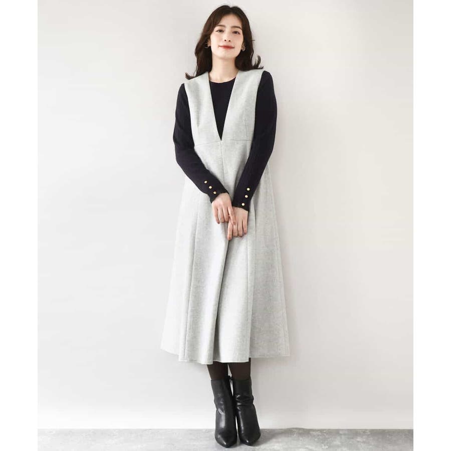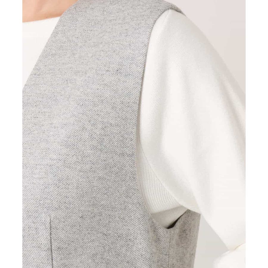 インナーには、ブラウス・カットソー・ニットと身頃がコンパクトなトップスであればどんなものでも相性良く着合わせられます。Vネックのデザインなので、合わせるインナーの衿ぐりは、タートルネックやボトルネックなど立ち衿のもの、もしくはボートネックやクルーネックなどの丸みのあるものがおすすめです。