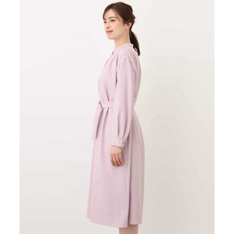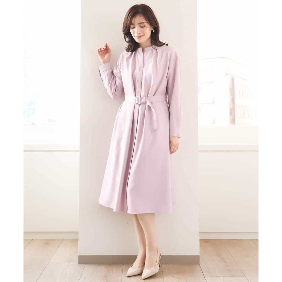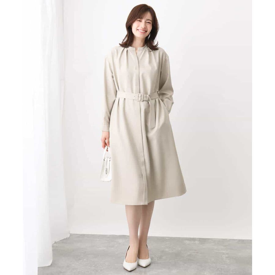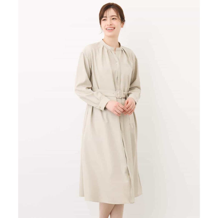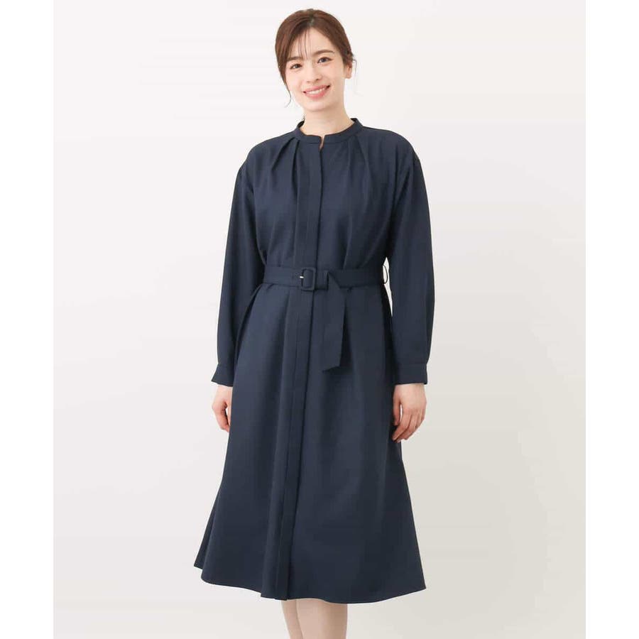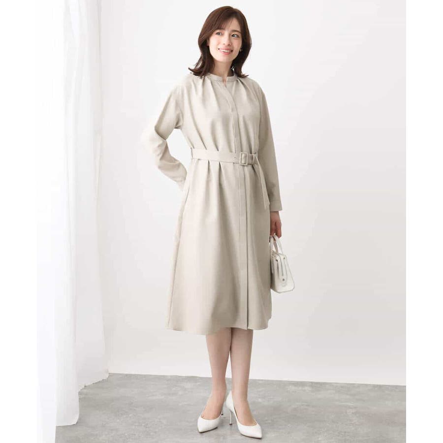比翼仕立てですっきりときれいな印象の前開きタイプのワンピース。ウエストをベルトでマークすると上品な印象で着こなせます。